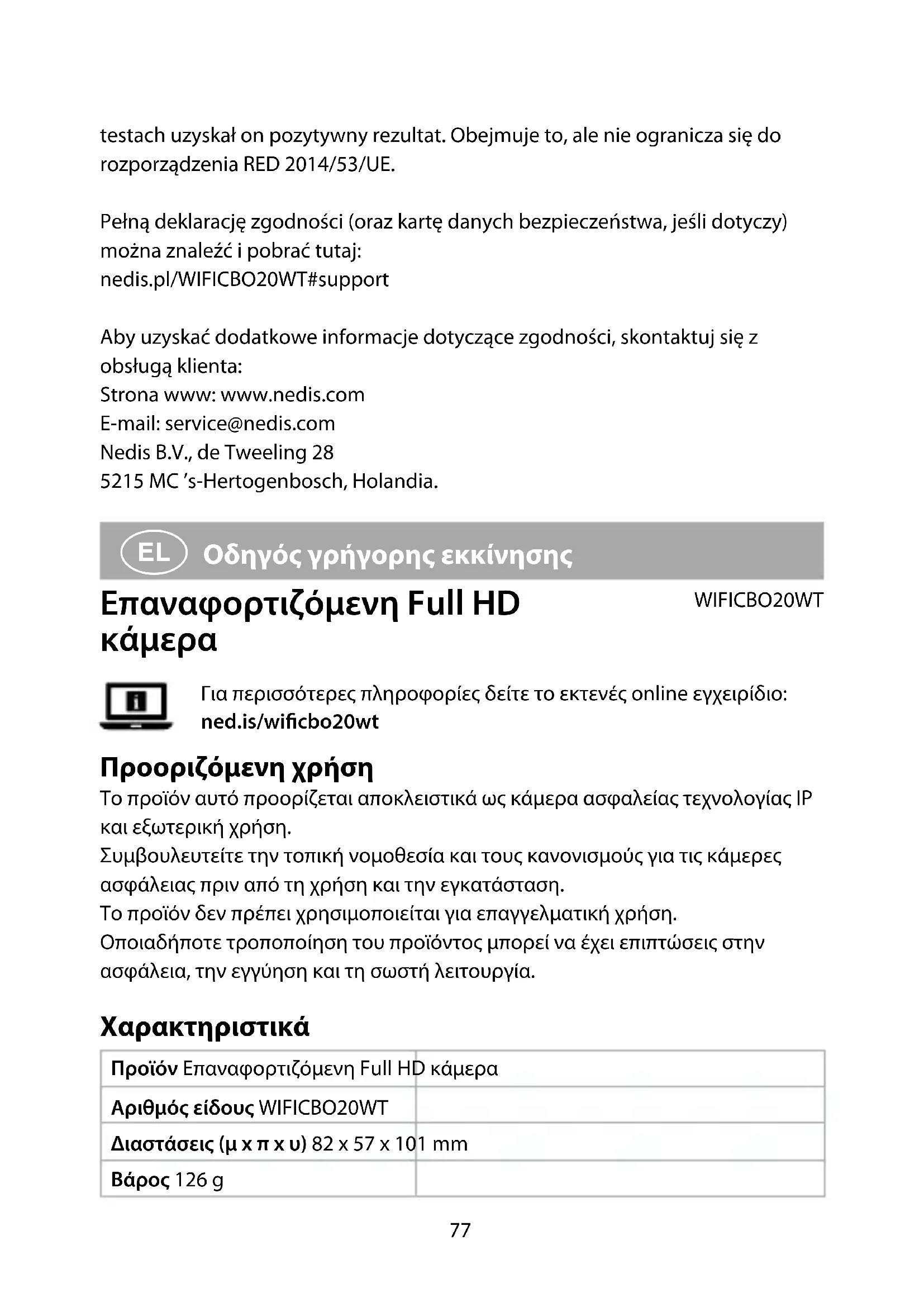 WIFICBO20WT Για περισσότερες πληροφορίες δείτε το εκτενές online εγχειρίδιο: ned.is/wicbo20wt Προοριζόμενη χρήση Το προϊόν αυτό προορίζεται αποκλειστικά ως κάμερα ασφαλείας τεχνολογίας IP και εξωτερική χρήση. Συμβουλευτείτε την τοπική νομοθεσία και τους κανονισμούς για τις κάμερες ασφάλειας πριν από τη χρήση και την εγκατάσταση. Το προϊόν δεν πρέπει χρησιμοποιείται για επαγγελματική χρήση. Οποιαδήποτε τροποποίηση του προϊόντος μπορεί να έχει επιπτώσεις στην ασφάλεια, την εγγύηση και τη σωστή λειτουργία. Χαρακτηριστικά Προϊόν Επαναφορτιζόμενη Full HD κάμερα Αριθμός είδους WIFICBO20WT Διαστάσεις (μ x π x υ) 82 x 57 x 101 mm Βάρος 126 g78 Μνήμη Κάρτα microSD: Έως 128 GB Αποθήκευση Cloud Ανάλυση 1920 px - 1080 px Ταχύτητα καρέ 15 fps Εγγραφή βίντεο Κουμπί ανίχνευση κίνησης Κωδικοποίηση βίντεο H.264 Γωνία προβολής 120 ° Αδιάβροχη IP65 Μέγ. ισχύ εκπομπής 16 dBm Κεραία με απολαβή 2 dBi Ασύρματες συνδέσεις Wi-Fi: 802.11 b/g/n 2,4 GHz Εμβέλεια συχνότητα Wi-Fi 2412 - 2472 MHz Θερμοκρασία αποθήκευσης -20 - 60 °C Θερμοκρασία λειτουργίας -20 - 55 °C Ισχύς εισόδου 5 VDC Εμβέλεια νυχτερινής όρασης 6 - 8 m Αισθητήρας εικόνας 2 MP 1/2.9” CMOS αισθητήρας Ενσωματωμένο μικρόφωνο - 38 dB Ενσωματωμένο ηχείο 8 Ω 1 W Είδος μπαταρίας 2 x 18650 (Li-ion) Κύρια μέρη (εικόνα A) 1 Βραχίονας