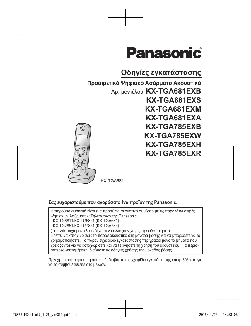 KX-TGA681EXB KX-TGA681EXS KX-TGA681EXM KX-TGA681EXA KX-TGA785EXB KX-TGA785EXW KX-TGA785EXH KX-TGA785EXR KX-TGA681 Σας ευχαριστούμε που αγοράσατε ένα προϊόν της Panasonic. Η παρούσα συσκευή είναι ένα πρόσθετο ακουστικό συμβατό με τις παρακάτω σειρές Ψηφιακών Ασύρματων Τηλεφώνων της Panasonic: - KX-TG6811/KX-TG6821 (KX-TGA681) - KX-TG7851/KX-TG7861 (KX-TGA785) (Τα αντίστοιχα μοντέλα ενδέχεται να αλλάξουν χωρίς προειδοποίηση.) Πρέπει να καταχωρίσετε το παρόν ακουστικό στη μονάδα βάσης για να μπορέσετε να το χρησιμοποιήσετε. Το παρόν εγχειρίδιο εγκατάστασης περιγράφει μόνο τα βήματα που χρειάζονται για να καταχωρίσετε και να ξεκινήσετε τη χρήση του ακουστικού. Για περισσότερες λεπτομέρειες, διαβάστε τις οδηγίες χρήσης της μονάδας βάσης. Πριν χρησιμοποιήσετε τη συσκευή, διαβάστε το εγχειρίδιο εγκατάστασης και φυλάξτε το για να το συμβουλευθείτε στο μέλλον. TGA681EX(el-el)_1128_ver311.pdf
