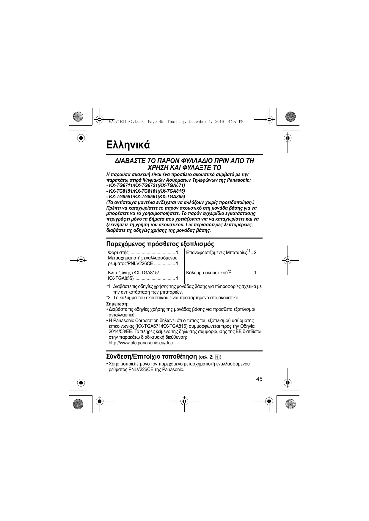 - Η Panasonic Corporation δηλώνει ότι ο τύπος του εξοπλισμού ασύρματης επικοινωνίας (KX-TGA671/KX-TGA815) συμμορφώνεται προς την Οδηγία 2014/53/ΕΕ. Το πλήρες κείμενο της δήλωσης συμμόρφωσης της ΕΕ διατίθεται στην παρακάτω διαδικτυακή διεύθυνση: http://www.ptc.panasonic.eu/doc Σύνδεση/Επιτοίχια τοποθέτηση (σελ. 2: 1)