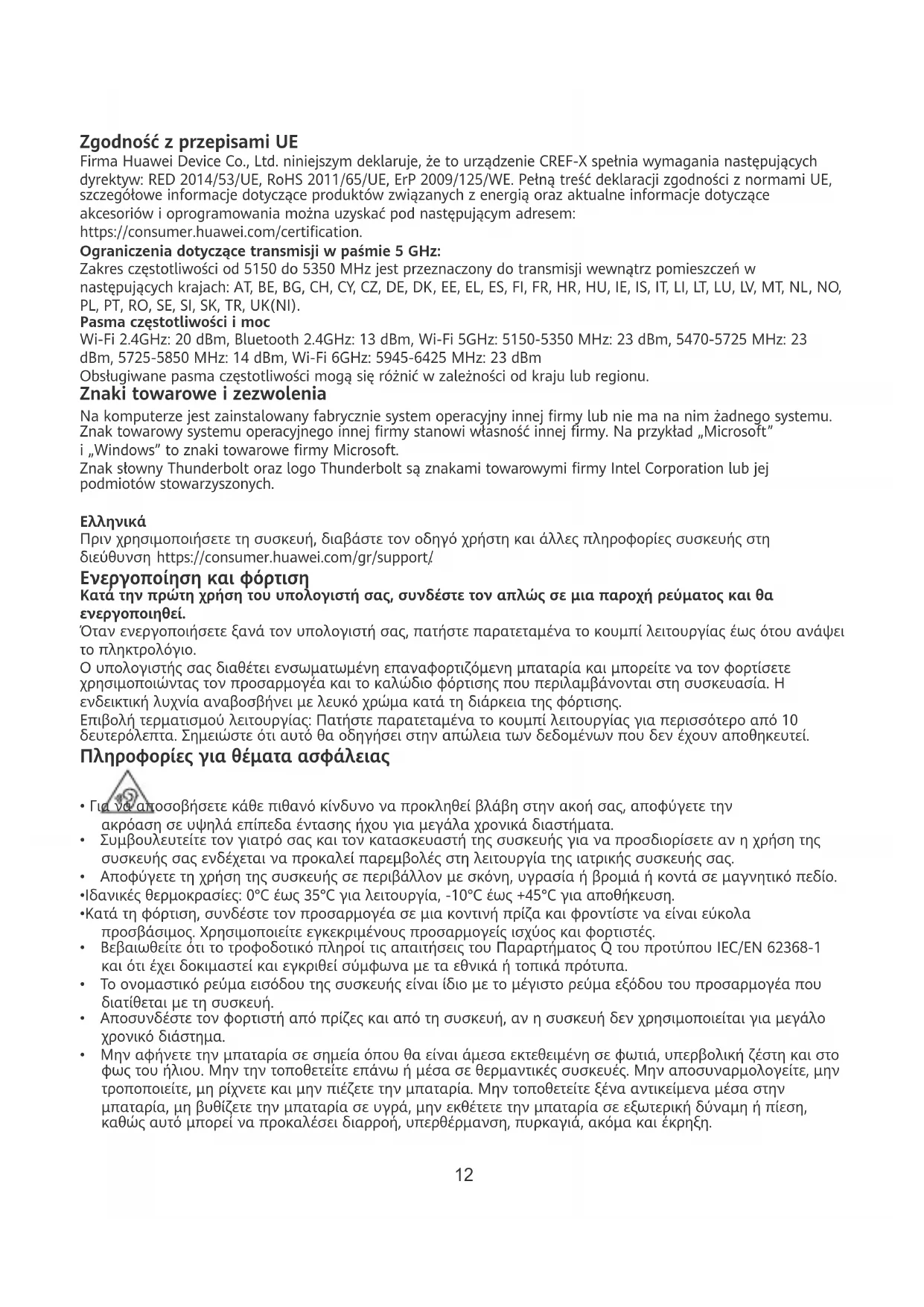 Ζώνες συχνοτήτων και ισχύς Wi-Fi 2.4GHz: 20 dBm, Bluetooth 2.4GHz: 13 dBm, Wi-Fi 5GHz: 5150-5350 MHz: 23 dBm, 5470-5725 MHz: 23 dBm, 5725-5850 MHz: 14 dBm, Wi-Fi 6GHz: 5945-6425 MHz: 23 dBm Οι υποστηριζόμενες ζώνες συχνοτήτων μπορεί να διαφέρουν ανά χώρα ή περιοχή. Εμπορικά σήματα και άδειες Στον υπολογιστή υπάρχει προεγκατεστημένο ένα λειτουργικό σύστημα τρίτων ή δεν υπάρχει κανένα προεγκατεστημένο σύστημα. Το εμπορικό σήμα του λειτουργικού συστήματος τρίτων ανήκει στα τρίτα μέρη. Για παράδειγμα, οι λέξεις «Microsoft» και «Windows» είναι εμπορικά σήματα της Microsoft. Η επωνυμία Thunderbolt και το λογότυπο Thunderbolt είναι σήματα κατατεθέντα της Intel Corporation ή των θυγατρικών της. Čeština Před použitím zařízení si prohlédněte uživatelskou příručku a další informace o zařízení na adrese https://consumer.huawei.com/cz/support/