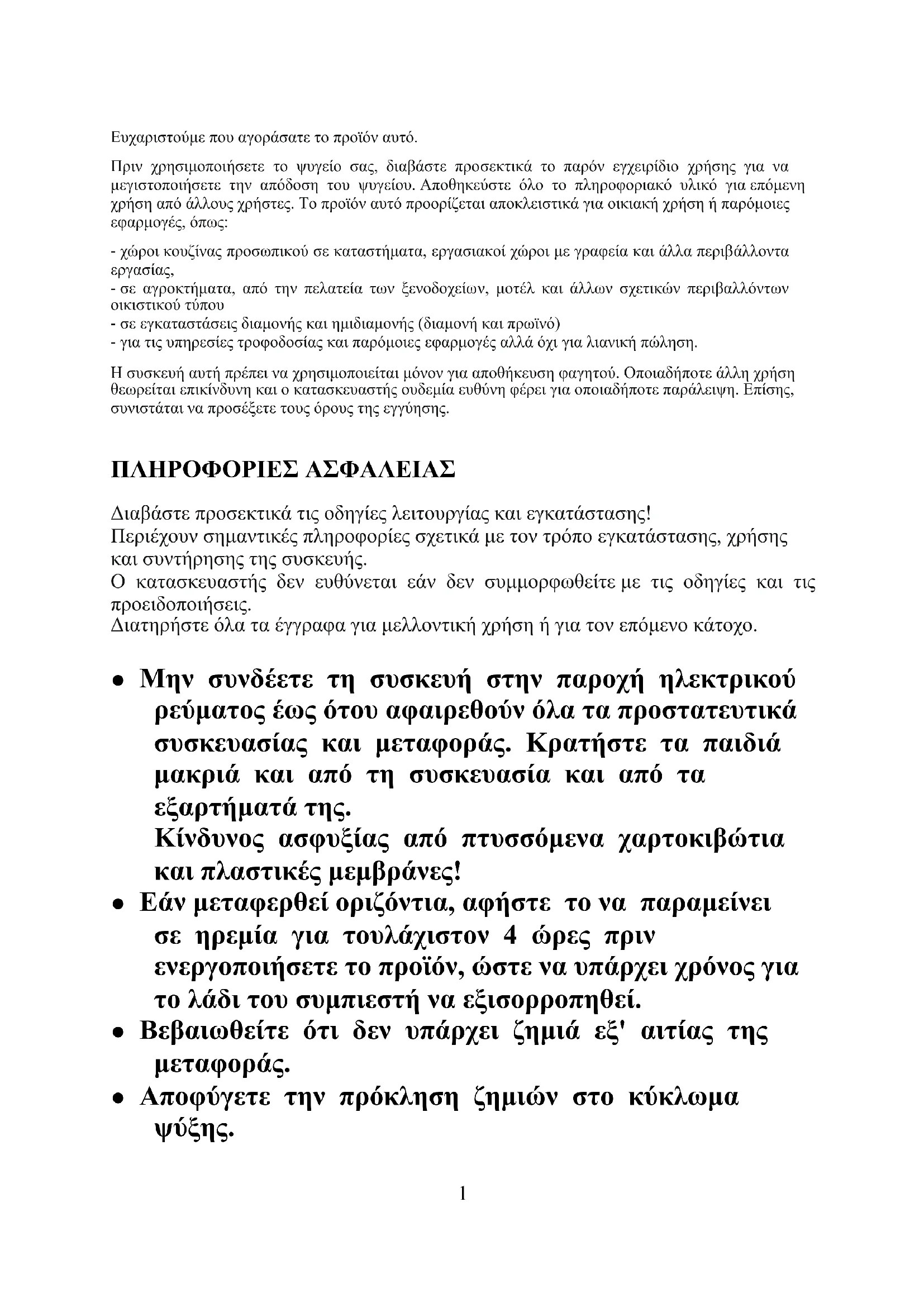 - σε αγροκτήματα, από την πελατεία των ξενοδοχείων, μοτέλ και άλλων σχετικών περιβαλλόντων οικιστικού τύπου - σε εγκαταστάσεις διαμονής και ημιδιαμονής (διαμονή και πρωϊνό) - για τις υπηρεσίες τροφοδοσίας και παρόμοιες εφαρμογές αλλά όχι για λιανική πώληση. Η συσκευή αυτή πρέπει να χρησιμοποιείται μόνον για αποθήκευση φαγητού. Οποιαδήποτε άλλη χρήση θεωρείται επικίνδυνη και ο κατασκευαστής ουδεμία ευθύνη φέρει για οποιαδήποτε παράλειψη. Επίσης, συνιστάται να προσέξετε τους όρους της εγγύησης. ΠΛΗΡΟΦΟΡΙΕΣ ΑΣΦΑΛΕΙΑΣ Διαβάστε προσεκτικά τις οδηγίες λειτουργίας και εγκατάστασης! Περιέχουν σημαντικές πληροφορίες σχετικά με τον τρόπο εγκατάστασης, χρήσης και συντήρησης της συσκευής. Ο κατασκευαστής δεν ευθύνεται εάν δεν συμμορφωθείτε με τις οδηγίες και τις προειδοποιήσεις. Διατηρήστε όλα τα έγγραφα για μελλοντική χρήση ή για τον επόμενο κάτοχο. ● Μην συνδέετε τη συσκευή στην παροχή ηλεκτρικού ρεύματος έως ότου αφαιρεθούν όλα τα προστατευτικά συσκευασίας και μεταφοράς. Κρατήστε τα παιδιά μακριά και από τη συσκευασία και από τα εξαρτήματά της. Κίνδυνος ασφυξίας από πτυσσόμενα χαρτοκιβώτια και πλαστικές μεμβράνες! ● Εάν μεταφερθεί οριζόντια, αφήστε το να παραμείνει σε ηρεμία για τουλάχιστον 4 ώρες πριν ενεργοποιήσετε το προϊόν, ώστε να υπάρχει χρόνος για το λάδι του συμπιεστή να εξισορροπηθεί. ● Βεβαιωθείτε ότι δεν υπάρχει ζημιά εξ' αιτίας της