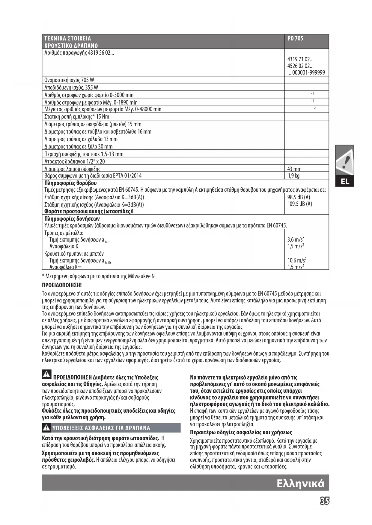 - Μετρημένη σύμφωνα με το πρότυπο της Milwaukee N ΠΡΟEIΔΟΠΟIΗΣΗ! Το αναφερόμενο σ’ αυτές τις οδηγίες επίπεδο δονήσεων έχει μετρηθεί με μια τυποποιημένη σύμφωνα με το EN 60745 μέθοδο μέτρησης και μπορεί να χρησιμοποιηθεί για τη σύγκριση των ηλεκτρικών εργαλείων μεταξύ τους. Αυτό είναι επίσης κατάλληλο για μια προσωρινή εκτίμηση της επιβάρυνση των δονήσεων. Το αναφερόμενο επίπεδο δονήσεων αντιπροσωπεύει τις κύριες χρήσεις του ηλεκτρικού εργαλείου. Εάν όμως το ηλεκτρικό χρησιμοποιείται σε άλλες χρήσεις, με διαφορετικά εργαλεία εφαρμογής ή ανεπαρκή συντήρηση, μπορεί να υπάρξει απόκλιση του επιπέδου δονήσεων. Αυτό μπορεί να αυξήσει σημαντικά την επιβάρυνση των δονήσεων για τη συνολική διάρκεια της εργασίας Για μια ακριβή εκτίμηση της επιβάρυνσης των δονήσεων οφείλουν επίσης να λαμβάνονται υπόψη οι χρόνοι, στους οποίους η συσκευή είναι απενεργοποιημένη ή είναι μεν ενεργοποιημένη αλλά δεν χρησιμοποιείται πραγματικά. Αυτό μπορεί να μειώσει σημαντικά την επιβάρυνση των δονήσεων για τη συνολική διάρκεια της εργασίας. Καθορίζετε πρόσθετα μέτρα ασφαλείας για την προστασία του χειριστή από την επίδραση των δονήσεων όπως για παράδειγμα: Συντήρηση του ηλεκτρικού εργαλείου και των εργαλείων εφαρμογής, διατηρείτε ζεστά τα χέρια, οργάνωση των διαδικασιών εργασίας. ΠΡΟEIΔΟΠΟIΗΣΗ Διαβάστε όλες τις Υποδεξεις ασφαλείας και τις Οδηγίες. Αμέλειες κατά την τήρηση των προειδοποιητικών υποδείξεων μπορεί να προκαλέσουν ηλεκτροπληξία, κίνδυνο πυρκαγιάς ή/και σοβαρούς τραυματισμούς. Φυλάξτε όλες τις προειδοποιητικές υποδείξεις και οδηγίες για κάθε μελλοντική χρήση. ΥΠΟΔΕΙΞΕΙΣ ΑΣΦΑΛΕΙΑΣ ΓΙΑ ΔΡΑΠΑΝΑ Κατά την κρουστική διάτρηση φοράτε ωτοασπίδες. Η επίδραση του θορύβου μπορεί να προκαλέσει απώλεια ακοής. Χρησιμοποιείτε με τη συσκευή τις προμηθευόμενες πρόσθετες χειρολαβές. Η απώλεια ελέγχου μπορεί να οδηγήσει σε τραυματισμό. Να πιάνετε το ηλεκτρικό εργαλείο μόνο από τις προβλεπόμενες γι’ αυτό το σκοπό μονωμένες επιφάνειές του, όταν εκτελείτε εργασίες στις οποίες υπάρχει κίνδυνος το εργαλείο που χρησιμοποιείτε να συναντήσει ηλεκτροφόρους αγωγούς ή το δικό του ηλεκτρικό καλώδιο. Η επαφή των κοπτικών εργαλείων με αγωγό τροφοδοσίας τάσης μπορεί να θέσει τα μεταλλικά τμήματα της συσκευής υπ΄οτάση και να προκαλέσει ηελκτροπληξία. Περαιτέρω οδηγίες ασφαλείας και χρήσεως Χρησιμοποιείτε προστατευτικό εξοπλισμό. Κατά την εργασία με τη μηχανή φοράτε πάντα προστατευτικά γυαλιά. Συνιστούμε επίσης προστατευτική ενδυμασία όπως επίσης μάσκα προστασίας αναπνοής, προστατευτικά γάντια, σταθερά και ασφαλή στην ολίσθηση υποδήματα, κράνος και ωτοασπίδες.