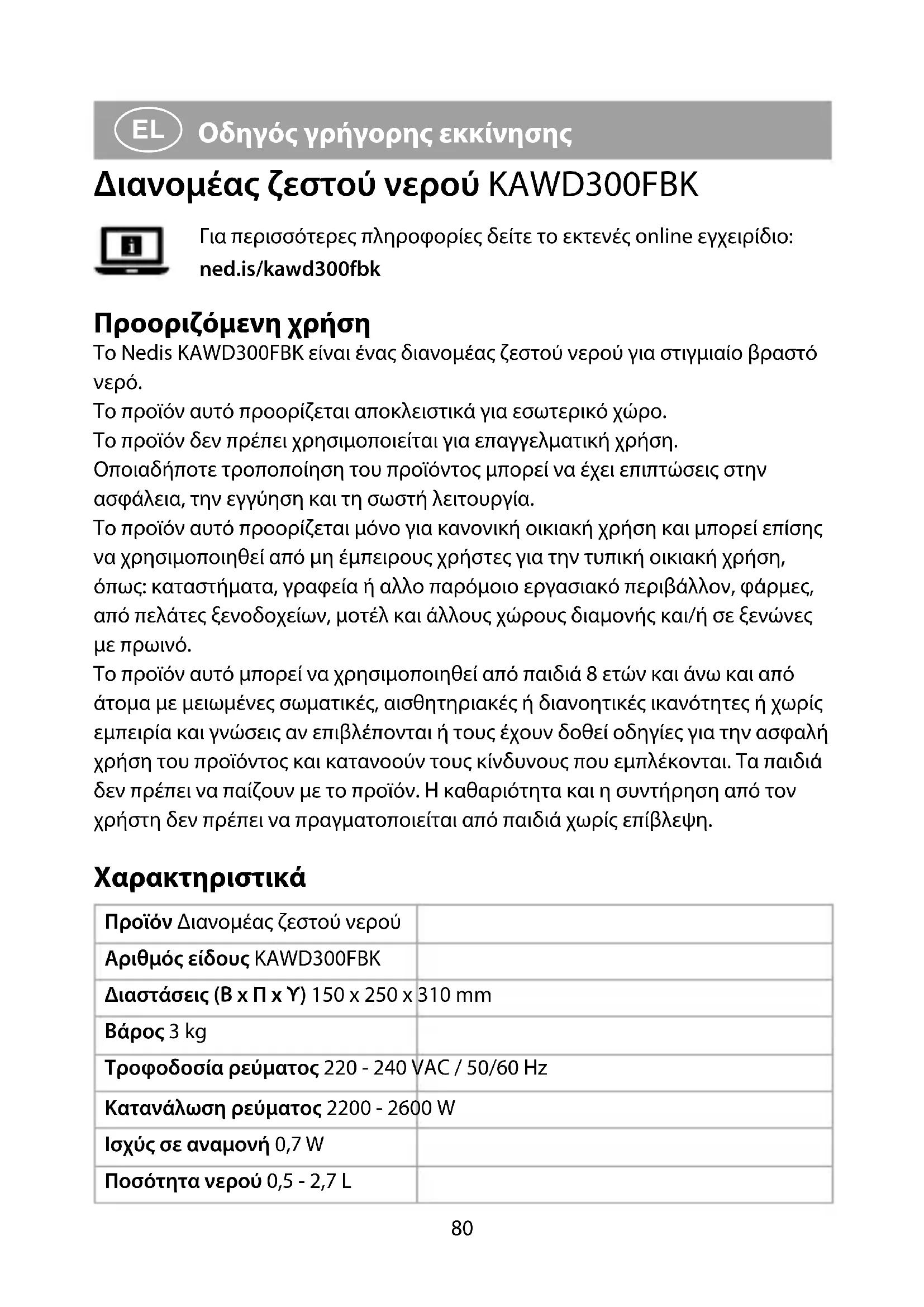 Οδηγός γρήγορης εκκίνησης Διανομέας ζεστού νερού KAWD300FBK Για περισσότερες πληροφορίες δείτε το εκτενές online εγχειρίδιο: ned.is/kawd300fbk Προοριζόμενη χρήση Το Nedis KAWD300FBK είναι ένας διανομέας ζεστού νερού για στιγμιαίο βραστό