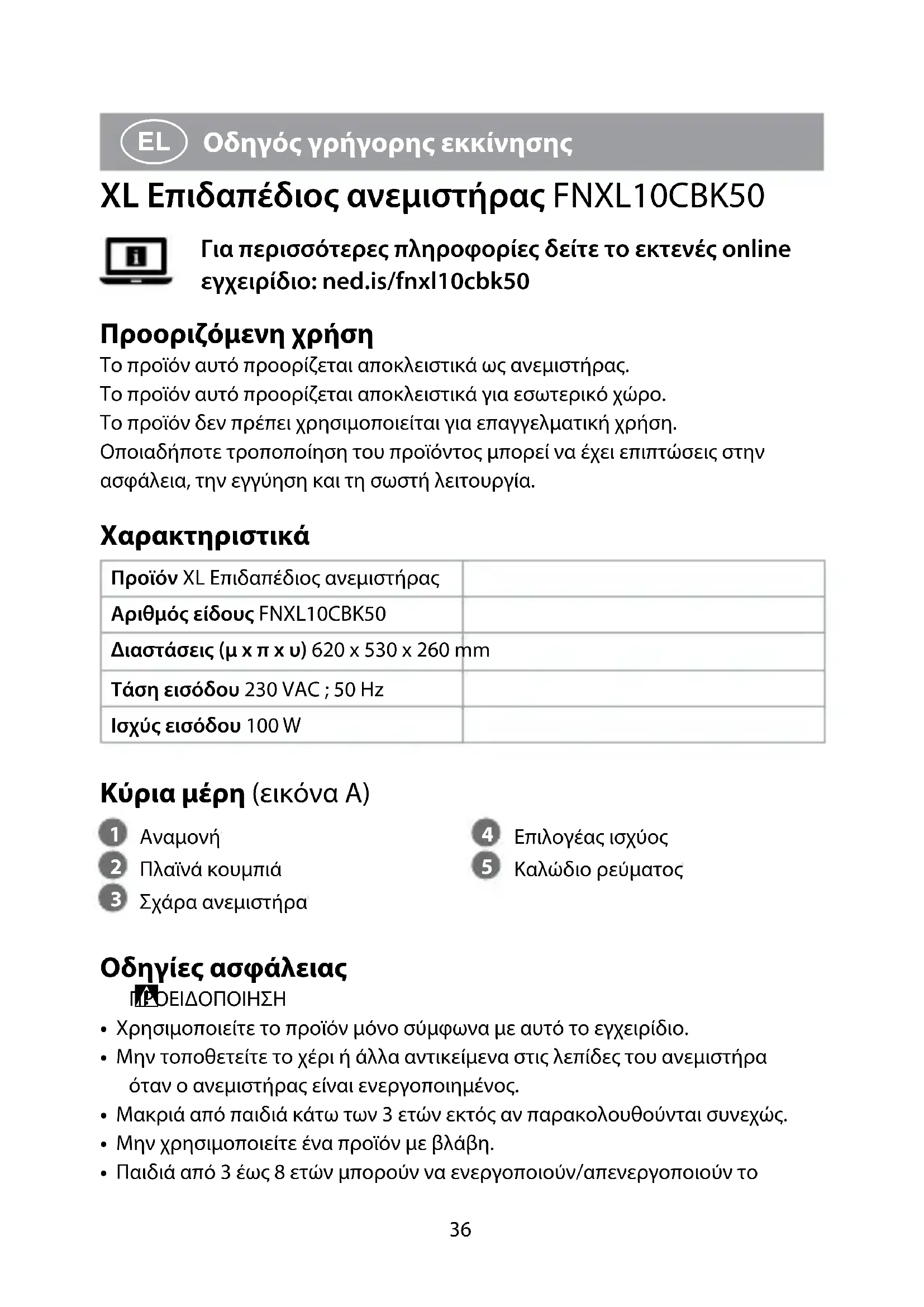 Οδηγός γρήγορης εκκίνησης XL Επιδαπέδιος ανεμιστήρας FNXL10CBK50 Για περισσότερες πληροφορίες δείτε το εκτενές online εγχειρίδιο: ned.is/fnxl10cbk50 Προοριζόμενη χρήση Το προϊόν αυτό προορίζεται αποκλειστικά ως ανεμιστήρας.Το προϊόν αυτό προορίζεται αποκλειστικά για εσωτερικό χώρο.Το προϊόν δεν πρέπει χρησιμοποιείται για επαγγελματική χρήση.Οποιαδήποτε τροποποίηση του προϊόντος μπορεί να έχει επιπτώσεις στην ασφάλεια, την εγγύηση και τη σωστή λειτουργία. Χαρακτηριστικά Προϊόν XL Επιδαπέδιος ανεμιστήραςΑριθμός είδους FNXL10CBK50Διαστάσεις (μ x π x υ) 620 x 530 x 260 mmΤάση εισόδου 230 VAC ; 50 HzΙσχύς εισόδου 100 W Κύρια μέρη (εικόνα A)
