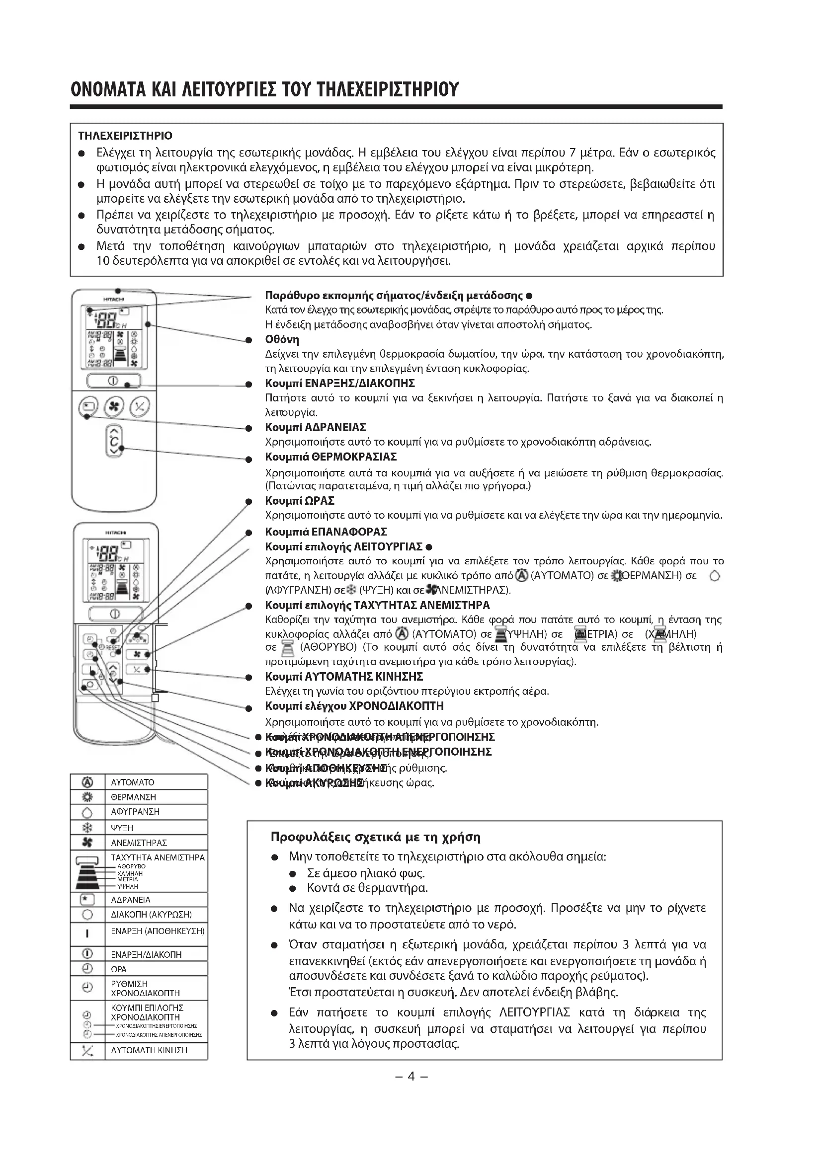TÔ Ï·Ì¿ÎÈ ·˘Ùfi ·Ó¿‚ÂÈ fiÙ·Ó ÏÂÈÙÔ˘ÚÁ› Ô ¯ÚÔÓԉȷÎfiÙ˘. TEMPORARY SWITCH ¶PO™øPINO™ ¢IAKO¶TH™ N· ¯ÚËÛÈÌÔÔț٠·˘ÙfiÓ ÙÔÓ ‰È·ÎfiÙË ÁÈ· Ó· ·ÓÔ›ÁÂÙÂ Î·È ÎÏ›ÓÂÙ ÙË Û˘Û΢‹ fiÙ·Ó ÙÔ ÙËϯÂÈÚÈÛÙ‹ÚÈÔ ‰ÂÓ ÏÂÈÙÔ˘ÚÁ›. (ÃÚËÛÈÌÔÔÈ‹ÛÙ ÌË ·ÁÒÁÈÌÔ ˘ÏÈÎfi fiˆ˜ Ô‰ÔÓÙÔÁÏ˘Ê›‰·) ● ¶·ÙÒÓÙ·˜ ÙÔÓ ÚÔÛˆÚÈÓfi ‰È·ÎfiÙË Ë Û˘Û΢‹ ı· ·Ú¯›ÛÂÈ ÙËÓ ÏÂÈÙÔ˘ÚÁ›· Û‡Ìʈӷ Ì ÙȘ ÚÔËÁÔ‡ÌÂÓ˜ Ú˘ıÌ›ÛÂȘ. ● ŸÙ·Ó ÏÂÈÙÔ˘ÚÁ›Ù ÙË Û˘Û΢‹ Ì ÙÔÓ ÚÔÛˆÚÈÓfi ‰È·ÎfiÙË, Â¿Ó ÙÔÓ ÎÏ›ÛÂÙÂ Î·È ÙÔÓ ·ÓÔ›ÍÂÙ ¿ÏÈ, Ë Ë Û˘Û΢‹ ı· ·Ú¯›ÛÂÈ ·˘ÙfiÌ·ÙË ÏÂÈÙÔ˘ÚÁ›·. TEMPORARY SWITCH– 4 – ΟΝΟΜΑΤΑ ΚΑΙ ΛΕΙΤΟΥΡΓΙΕΣ ΤΟΥ ΤΗΛΕΧΕΙΡΙΣΤΗΡΙΟΥ ΤΗΛΕΧΕΙΡΙΣΤΗΡΙΟ Ελέγχει τη λειτουργία της εσωτερικής μονάδας. Η εμβέλεια του ελέγχου είναι περίπου 7 μέτρα. Εάν ο εσωτερικός● φωτισμός είναι ηλεκτρονικά ελεγχόμενος, η εμβέλεια του ελέγχου μπορεί να είναι μικρότερη. Η μονάδα αυτή μπορεί να στερεωθεί σε τοίχο με το παρεχόμενο εξάρτημα. Πριν το στερεώσετε, βεβαιωθείτε ότι● μπορείτε να ελέγξετε την εσωτερική μονάδα από το τηλεχειριστήριο. Πρέπει να χειρίζεστε το τηλεχειριστήριο με προσοχή. Εάν το ρίξετε κάτω ή το βρέξετε, μπορεί να επηρεαστεί η● δυνατότητα μετάδοσης σήματος. Μετά την τοποθέτηση καινούργιων μπαταριών στο τηλεχειριστήριο, η μονάδα χρειάζεται αρχικά περίπου● 10 δευτερόλεπτα για να αποκριθεί σε εντολές και να λειτουργήσει. Παράθυρο εκπομπής σήματος/ένδειξη μετάδοσης ● Κατά τον έλεγχο της εσωτερικής μονάδας, στρέψτε το παράθυρο αυτό προς το μέρος της. Η ένδειξη μετάδοσης αναβοσβήνει όταν γίνεται αποστολή σήματος.