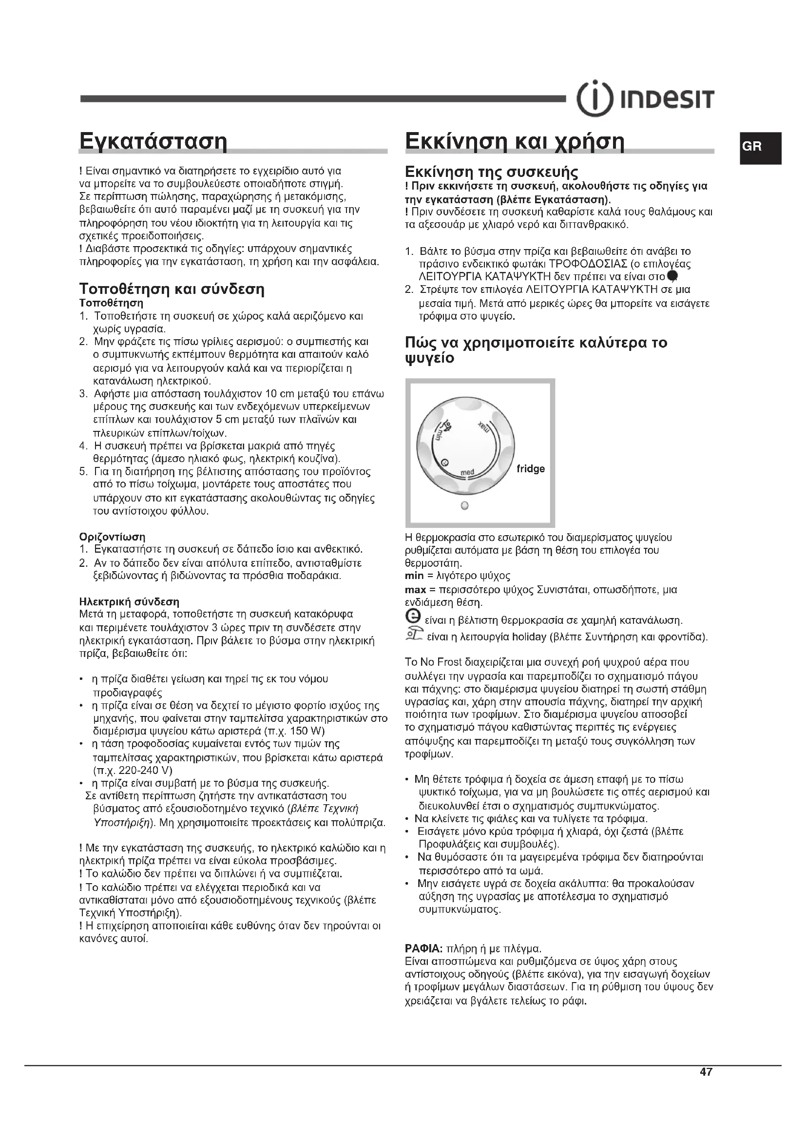 fridge Η θερμοκρασία στο εσωτερικό του διαμερίσματος ψυγείου ρυθμίζεται αυτόματα με βάση τη θέση του επιλογέα του θερμοστάτη. min = λιγότερο ψύχος max = περισσότερο ψύχος Συνιστάται, οπωσδήποτε, μια ενδιάμεση θέση. είναι η βέλτιστη θερμοκρασία σε χαμηλή κατανάλωση. είναι η λειτουργία holiday (βλέπε Συντήρηση και φροντίδα). Το No Frost διαχειρίζεται μια συνεχή ροή ψυχρού αέρα που συλλέγει την υγρασία και παρεμποδίζει το σχηματισμό πάγου και πάχνης: στο διαμέρισμα ψυγείου διατηρεί τη σωστή στάθμη υγρασίας και, χάρη στην απουσία πάχνης, διατηρεί την αρχική ποιότητα των τροφίμων. Στο διαμέρισμα ψυγείου αποσοβεί το σχηματισμό πάγου καθιστώντας περιττές τις ενέργειες απόψυξης και παρεμποδίζει τη μεταξύ τους συγκόλληση των