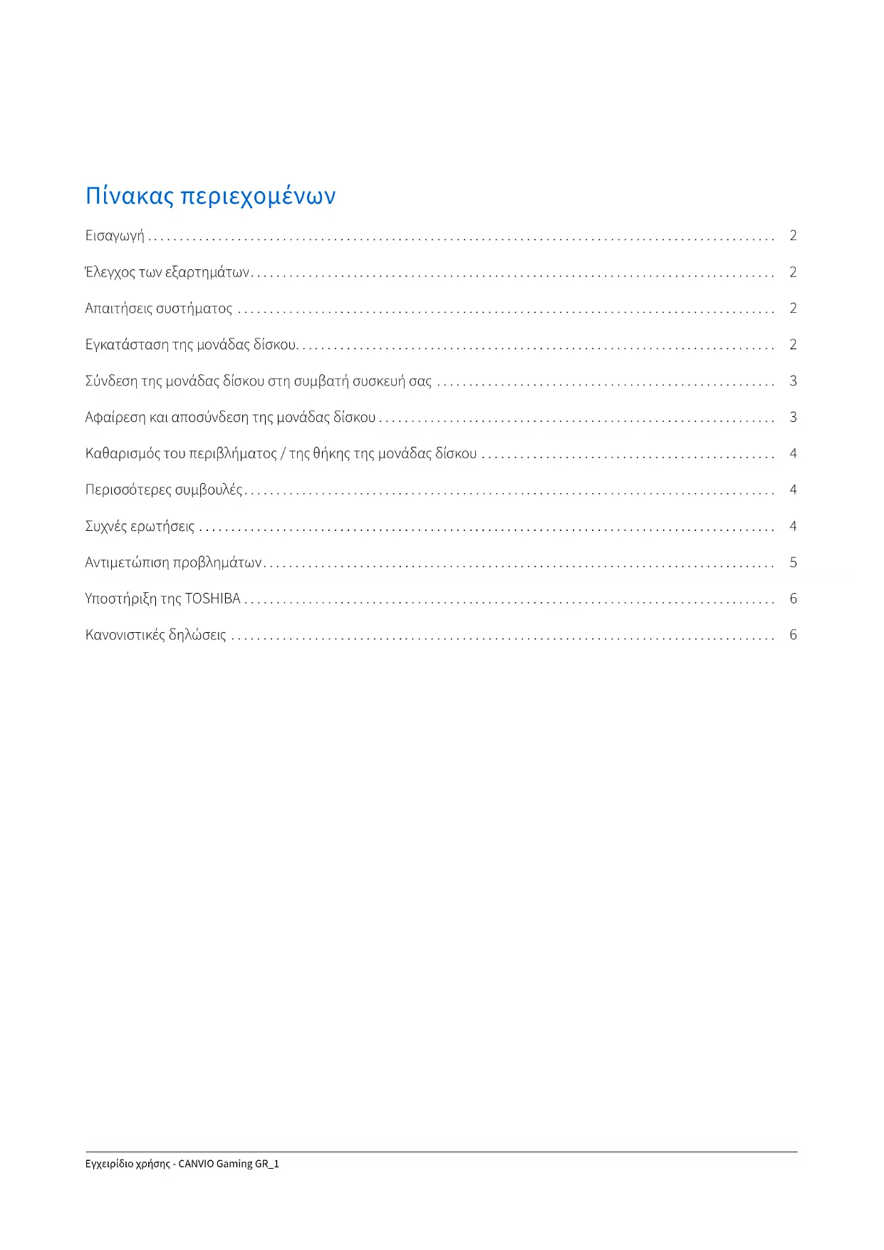 Σας ευχαριστούμε που επιλέξατε τη φορητή μονάδα αποθήκευσης της εταιρείας μας. Διαβάστε προσεκτικά αυτό το Εγχειρίδιο χρήσης, καθώς περιέχει όλες τις σχετικές πληροφορίες για την εγκατάσταση, τη χρήση και τη συντήρηση της μονάδας δίσκου καθώς και συμβουλές για την ασφάλεια. Σε περίπτωση που η μονάδα δίσκου δεν συμπεριφέρεται όπως αναμένεται, ανατρέξτε στην ενότητα “Συχνές ερωτήσεις” στο τέλος αυτού του εγχειριδίου. Έλεγχος των εξαρτημάτων Το παρόν Εγχειρίδιο χρήσης είναι επίσης διαθέσιμο για λήψη: www.toshiba-storage.com/downloads/ Ανατρέξτε επίσης στο “Εγχειρίδιο οδηγιών για την ασφάλεια και την άνεση” που είναι προεγκατεστημένο σε αυτήν την εξωτερική μονάδα σκληρού δίσκου. Απαιτήσεις συστήματος Διαμόρφωση exFAT για: - Playstation/Xbox (ελέγξτε τη λίστα συμβατότητας: www.canvio.jp/en/compati/hdd/ot_ehdd/game/index.htm) - Windows 10, Windows 8.1, - macOS v10.15, macOS v10.14, macOS v10.13 Μία ελεύθερη θύρα USB Type-A Εγκατάσταση της μονάδας δίσκου Μερικές πληροφορίες για την τροφοδοσία μέσω διαύλου και μέσω του παρεχόμενου καλωδίου USB: Η μονάδα δίσκου που διαθέτετε τροφοδοτείται μέσω διαύλου. Συνεπώς, δεν χρειάζεται να συνδέσετε κάποια εξωτερική τροφοδοσία ρεύματος, καθώς όλο το ρεύμα που χρειάζεται παρέχεται μέσω της συνδεδεμένης θύρας(ών) USB. Δεν είναι δυνατή η χρήση ή σύνδεση στη μονάδα δίσκου παθητικών διανομέων USB ή βυσμάτων USB όπως π.χ. για πληκτρολόγιο, ποντίκι ή άλλα παρόμοια προϊόντα. Βεβαιωθείτε ότι τα βύσματα εισάγονται σωστά. Ποτέ μην πιέζετε τα καλώδια όταν τα συνδέετε. Ελέγξτε την πολικότητα πριν από τη σύνδεση! Canvio Gaming Καλώδιο USB 3.2 Gen 1 (Type-A σε Micro-B) Έγγραφο με στοιχεία επικοινωνίας για υποστήριξηΕγχειρίδιο χρήσης - CANVIO Gaming GR_3 Σύνδεση της μονάδας δίσκου στη συμβατή συσκευή σας Ελέγξτε τη συμβατότητα συσκευών και τις οδηγίες σύνδεσης ανατρέχοντας στα αντίστοιχα εγχειρίδια χρήσης για τέτοιες συσκευές.
