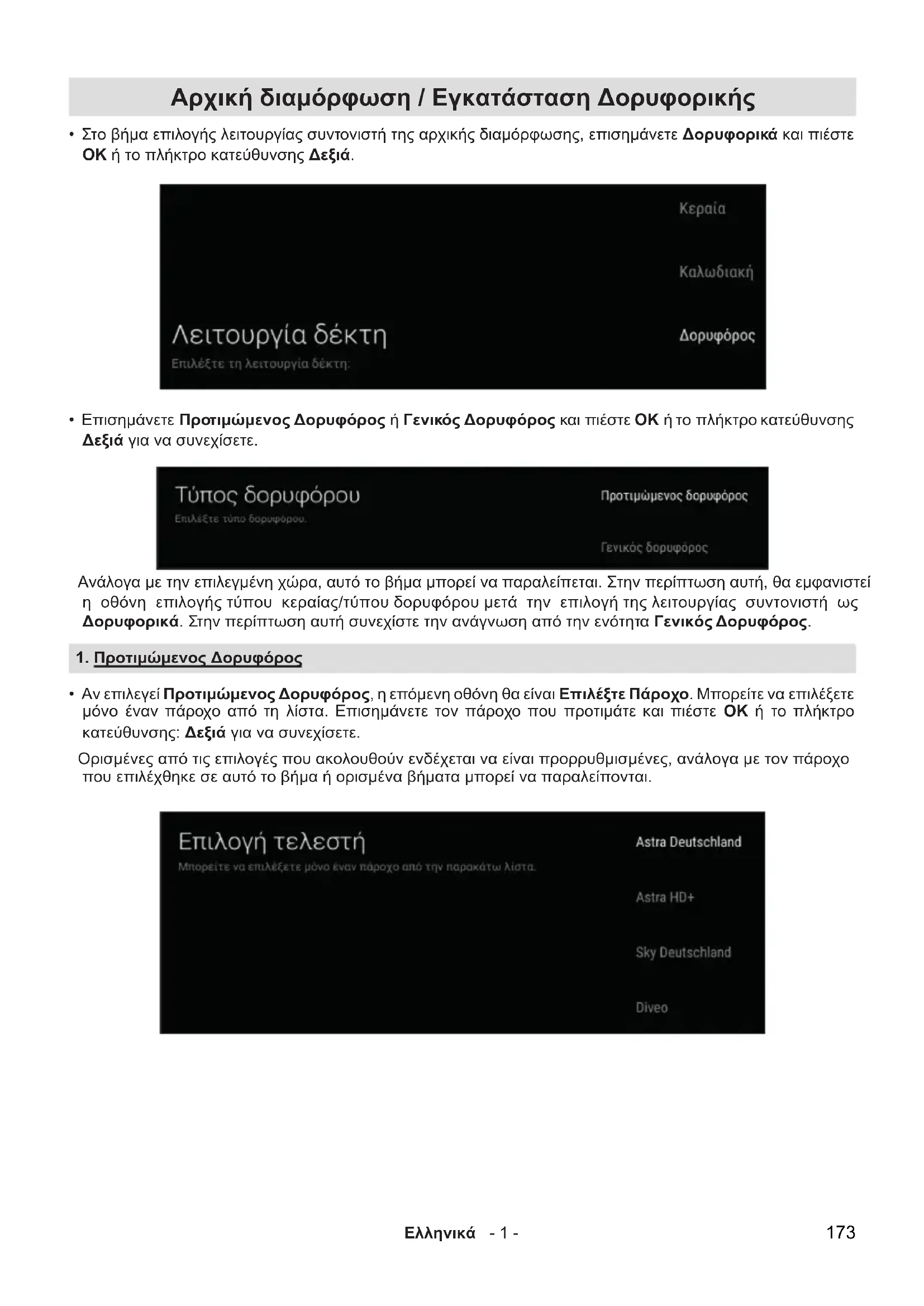 - Αν επιλεγεί Προτιμώμενος Δορυφόρος, η επόμενη οθόνη θα είναι Επιλέξτε Πάροχο. Μπορείτε να επιλέξετε μόνο έναν πάροχο από τη λίστα. Επισημάνετε τον πάροχο που προτιμάτε και πιέστε OK ή το πλήκτρο κατεύθυνσης: Δεξιά για να συνεχίσετε. Ορισμένες από τις επιλογές που ακολουθούν ενδέχεται να είναι προρρυθμισμένες, ανάλογα με τον πάροχο που επιλέχθηκε σε αυτό το βήμα ή ορισμένα βήματα μπορεί να παραλείπονται. 173Ελληνικά - 2 - 1.1. Τύπος κεραίας - Απευθείας