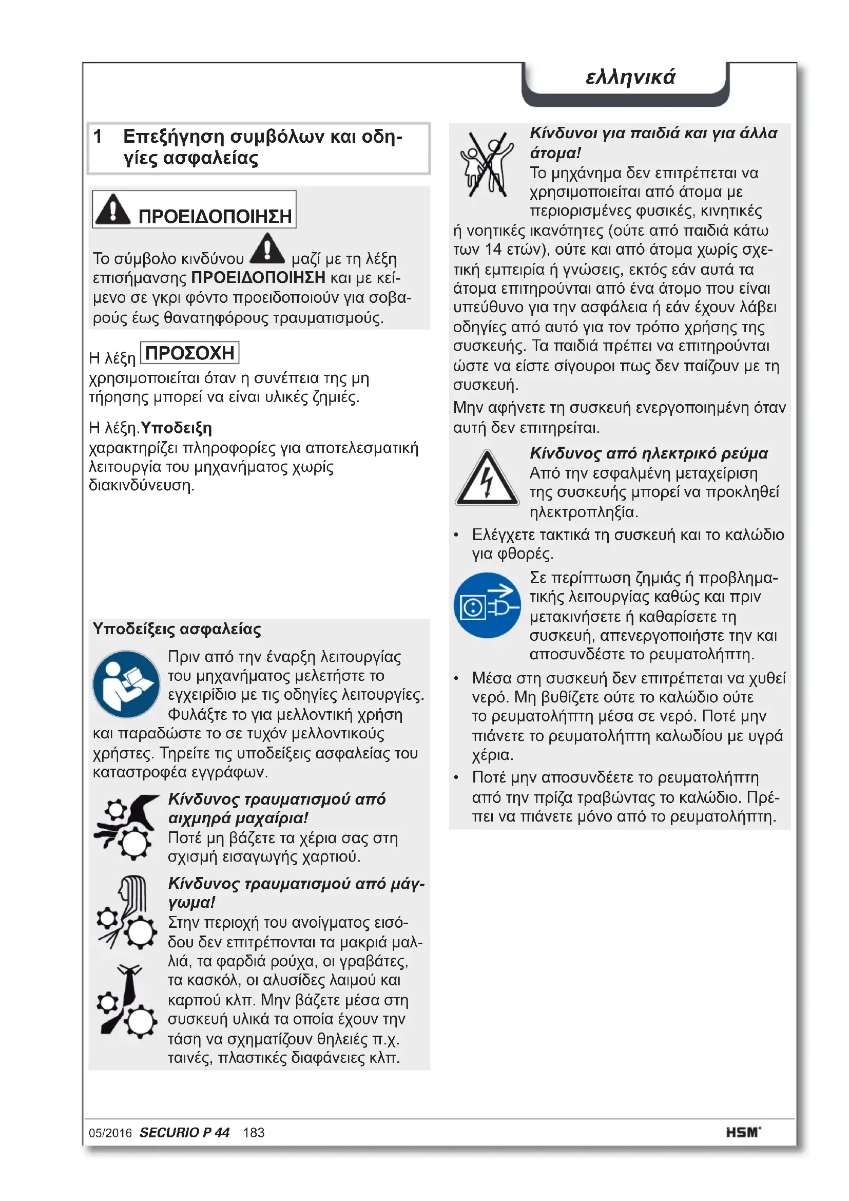 1 Επεξήγηση συμβόλων και οδη- γίες ασφαλείας Η λέξη.Υποδειξη χαρακτηρίζει πληροφορίες για αποτελεσματική λειτουργία του μηχανήματος χωρίς διακινδύνευση. ΠΡΟΕΙΔΟΠΟΙΗΣΗ Το σύμβολο κινδύνου μαζί με τη λέξη επισήμανσης ΠΡΟΕΙΔΟΠΟΙΗΣΗ και με κεί- μενο σε γκρι φόντο προειδοποιούν για σοβα- ρούς έως θανατηφόρους τραυματισμούς. Υποδείξεις ασφαλείας Πριν από την έναρξη λειτουργίας του μηχανήματος μελετήστε το εγχειρίδιο με τις οδηγίες λειτουργίες. Φυλάξτε το για μελλοντική χρήση και παραδώστε το σε τυχόν μελλοντικούς χρήστες. Τηρείτε τις υποδείξεις ασφαλείας του καταστροφέα εγγράφων. Κίνδυνος τραυματισμού από αιχμηρά μαχαίρια! Ποτέ μη βάζετε τα χέρια σας στη σχισμή εισαγωγής χαρτιού.