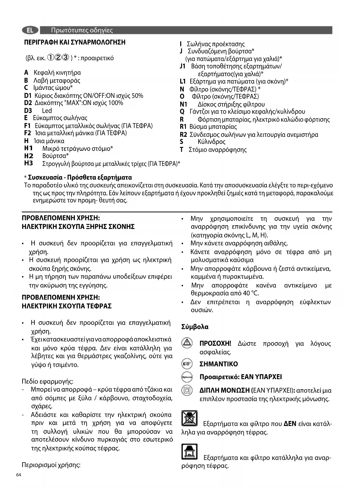 Προαιρετικό: ΕΑΝ ΥΠΑΡΧΕΙ ΔΙΠΛΗ ΜΟΝΩΣΗ (ΕΑΝ ΥΠΑΡΧΕΙ): αποτελεί μια επιπλέον προστασία της ηλεκτρικής μόνωσης. Εξαρτήματα και φίλτρο που ΔΕΝ είναι κατάλ- ληλα για αναρρόφηση τέφρας. Εξαρτήματα και φίλτρο κατάλληλα για αναρ- ρόφηση τέφρας. Πρωτότυπες οδηγίες 64ΑΣΦΑΛΕΙΑ ΓΕΝΙΚΕΣ ΠΡΟΕΙΔΟΠΟΙΗΣΕΙΣ