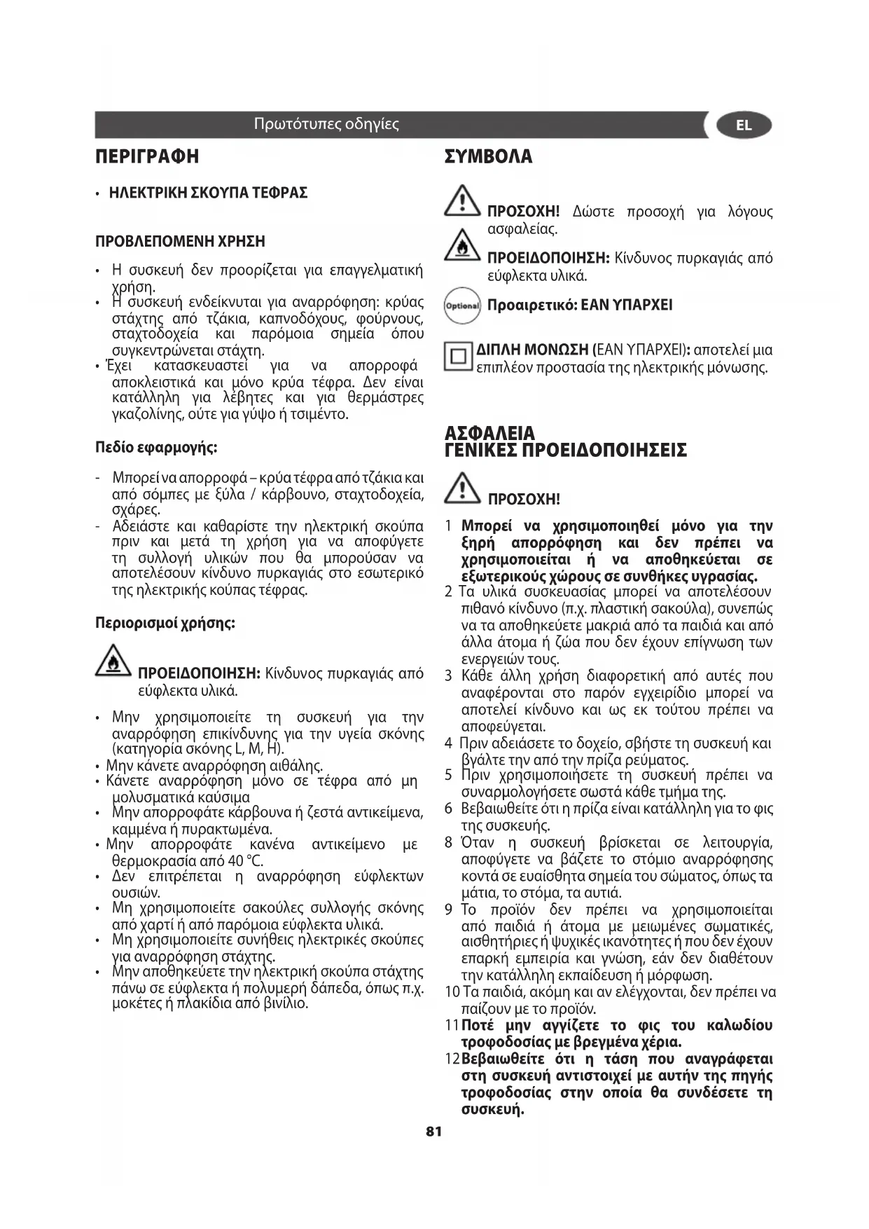 - Αδειάστε και καθαρίστε την ηλεκτρική σκούπα πριν και μετά τη χρήση για να αποφύγετε τη συλλογή υλικών που θα μπορούσαν να αποτελέσουν κίνδυνο πυρκαγιάς στο εσωτερικό της ηλεκτρικής κούπας τέφρας. Περιορισμοί χρήσης: ΠΡΟΕΙΔΟΠΟΙΗΣΗ: Κίνδυνος πυρκαγιάς από εύφλεκτα υλικά.