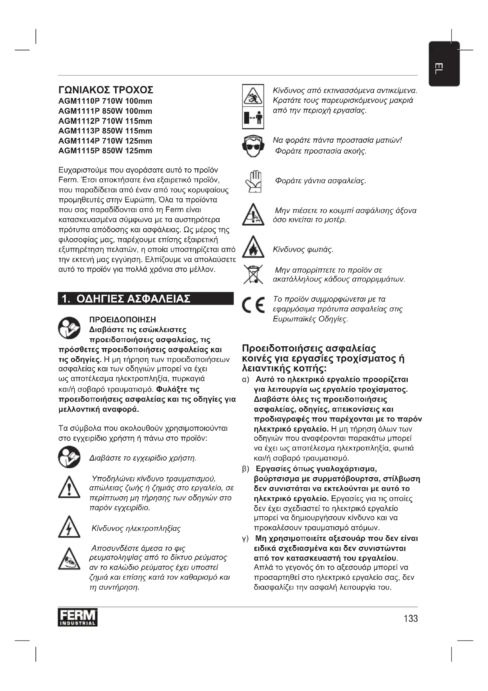 ΓΩΝΙΑΚΟΣ ΤΡΟΧΟΣ AGM1110P 710W 100mm AGM1111P 850W 100mm AGM1112P 710W 115mm AGM1113P 850W 115mm AGM1114P 710W 125mm AGM1115P 850W 125mm Ευχαριστούμε που αγοράσατε αυτό το προϊόν Ferm. Έτσι αποκτήσατε ένα εξαιρετικό προϊόν, που παραδίδεται από έναν από τους κορυφαίους προμηθευτές στην Ευρώπη. Όλα τα προϊόντα που σας παραδίδονται από τη Ferm είναι κατασκευασμένα σύμφωνα με τα αυστηρότερα πρότυπα απόδοσης και ασφάλειας. Ως μέρος της φιλοσοφίας μας, παρέχουμε επίσης εξαιρετική εξυπηρέτηση πελατών, η οποία υποστηρίζεται από την εκτενή μας εγγύηση. Ελπίζουμε να απολαύσετε αυτό το προϊόν για πολλά χρόνια στο μέλλον.