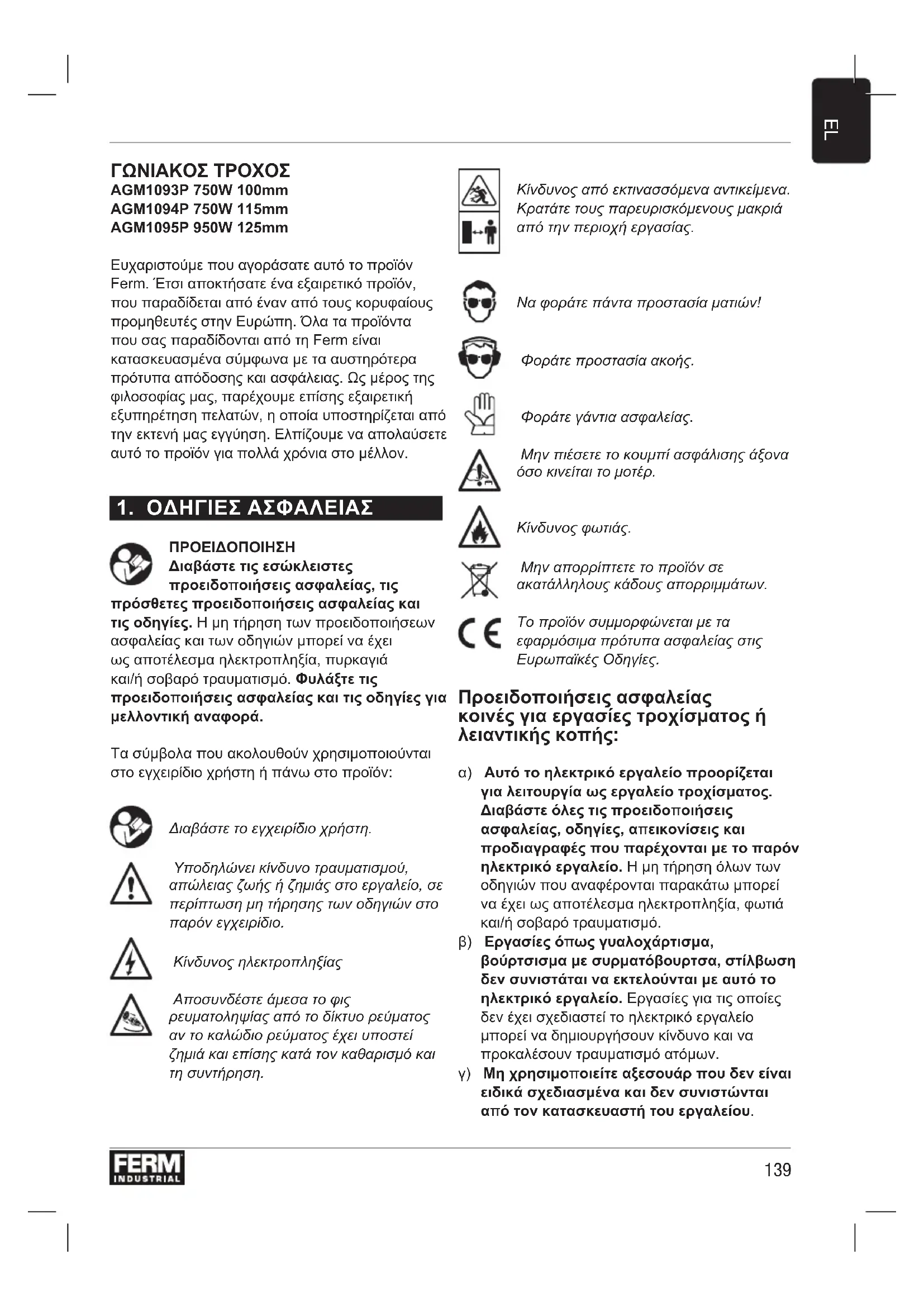 ΓΩΝΙΑΚΟΣ ΤΡΟΧΟΣ AGM1093P 750W 100mm AGM1094P 750W 115mm AGM1095P 950W 125mm Ευχαριστούμε που αγοράσατε αυτό το προϊόν Ferm. Έτσι αποκτήσατε ένα εξαιρετικό προϊόν, που παραδίδεται από έναν από τους κορυφαίους προμηθευτές στην Ευρώπη. Όλα τα προϊόντα που σας παραδίδονται από τη Ferm είναι κατασκευασμένα σύμφωνα με τα αυστηρότερα πρότυπα απόδοσης και ασφάλειας. Ως μέρος της φιλοσοφίας μας, παρέχουμε επίσης εξαιρετική εξυπηρέτηση πελατών, η οποία υποστηρίζεται από την εκτενή μας εγγύηση. Ελπίζουμε να απολαύσετε αυτό το προϊόν για πολλά χρόνια στο μέλλον.