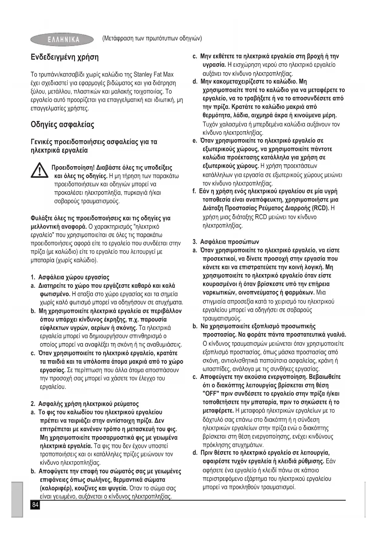 a. Το φις του καλωδίου του ηλεκτρικού εργαλείου πρέπει να ταιριάζει στην αντίστοιχη πρίζα. Δεν επιτρέπεται με κανέναν τρόπο η μετασκευή του φις. Μη χρησιμοποιείτε προσαρμοστικά φις με γειωμένα ηλεκτρικά εργαλεία. Τα φις που δεν έχουν υποστεί τροποποιήσεις και οι κατάλληλες πρίζες μειώνουν τον κίνδυνο ηλεκτροπληξίας. b. Αποφύγετε την επαφή του σώματός σας με γειωμένες επιφάνειες όπως σωλήνες, θερμαντικά σώματα (καλοριφέρ), κουζίνες και ψυγεία. Όταν το σώμα σας είναι γειωμένο, αυξάνεται ο κίνδυνος ηλεκτροπληξίας. c. Μην εκθέτετε τα ηλεκτρικά εργαλεία στη βροχή ή την υγρασία. Η εισχώρηση νερού στο ηλεκτρικό εργαλείο αυξάνει τον κίνδυνο ηλεκτροπληξίας. d. Μην κακομεταχειρίζεστε το καλώδιο. Μη χρησιμοποιείτε ποτέ το καλώδιο για να μεταφέρετε το εργαλείο, να το τραβήξετε ή να το αποσυνδέσετε από την πρίζα. Κρατάτε το καλώδιο μακριά από θερμότητα, λάδια, αιχμηρά άκρα ή κινούμενα μέρη. Τυχόν χαλασμένα ή μπερδεμένα καλώδια αυξάνουν τον κίνδυνο ηλεκτροπληξίας. e. Όταν χρησιμοποιείτε το ηλεκτρικό εργαλείο σε εξωτερικούς χώρους, να χρησιμοποιείτε πάντοτε καλώδια προέκτασης κατάλληλα για χρήση σε εξωτερικούς χώρους. Η χρήση προεκτάσεων κατάλληλων για εργασία σε εξωτερικούς χώρους μειώνει τον κίνδυνο ηλεκτροπληξίας. f. Εάν η χρήση ενός ηλεκτρικού εργαλείου σε μία υγρή τοποθεσία είναι αναπόφευκτη, χρησιμοποιήστε μια Διάταξη Προστασίας Ρεύματος Διαρροής (RCD). Η χρήση μιας διάταξης RCD μειώνει τον κίνδυνο ηλεκτροπληξίας.