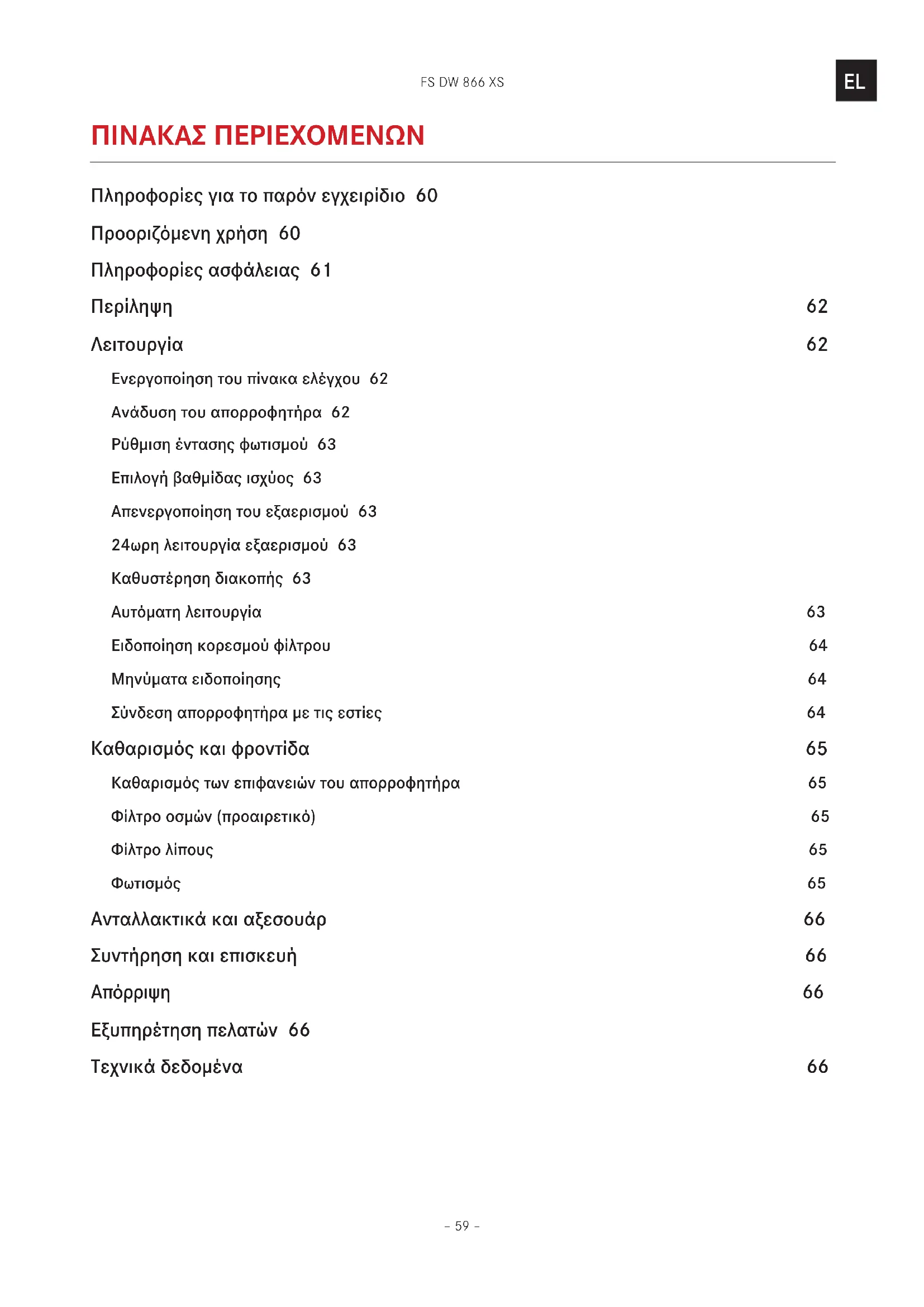 ΠΊΝΑΚΑΣ ΠΕΡΊΕΧΟΜΕΝΩΝ Πληροφορίες για το παρόν εγχειρίδιο 60 Προοριζόμενη χρήση 60 Πληροφορίες ασφάλειας 61 Περίληψη 62 Λειτουργία 62 Ενεργοποίηση του πίνακα ελέγχου 62 Ανάδυση του απορροφητήρα 62 Ρύθμιση έντασης φωτισμού 63 Επιλογή βαθμίδας ισχύος 63 Απενεργοποίηση του εξαερισμού 63 24ωρη λειτουργία εξαερισμού 63 Καθυστέρηση διακοπής 63 Αυτόματη λειτουργία 63 Ειδοποίηση κορεσμού φίλτρου 64 Μηνύματα ειδοποίησης 64 Σύνδεση απορροφητήρα με τις εστίες 64 Καθαρισμός και φροντίδα 65 Καθαρισμός των επιφανειών του απορροφητήρα 65 Φίλτρο οσμών (προαιρετικό) 65 Φίλτρο λίπους 65 Φωτισμός 65 Ανταλλακτικά και αξεσουάρ 66 Συντήρηση και επισκευή 66 Απόρριψη 66 Εξυπηρέτηση πελατών 66 Τεχνικά δεδομένα 66FS DW 866 XS – 60 –