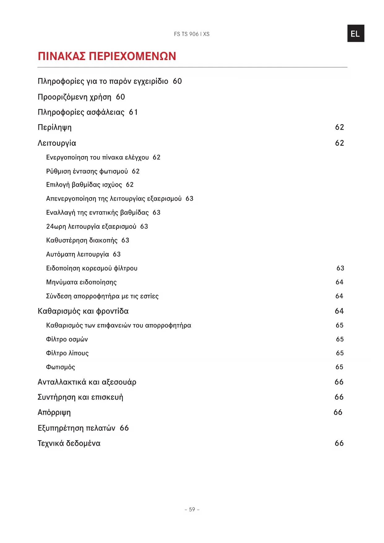 Πίνακας Περίεχομενων Πληροφορίες για το παρόν εγχειρίδιο 60 Προοριζόμενη χρήση 60 Πληροφορίες ασφάλειας 61 Περίληψη 62 Λειτουργία 62 Ενεργοποίηση του πίνακα ελέγχου 62 Ρύθμιση έντασης φωτισμού 62 Επιλογή βαθμίδας ισχύος 62 Απενεργοποίηση της λειτουργίας εξαερισμού 63 Εναλλαγή της εντατικής βαθμίδας 63 24ωρη λειτουργία εξαερισμού 63 Καθυστέρηση διακοπής 63 Αυτόματη λειτουργία 63 Ειδοποίηση κορεσμού φίλτρου 63 Μηνύματα ειδοποίησης 64 Σύνδεση απορροφητήρα με τις εστίες 64 Καθαρισμός και φροντίδα 64 Καθαρισμός των επιφανειών του απορροφητήρα 65 Φίλτρο οσμών 65 Φίλτρο λίπους 65 Φωτισμός 65 Ανταλλακτικά και αξεσουάρ 66 Συντήρηση και επισκευή 66 Απόρριψη 66 Εξυπηρέτηση πελατών 66 Τεχνικά δεδομένα 66FS TS 906 I XS – 60 –