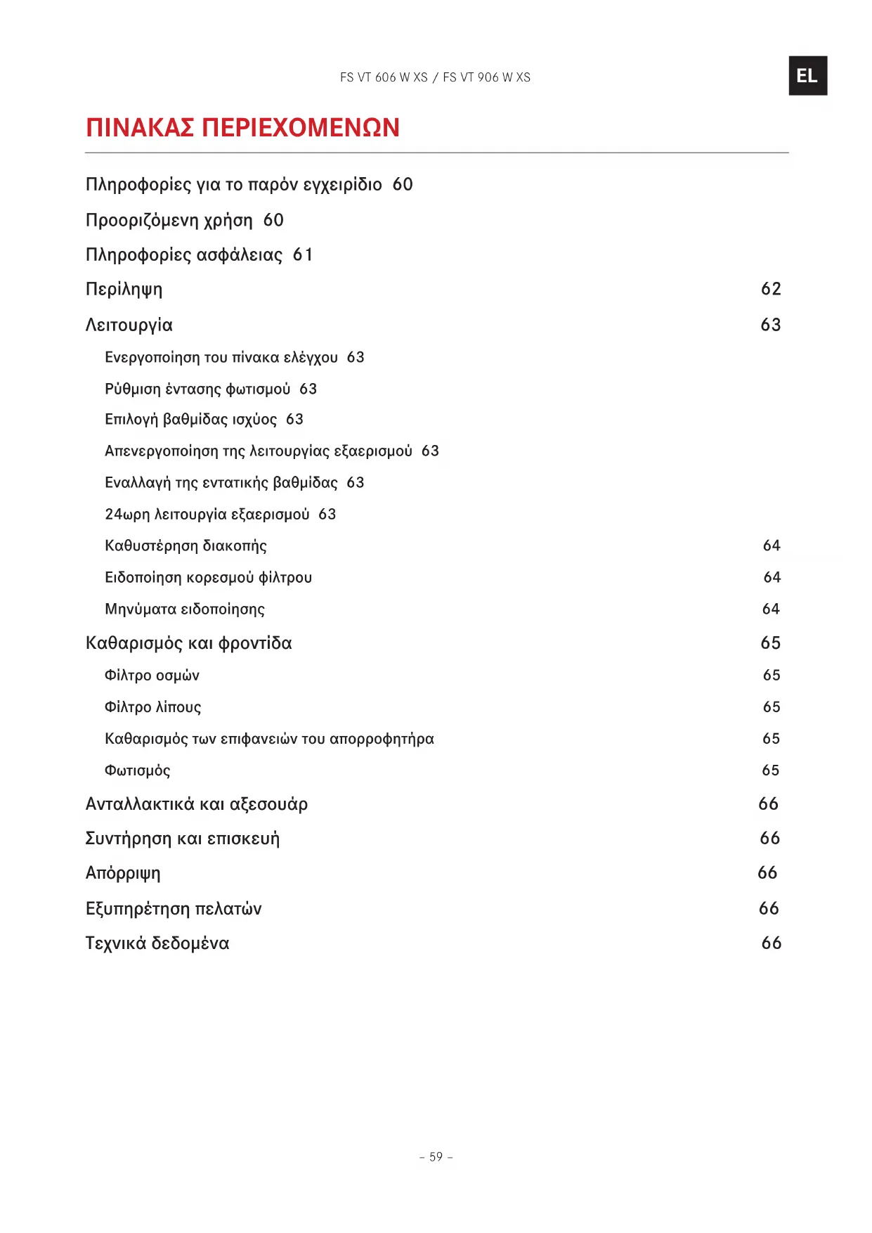 Πίνακας Περίεχομενων Πληροφορίες για το παρόν εγχειρίδιο 60 Προοριζόμενη χρήση 60 Πληροφορίες ασφάλειας 61 Περίληψη 62 Λειτουργία 63 Ενεργοποίηση του πίνακα ελέγχου 63 Ρύθμιση έντασης φωτισμού 63 Επιλογή βαθμίδας ισχύος 63 Απενεργοποίηση της λειτουργίας εξαερισμού 63 Εναλλαγή της εντατικής βαθμίδας 63 24ωρη λειτουργία εξαερισμού 63 Καθυστέρηση διακοπής 64 Ειδοποίηση κορεσμού φίλτρου 64 Μηνύματα ειδοποίησης 64 Καθαρισμός και φροντίδα 65 Φίλτρο οσμών 65 Φίλτρο λίπους 65 Καθαρισμός των επιφανειών του απορροφητήρα 65 Φωτισμός 65 Ανταλλακτικά και αξεσουάρ 66 Συντήρηση και επισκευή 66 Απόρριψη 66 Εξυπηρέτηση πελατών 66 Τεχνικά δεδομένα 66FS VT 606 W XS / FS VT 906 W XS – 60 –