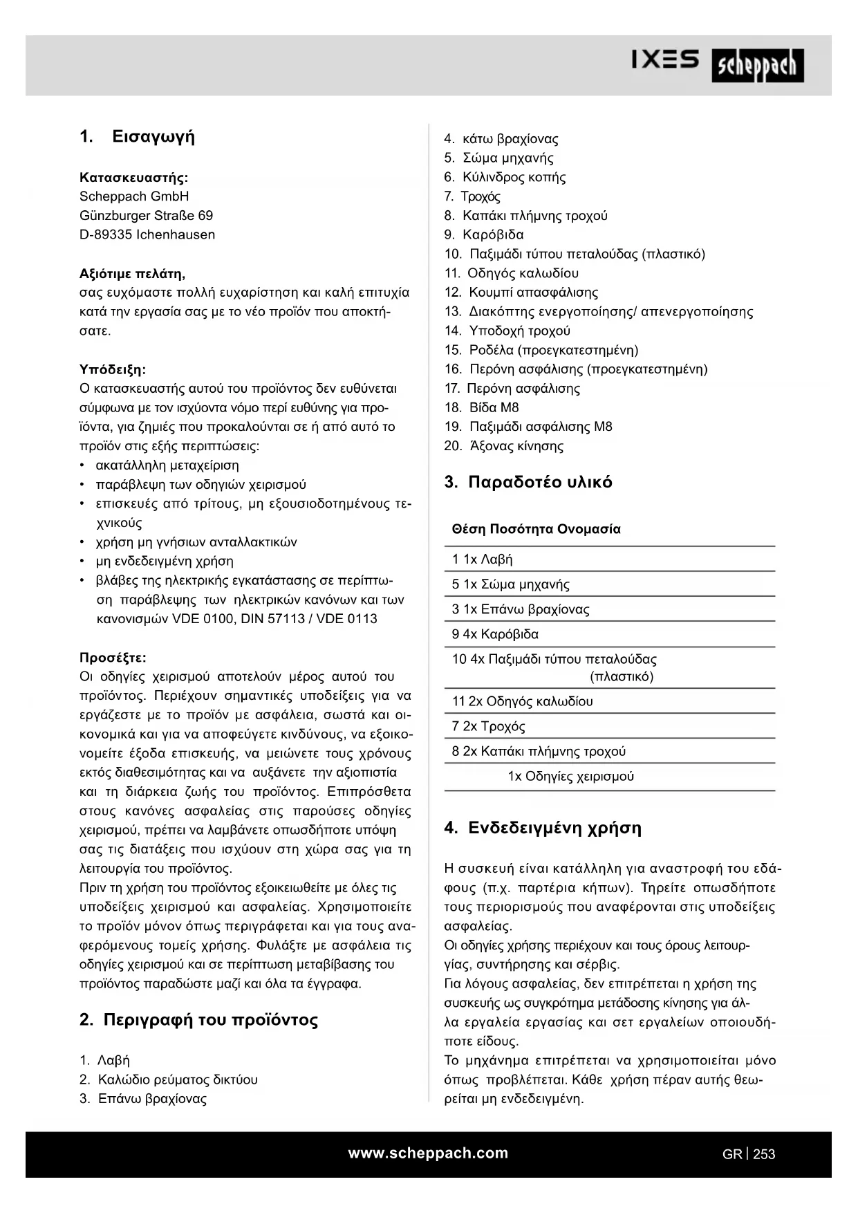 Κατασκευαστής: Scheppach GmbH Günzburger Straße 69 D-89335 Ichenhausen Αξιότιμε πελάτη, σας ευχόμαστε πολλή ευχαρίστηση και καλή επιτυχία κατά την εργασία σας με το νέο προϊόν που αποκτή-