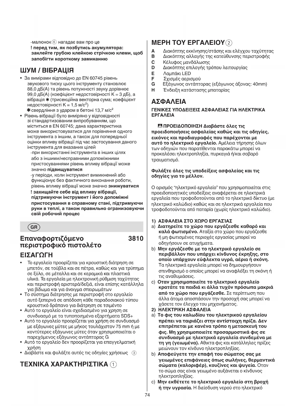- Το επίπεδο παραγωγής κραδασμών έχει μετρηθεί σύμφωνα με μια τυποποιημένη δοκιμή που αναφέρεται στο πρότυπο EN 60745 - μπορεί να χρησιμοποιηθεί για τη σύγκριση ενός εργαλείου με ένα άλλο, καθώς και ως προκαταρκτική αξιολόγηση της έκθεσης στους κραδασμούς όταν το εργαλείο χρησιμοποιείται για τις εφαρμογές που αναφέρονται - η χρήση του εργαλείου για διαφορετικές εφαρμογές ή με διαφορετικά ή κακοσυντηρημένα εξαρτήματα μπορεί να αυξήσει σημαντικά το επίπεδο έκθεσης - όταν το εργαλείο είναι απενεργοποιημένο ή δουλεύει αλλά δεν εκτελεί την εργασία, το επίπεδο έκθεσης μπορεί να μειωθεί σημαντικά ! προστατευτείτε από τις επιδράσεις των κραδασμών συντηρώντας σωστά το εργαλείο και τα εξαρτήματά του, διατηρώντας τα χέρια σας ζεστά και οργανώνοντας τον τρόπο εργασίας σας