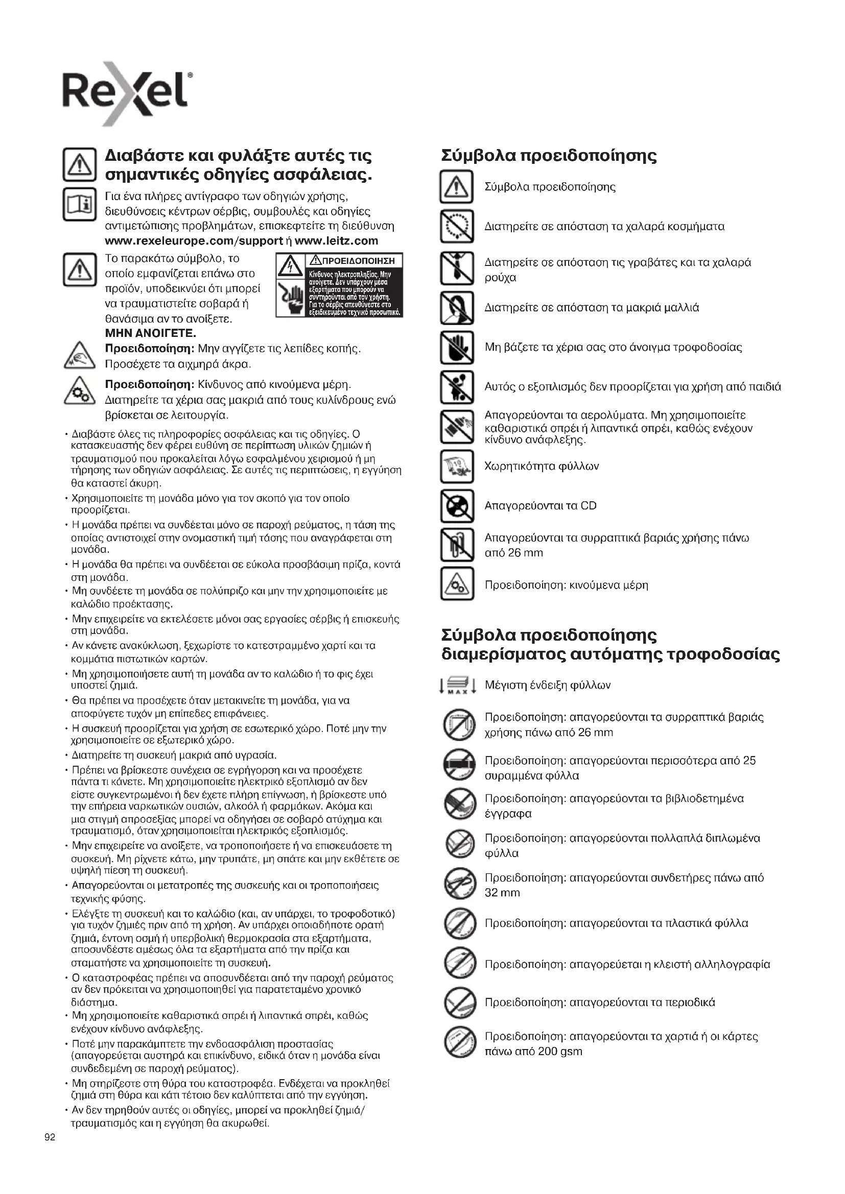 - Αν δεν τηρηθούν αυτές οι οδηγίες, μπορεί να προκληθεί ζημιά/ τραυματισμός και η εγγύηση θα ακυρωθεί. Διαβάστε και φυλάξτε αυτές τις σημαντικές οδηγίες ασφάλειας. Για ένα πλήρες αντίγραφο των οδηγιών χρήσης, διευθύνσεις κέντρων σέρβις, συμβουλές και οδηγίες αντιμετώπισης προβλημάτων, επισκεφτείτε τη διεύθυνση www.rexeleurope.com/support ή www.leitz.com Διατηρείτε σε απόσταση τα χαλαρά κοσμήματα Διατηρείτε σε απόσταση τις γραβάτες και τα χαλαρά