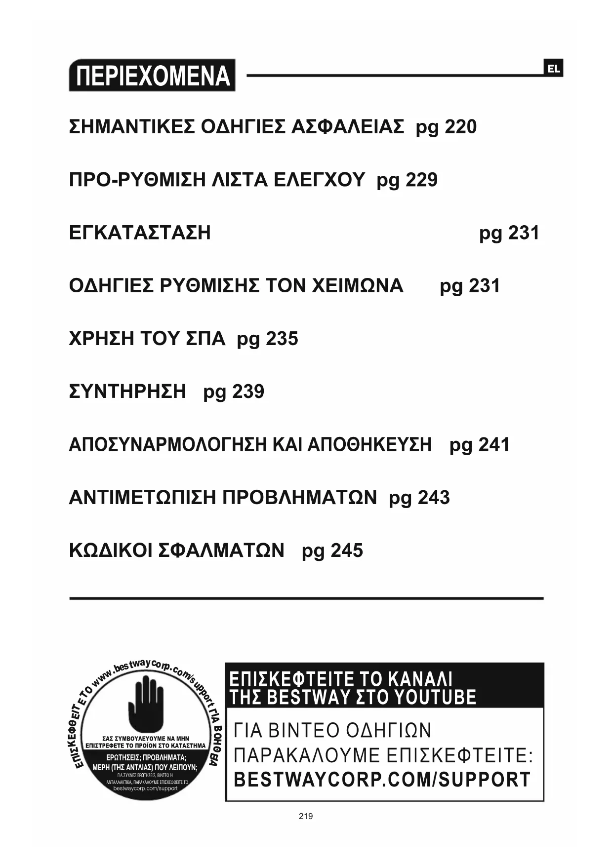 - ΑΚΑΘΑΡΤΟ ΦΥΣΙΓΓΙΟ ΦΙΛΤΡΟΥ - ΕΝΕΡΓΟΠΟΙΗΣΗ ΘΕΡΜΙΚΟΥ ΔΙΑΚΟΠΤΗ - ΤΟ ΣΠΑ ΔΕΝ ΕΙΝΑΙ ΚΑΛΥΜΜΕΝΟ - ΑΣΤΟΧΙΑ ΘΕΡΜΑΝΤΙΚΟΥ ΣΤΟΙΧΕΙΟΥ Ή ΕΝΕΡΓΟΠΟΙΗΣΗΣ ΑΣΦΑΛΕΙΑΣ - ΡΥΘΜΙΣΤΕ ΣΕ ΥΨΗΛΟΤΕΡΗ ΘΕΡΝΟΚΡΑΣΙΑ, ΑΝΑΤΡΕΞΤΕ ΣΤΗΝ ΕΝΟΤΗΤΑ ΛΕΙΤΟΥΡΓΙΑ ΤΗΣ ΑΝΤΛΙΑΣ - ΚΑΘΑΡΙΣΤΕ / ΑΝΤΙΚΑΤΑΣΤΗΣΤΕ ΤΟ ΦΥΣΙΓΓΙΟ ΦΙΛΤΡΟΥ, ΑΝΑΤΡΕΞΤΕ ΣΤΗΝ ΕΝΟΤΗΤΑ ΚΑΘΑΡΙΣΜΟΣ ΚΑΙ ΑΝΤΙΚΑΤΑΣΤΑΣΗ ΤΟΥ ΦΥΣΙΓΓΙΟΥ ΦΙΛΤΡΟΥ - ΑΠΟΣΥΝΔΕΣΤΕ ΤΗΝ ΑΝΤΛΙΑ ΚΑΙ ΒΑΛΤΕ ΤΟ ΒΥΣΜΑ ΣΕ ΣΤΕΓΝΟ, ΔΡΟΣΕΡΟ ΜΕΡΟΣ. ΕΠΑΝΕΚΚΙΝΗΣΤΕ ΤΗΝ ΑΝΤΛΙΑ ΜΟΝΟ ΟΤΑΝ Η ΘΕΡΜΟΚΡΑΣΙΑ ΝΕΡΟΥ ΦΘΑΣΕΙ ΤΟΥΣ 35°C (95°F) Ή ΧΑΜΗΛΟΤΕΡΑ - ΣΥΝΔΕΣΤΕ ΤΟ ΚΑΛΥΜΜΑ - ΓΙΑ ΒΟΗΘΕΙΑ, ΕΠΙΣΚΕΦΘΕΙΤΕ ΤΟ ΤΜΗΜΑ ΥΠΟΣΤΗΡΙΞΗΣ ΣΤΗΝ ΙΣΤΟΣΕΛΙΔΑ ΜΑΣ, www.bestwaycorp.com - ΓΙΑ ΝΑ ΞΕΚΛΕΙΔΩΣΕΤΕ ΤΟΝ ΠΙΝΑΚΑ ΕΛΕΓΧΟΥ, ΠΑΤΗΣΤΕ ΤΟ ΠΛΗΚΤΡΟ ΓΙΑ 3 ΔΕΥΤΕΡΟΛΕΠΤΑ. ΕΑΝ Ο ΠΙΝΑΚΑΣ ΕΛΕΓΧΟΥ ΔΕΝ ΞΕΚΛΕΙΔΩΣΕΙ, ΕΠΑΝΕΚΚΙΝΗΣΤΕ ΤΗΝ ΑΝΤΛΙΑ - ΑΠΟΣΥΝΔΕΣΤΕ ΚΑΙ ΕΠΑΝΑΣΥΝΔΕΣΤΕ ΤΟ ΒΥΣΜΑ ΣΤΗΝ ΑΝΤΛΙΑ - ΠΑΤΗΣΤΕ ΤΟ ΠΛΗΚΤΡΟ ON / OFF ΓΙΑ 2 ΔΕΥΤΕΡΟΛΕΠΤΑ. ΕΑΝ ΤΟ ΠΡΟΒΛΗΜΑ ΕΠΙΜΕΝΕΙ, ΓΙΑ ΒΟΗΘΕΙΑ, ΕΠΙΣΚΕΦΘΕΙΤΕ ΤΟ ΤΜΗΜΑ ΥΠΟΣΤΗΡΙΞΗΣ ΣΤΗΝ ΙΣΤΟΣΕΛΙΔΑ ΜΑΣ, www.bestwaycorp.com244
