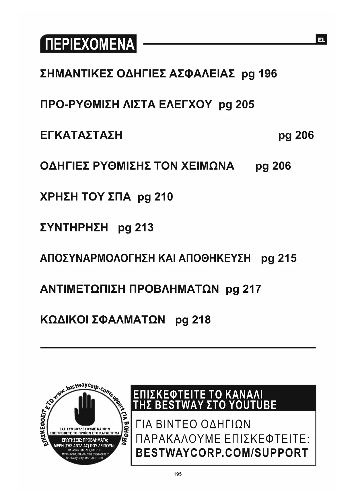 - ΑΚΑΘΑΡΤΟ ΦΥΣΙΓΓΙΟ ΦΙΛΤΡΟΥ - ΕΝΕΡΓΟΠΟΙΗΣΗ ΘΕΡΜΙΚΟΥ ΔΙΑΚΟΠΤΗ - ΤΟ ΣΠΑ ΔΕΝ ΕΙΝΑΙ ΚΑΛΥΜΜΕΝΟ - ΑΣΤΟΧΙΑ ΘΕΡΜΑΝΤΙΚΟΥ ΣΤΟΙΧΕΙΟΥ - ΡΥΘΜΙΣΤΕ ΣΕ ΥΨΗΛΟΤΕΡΗ ΘΕΡΝΟΚΡΑΣΙΑ, ΑΝΑΤΡΕΞΤΕ ΣΤΗΝ ΕΝΟΤΗΤΑ ΛΕΙΤΟΥΡΓΙΑ ΤΗΣ ΑΝΤΛΙΑΣ - ΚΑΘΑΡΙΣΤΕ / ΑΝΤΙΚΑΤΑΣΤΗΣΤΕ ΤΟ ΦΥΣΙΓΓΙΟ ΦΙΛΤΡΟΥ, ΑΝΑΤΡΕΞΤΕ ΣΤΗΝ ΕΝΟΤΗΤΑ ΚΑΘΑΡΙΣΜΟΣ ΚΑΙ ΑΝΤΙΚΑΤΑΣΤΑΣΗ ΤΟΥ ΦΥΣΙΓΓΙΟΥ ΦΙΛΤΡΟΥ - ΑΠΟΣΥΝΔΕΣΤΕ ΤΗΝ ΑΝΤΛΙΑ ΚΑΙ ΒΑΛΤΕ ΤΟ ΒΥΣΜΑ ΣΕ ΣΤΕΓΝΟ, ΔΡΟΣΕΡΟ ΜΕΡΟΣ. ΕΠΑΝΕΚΚΙΝΗΣΤΕ ΤΗΝ ΑΝΤΛΙΑ ΜΟΝΟ ΟΤΑΝ Η ΘΕΡΜΟΚΡΑΣΙΑ ΝΕΡΟΥ ΦΘΑΣΕΙ ΤΟΥΣ 35°C (95°F) Ή ΧΑΜΗΛΟΤΕΡΑ - ΣΥΝΔΕΣΤΕ ΤΟ ΚΑΛΥΜΜΑ - ΓΙΑ ΒΟΗΘΕΙΑ, ΕΠΙΣΚΕΦΘΕΙΤΕ ΤΟ ΤΜΗΜΑ ΥΠΟΣΤΗΡΙΞΗΣ ΣΤΗΝ ΙΣΤΟΣΕΛΙΔΑ ΜΑΣ, www.bestwaycorp.com - ΓΙΑ ΝΑ ΞΕΚΛΕΙΔΩΣΕΤΕ ΤΟΝ ΠΙΝΑΚΑ ΕΛΕΓΧΟΥ, ΠΑΤΗΣΤΕ ΤΟ ΠΛΗΚΤΡΟ ΓΙΑ 3 ΔΕΥΤΕΡΟΛΕΠΤΑ. ΕΑΝ Ο ΠΙΝΑΚΑΣ ΕΛΕΓΧΟΥ ΔΕΝ ΞΕΚΛΕΙΔΩΣΕΙ, ΕΠΑΝΕΚΚΙΝΗΣΤΕ ΤΗΝ ΑΝΤΛΙΑ - ΑΠΟΣΥΝΔΕΣΤΕ ΚΑΙ ΕΠΑΝΑΣΥΝΔΕΣΤΕ ΤΟ ΒΥΣΜΑ ΣΤΗΝ ΑΝΤΛΙΑ - ΠΑΤΗΣΤΕ ΤΟ ΠΛΗΚΤΡΟ ON / OFF ΓΙΑ 2 ΔΕΥΤΕΡΟΛΕΠΤΑ. ΕΑΝ ΤΟ ΠΡΟΒΛΗΜΑ ΕΠΙΜΕΝΕΙ, ΓΙΑ ΒΟΗΘΕΙΑ, ΕΠΙΣΚΕΦΘΕΙΤΕ ΤΟ ΤΜΗΜΑ ΥΠΟΣΤΗΡΙΞΗΣ ΣΤΗΝ ΙΣΤΟΣΕΛΙΔΑ ΜΑΣ, www.bestwaycorp.comΑΙΤΙΑ ΑΙΤΙΕΣ ΛΥΣΕΙΣ ΟΙ ΑΙΣΘΗΤΗΡΕΣ ΠΑΡΟΧΗΣ ΝΕΡΟΥ ΛΕΙΤΟΥΡΓΟΥΝ ΧΩΡΙΣ ΝΑ ΠΙΕΣΕΤΕ ΤΟ ΠΛΗΚΤΡΟ ΦΙΛΤΡΟΥ Ή ΘΕΡΜΑΝΣΗΣ. ΜΕΤΑ ΤΗΝ ΕΚΚΙΝΗΣΗ Ή ΚΑΤΑ ΤΗ ΔΙΑΡΚΕΙΑ ΤΩΝ ΛΕΙΤΟΥΡΓΙΩΝ ΦΙΛΤΡΑΡΙΣΜΑΤΟΣ Ή/ΚΑΙ ΘΕΡΜΑΝΣΗΣ, ΟΙ ΑΙΣΘΗΤΗΡΕΣ ΠΑΡΟΧΗΣ ΝΕΡΟΥ ΔΕΝ ΑΝΙΧΝΕΥΟΥΝ ΤΗΝ ΠΑΡΟΧΗ