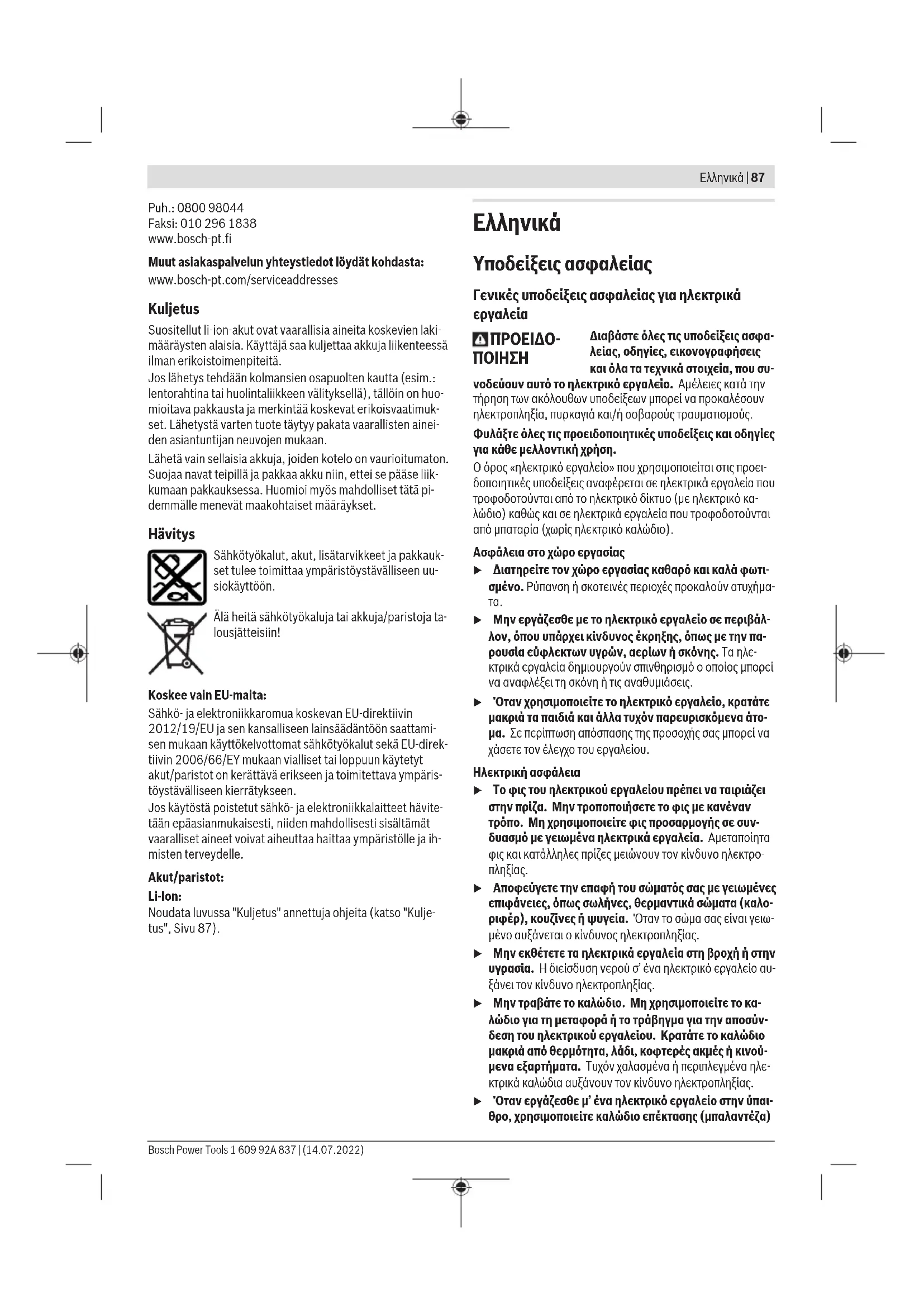 u Χρησιμοποιείτε τα ηλεκτρικά εργαλεία μόνο με τις ειδι- κά σχεδιασμένες μπαταρίες. Η χρήση άλλων μπαταριών μπορεί να οδηγήσει σε τραυματισμούς και να δημιουργήσει κίνδυνο πυρκαγιάς. 1 609 92A 837 | (14.07.2022) Bosch Power ToolsΕλληνικά | 89 u Όταν η μπαταρία δε χρησιμοποιείται, κρατήστε την μα- κριά από άλλα μεταλλικά αντικείμενα, όπως συνδετή- ρες χαρτιών, νομίσματα, κλειδιά, καρφιά, βίδες ή άλλα μικρά μεταλλικά αντικείμενα που μπορούν να βραχυκυ- κλώσουν τις επαφές της μπαταρίας. Ένα βραχυκύκλωμα των επαφών της μπαταρίας μπορεί να προκαλέσει τραυματι- σμούς ή φωτιά. u Μια τυχόν εσφαλμένη χρήση μπορεί να οδηγήσει σε διαρροή υγρών από την μπαταρία. Αποφεύγετε κάθε επαφή μ’ αυτά. Σε περίπτωση τυχαίας επαφής ξεπλύνε- τε καλά με νερό. Εάν τα υγρά έρθουν σε επαφή με τα μάτια, ζητήστε επιπλέον ιατρική βοήθεια. Διαρρέοντα υγρά μπαταρίας μπορεί να οδηγήσουν σε ερεθισμούς του δέρματος ή σε εγκαύματα. u Μην χρησιμοποιείτε μπαταρία ή εργαλείο που είναι κα- τεστραμμένο ή τροποποιημένο. Οι χαλασμένες ή τροπο- ποιημένες μπαταρίες μπορεί να παρουσιάσουν μια απρόβλεπτη συμπεριφορά και να οδηγήσουν σε φωτιά, έκρηξη ή σε κίνδυνο τραυματισμού. u Μην εκθέτετε μια μπαταρία ή ένα εργαλείο μπαταρίας σε φωτιά ή σε πολύ υψηλές θερμοκρασίες. Η έκθεση στη φωτιά ή σε θερμοκρασία πάνω από τους 130 °C μπορεί να προκαλέσει έκρηξη. u Τηρείτε όλες τις υποδείξεις για τη φόρτιση και μη φορ- τίζετε την μπαταρία ή το εργαλείο μπαταρίας ποτέ εκτός της περιοχής θερμοκρασίας που αναφέρεται στις οδηγίες λειτουργίας. Η λάθος φόρτιση ή η φόρτιση εκτός της επιτρεπτής περιοχής θερμοκρασίας μπορεί να κατα- στρέψει την μπαταρία και να αυξήσει τον κίνδυνο πυρκα-