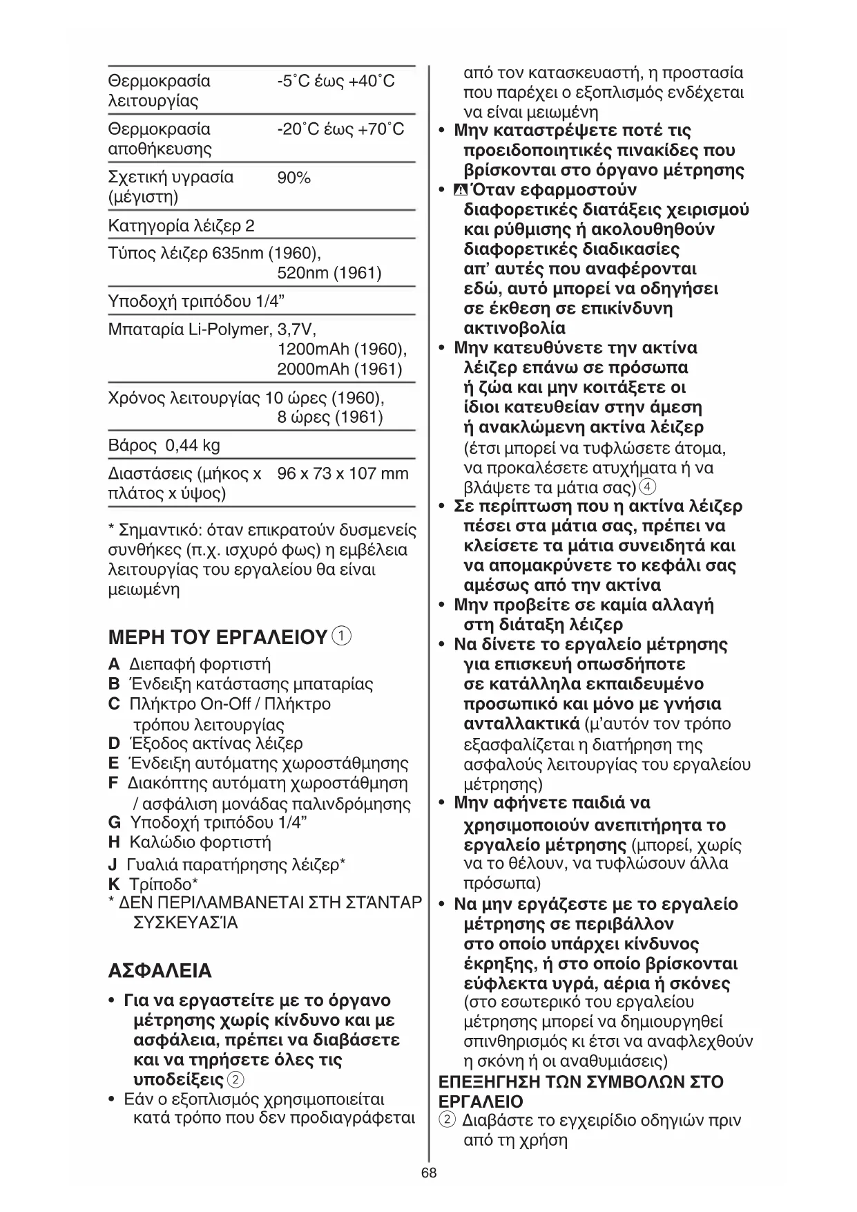 90% Κατηγορία λέιζερ 2 Τύπος λέιζερ 635nm (1960), 520nm (1961) Υποδοχή τριπόδου 1/4” Μπαταρία Li-Polymer, 3,7V, 1200mAh (1960), 2000mAh (1961) Χρόνος λειτουργίας 10 ώρες (1960), 8 ώρες (1961) Bάρος 0,44 kg Διαστάσεις (μήκος x πλάτος x ύψος) 96 x 73 x 107 mm