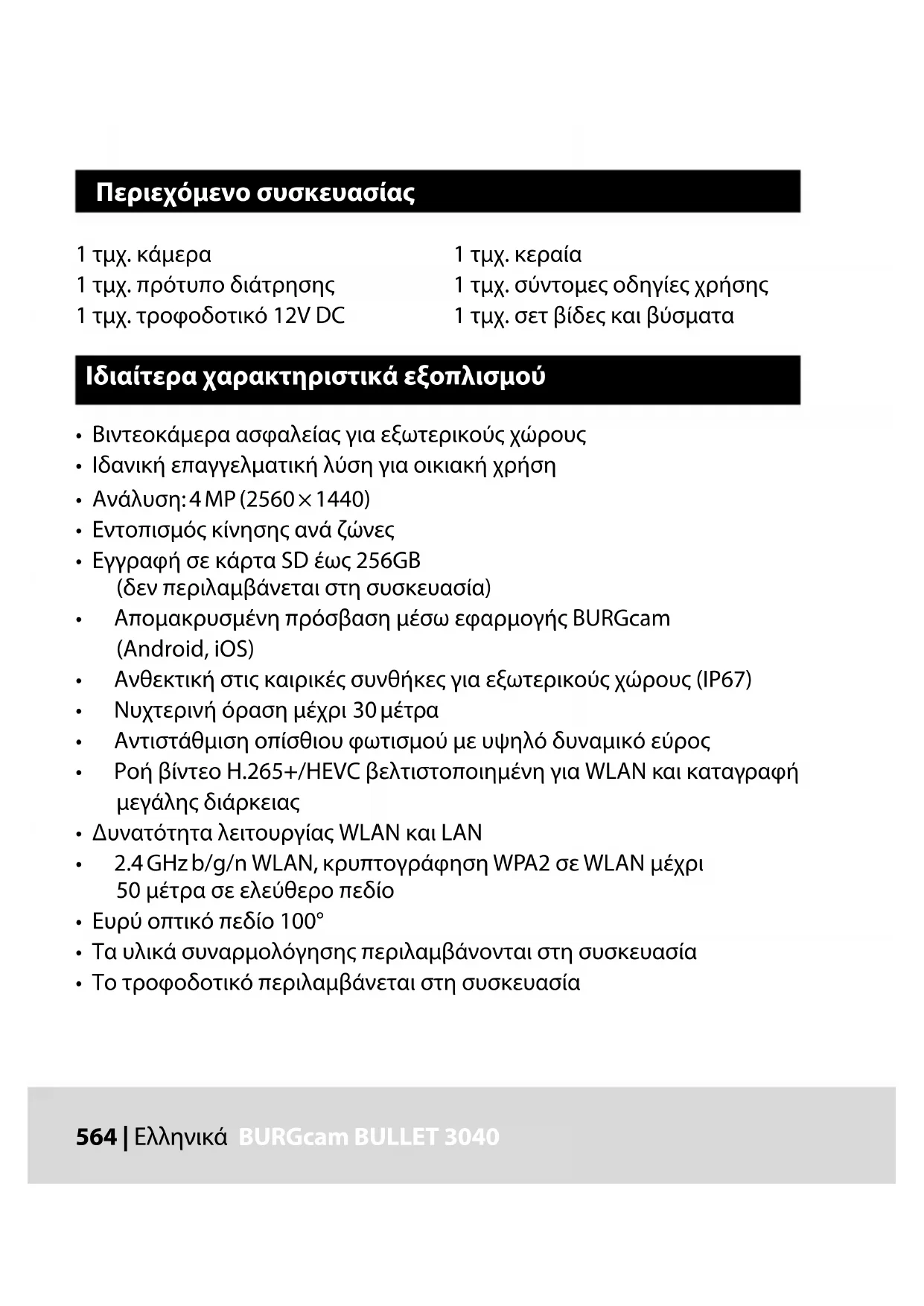 Για αναλυτικές διευκρινίσεις σχετικά με κάθε στοιχείο μενού, ανατρέξτε στο εγχειρίδιο χρήστη. Τύπος κάμερας Σφαιρική κάμερα υπερύθρων (IR) WLAN για εσωτερικούς και εξωτερικούς χώρους Αισθητήρας 1/3” προοδευτική σάρωση 4 MP CMOS Ανάλυση 4 MP: 2560 x 1440 1080 p: 1920 x 1080 (= Full HD) 720 p: 1280 x 720 D1: 704 x 576 / 704 x 480 CIF: 352 x 288 / 352 x 240 Τεχνικά χαρακτηριστικά582 | Ελληνικά BURGcam BULLET 3040 BURGcam BULLET 3040 Ελληνικά | 583 Ρυθμός προβολής 20 fps στα 4 MP, 25 / 30 fps στα 1080 p Προβολέας υπερύθρων Εμβέλεια έως και 30 μέτρα* Φίλτρο φραγής υπερύθρων Μηχανικό Φακός Σταθερός φακός 2,8 mm F2.0 Οπτική γωνία Οριζόντια: 100° Ισορροπία λευκού Αυτόματα WLAN IEEE802.11b / g / n, έως και 50 μέτρα (ελεύθερο πεδίο) LAN (RJ-45) 10 / 100 Base-T Υποστηριζόμενα πρωτόκολλα IPv4 / IPv6, HTTP, HTTPS, TCP / IP, UDP, UPnP, RTSP, RTP, SMTP, NTP, DHCP, DNS, DDNS, FTP, φίλτρο IP Κάρτα micro SD έως και 256 GB, για εγγραφές και στιγμιότυπα Εγκατάσταση Συμπεριλαμβάνεται βάση στήριξης για τοποθέτηση σε τοίχο ή στην οροφή Τάση τροφοδοσίας Στη συσκευασία περιλαμβάνεται τροφοδοτικό 12 V DC. Κατανάλωση ισχύος < 4,8 W Εύρος θερμοκρασίας -30 °C ως +50 °C584 | Ελληνικά BURGcam BULLET 3040 Κατηγορία προστασίας IP67 Διαστάσεις Ø 70 x 165 mm Βάρος 0,45 kg Πρόσθετες λειτουργίες: Αντιστάθμιση κόντρα