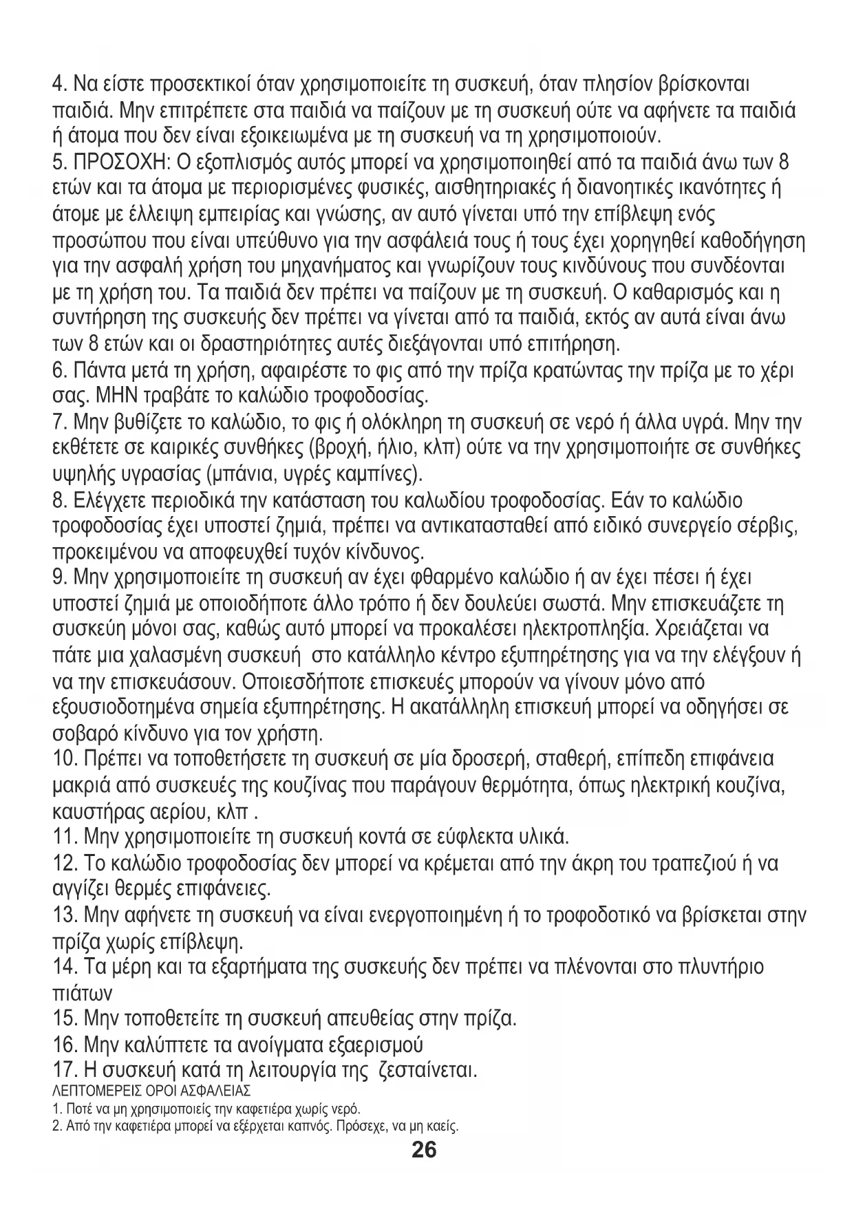 ΠΡΟΣΟΧΗ: Ο εξοπλισμός αυτός μπορεί να χρησιμοποιηθεί από τα παιδιά άνω των 8 ετών και άτομα με περιορισμένες φυσικές, αισθητηριακές ή διανοητικές ικανότητες, ή έλλειψη εμπειρίας και γνώσης, αν αυτό γίνεται υπό την επίβλεψη ενός προσώπου που είναι υπεύθυνο για την ασφάλειά τους ή τους έχουν δοθεί οδηγίες για την ασφαλή χρήση του μηχανήματος και γνωρίζουν τους κινδύνους που συνδέονται με τη χρήση του. Τα παιδιά δεν πρέπει να παίζουν με τη συσκευή. Ο Καθαρισμός και η συντήρηση της συσκευής δεν πρέπει να γίνεται από τα παιδιά, εκτός αν είναι άνω των 8 ετών και οι δραστηριότητες αυτές διεξάγονται υπό εποπτεία. Πριν από τη χρήση της συσκευής να διαβάσετε το εγχειρίδιο και να ακολουθήσετε τις οδηγίες που περιέχονται σε αυτό. Ο κατασκευαστής δεν εγγυάται για τις ζημίες που προκαλούνται από την κακή ή τη λάθος χρήση της συσκευής.
