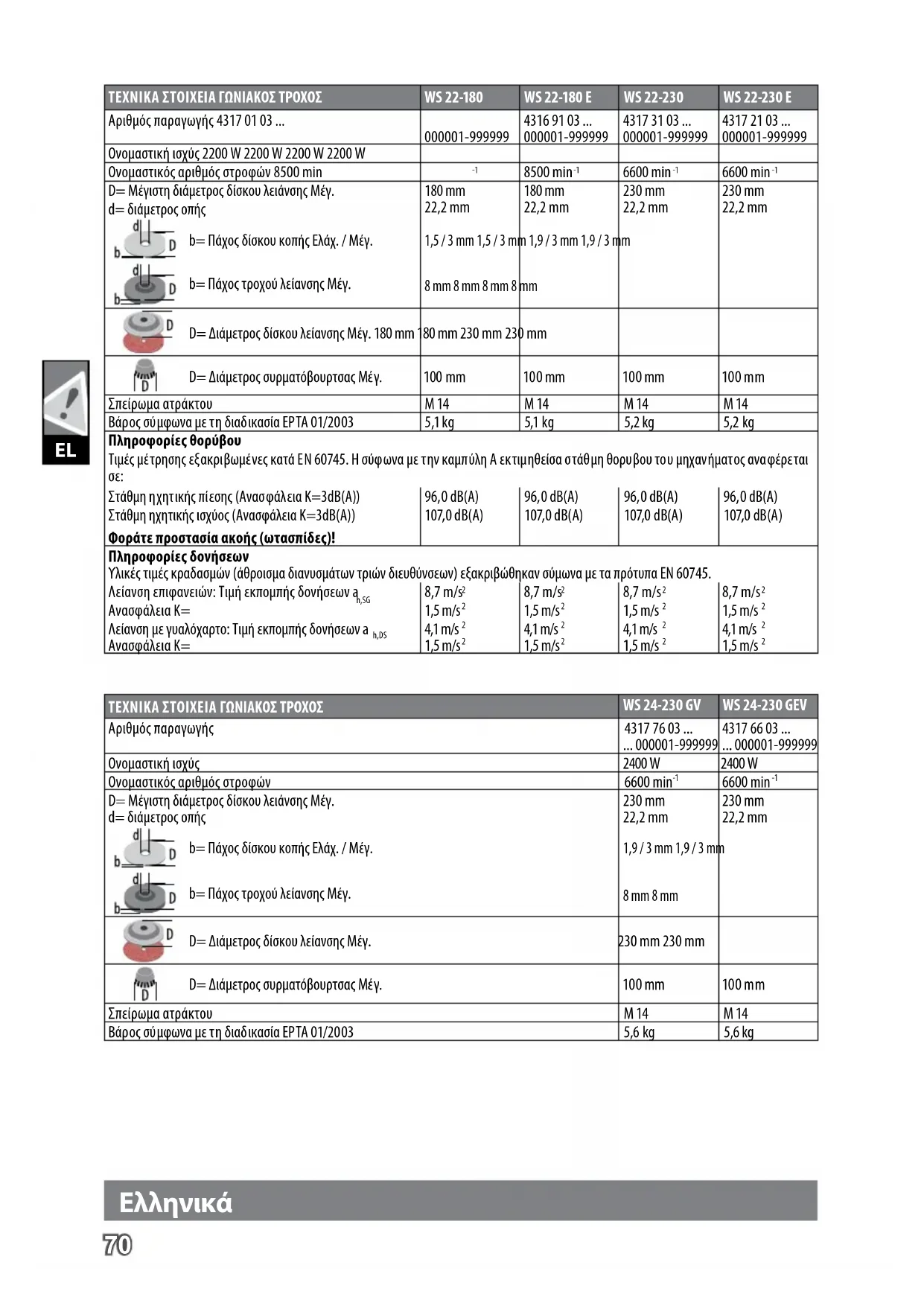 ΤΕΧΝΙΚΑ ΣΤΟΙΧΕΙΑ ΓΩΝΙΑΚΟΣ ΤΡΟΧΟΣ WS 22-180 WS 22-180 E WS 22-230 WS 22-230 E Αριθμός παραγωγής 4317 01 03 ... 000001-999999