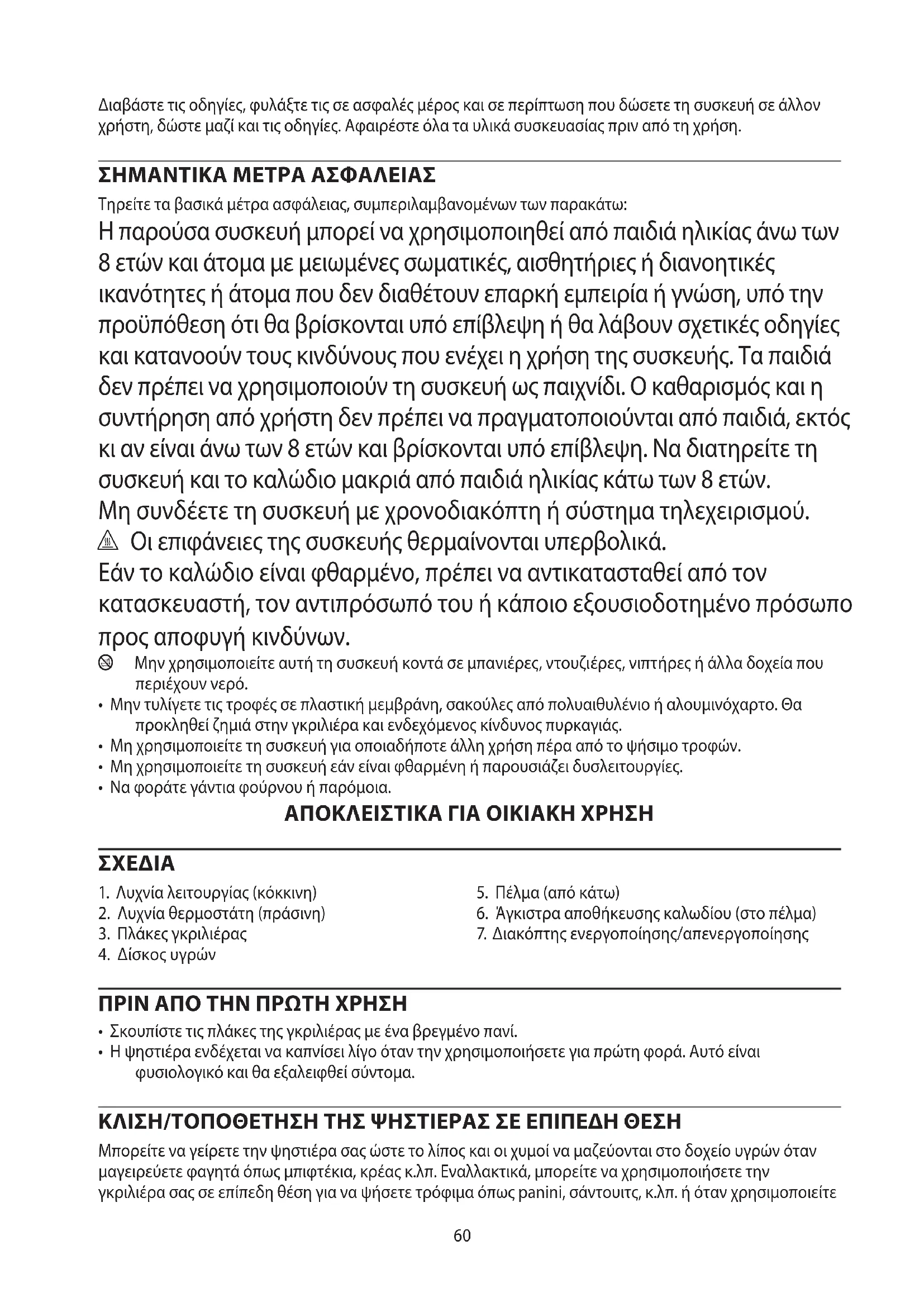 Τηρείτε τα βασικά μέτρα ασφάλειας, συμπεριλαμβανομένων των παρακάτω: Η παρούσα συσκευή μπορεί να χρησιμοποιηθεί από παιδιά ηλικίας άνω των 8 ετών και άτομα με μειωμένες σωματικές, αισθητήριες ή διανοητικές ικανότητες ή άτομα που δεν διαθέτουν επαρκή εμπειρία ή γνώση, υπό την προϋπόθεση ότι θα βρίσκονται υπό επίβλεψη ή θα λάβουν σχετικές οδηγίες και κατανοούν τους κινδύνους που ενέχει η χρήση της συσκευής. Τα παιδιά δεν πρέπει να χρησιμοποιούν τη συσκευή ως παιχνίδι. Ο καθαρισμός και η συντήρηση από χρήστη δεν πρέπει να πραγματοποιούνται από παιδιά, εκτός κι αν είναι άνω των 8 ετών και βρίσκονται υπό επίβλεψη. Να διατηρείτε τη συσκευή και το καλώδιο μακριά από παιδιά ηλικίας κάτω των 8 ετών. Μη συνδέετε τη συσκευή με χρονοδιακόπτη ή σύστημα τηλεχειρισμού. ¬ Οι επιφάνειες της συσκευής θερμαίνονται υπερβολικά. Εάν το καλώδιο είναι φθαρμένο, πρέπει να αντικατασταθεί από τον κατασκευαστή, τον αντιπρόσωπό του ή κάποιο εξουσιοδοτημένο πρόσωπο προς αποφυγή κινδύνων. b Μην χρησιμοποιείτε αυτή τη συσκευή κοντά σε μπανιέρες, ντουζιέρες, νιπτήρες ή άλλα δοχεία που περιέχουν νερό.