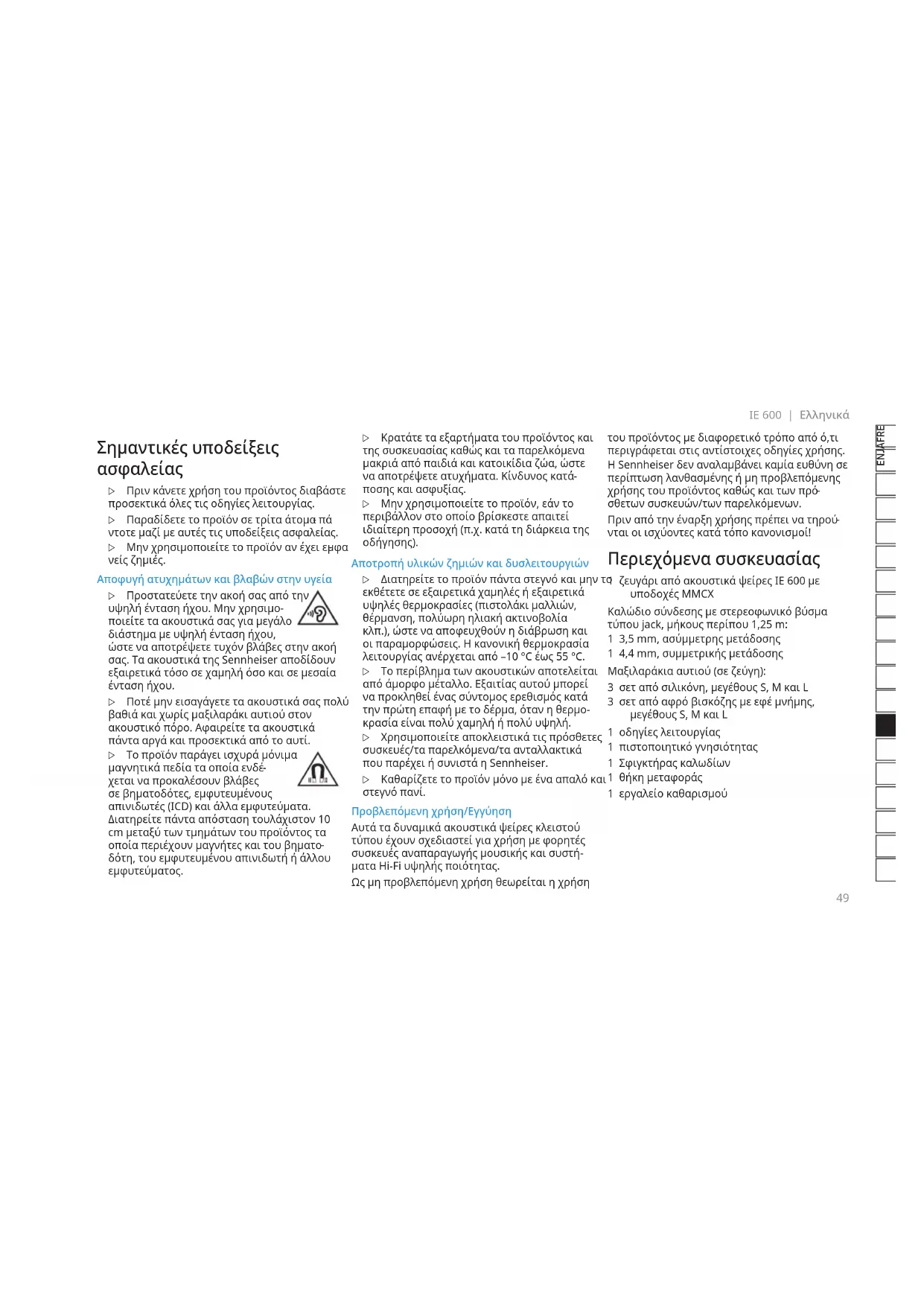ματα Hi-Fi υψηλής ποιότητας. Ως μη προβλεπόμενη χρήση θεωρείται η χρήση του προϊόντος με διαφορετικό τρόπο από ό,τι περιγράφεται στις αντίστοιχες οδηγίες χρήσης. Η Sennheiser δεν αναλαμβάνει καμία ευθύνη σε περίπτωση λανθασμένης ή μη προβλεπόμενης χρήσης του προϊόντος καθώς και των πρό