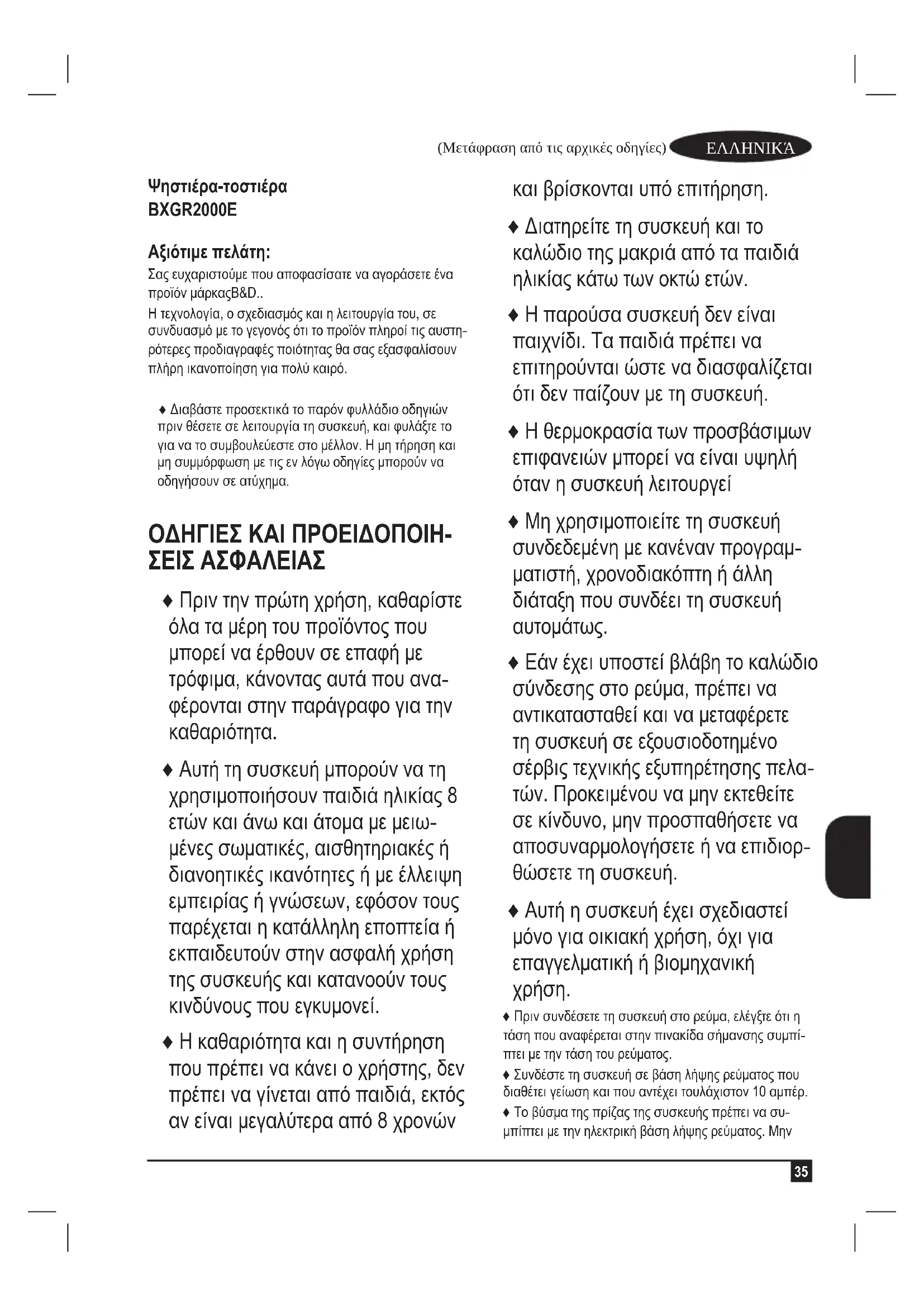 Ψηστιέρα-τοστιέρα BXGR2000E Αξιότιμε πελάτη: Σας ευχαριστούμε που αποφασίσατε να αγοράσετε ένα προϊόν μάρκαςB&D.. Η τεχνολογία, ο σχεδιασμός και η λειτουργία του, σε συνδυασμό με το γεγονός ότι το προϊόν πληροί τις αυστη- ρότερες προδιαγραφές ποιότητας θα σας εξασφαλίσουν πλήρη ικανοποίηση για πολύ καιρό. ♦ Διαβάστε προσεκτικά το παρόν φυλλάδιο οδηγιών πριν θέσετε σε λειτουργία τη συσκευή, και φυλάξτε το για να το συμβουλεύεστε στο μέλλον. Η μη τήρηση και μη συμμόρφωση με τις εν λόγω οδηγίες μπορούν να οδηγήσουν σε ατύχημα. ΟΔΗΓΊΕΣ ΚΑΊ ΠΡΟΕΊΔΟΠΟΊΗ- ΣΕΊΣ ΑΣΦΑΛΕΊΑΣ ♦ Πριν την πρώτη χρήση, καθαρίστε όλα τα μέρη του προϊόντος που μπορεί να έρθουν σε επαφή με τρόφιμα, κάνοντας αυτά που ανα- φέρονται στην παράγραφο για την καθαριότητα. ♦ Αυτή τη συσκευή μπορούν να τη χρησιμοποιήσουν παιδιά ηλικίας 8 ετών και άνω και άτομα με μειω- μένες σωματικές, αισθητηριακές ή διανοητικές ικανότητες ή με έλλειψη εμπειρίας ή γνώσεων, εφόσον τους παρέχεται η κατάλληλη εποπτεία ή εκπαιδευτούν στην ασφαλή χρήση της συσκευής και κατανοούν τους κινδύνους που εγκυμονεί. ♦ Η καθαριότητα και η συντήρηση που πρέπει να κάνει ο χρήστης, δεν πρέπει να γίνεται από παιδιά, εκτός αν είναι μεγαλύτερα από 8 χρονών και βρίσκονται υπό επιτήρηση. ♦ Διατηρείτε τη συσκευή και το καλώδιο της μακριά από τα παιδιά ηλικίας κάτω των οκτώ ετών. ♦ Η παρούσα συσκευή δεν είναι παιχνίδι. Τα παιδιά πρέπει να επιτηρούνται ώστε να διασφαλίζεται ότι δεν παίζουν με τη συσκευή. ♦ Η θερμοκρασία των προσβάσιμων επιφανειών μπορεί να είναι υψηλή όταν η συσκευή λειτουργεί ♦ Μη χρησιμοποιείτε τη συσκευή συνδεδεμένη με κανέναν προγραμ- ματιστή, χρονοδιακόπτη ή άλλη διάταξη που συνδέει τη συσκευή
