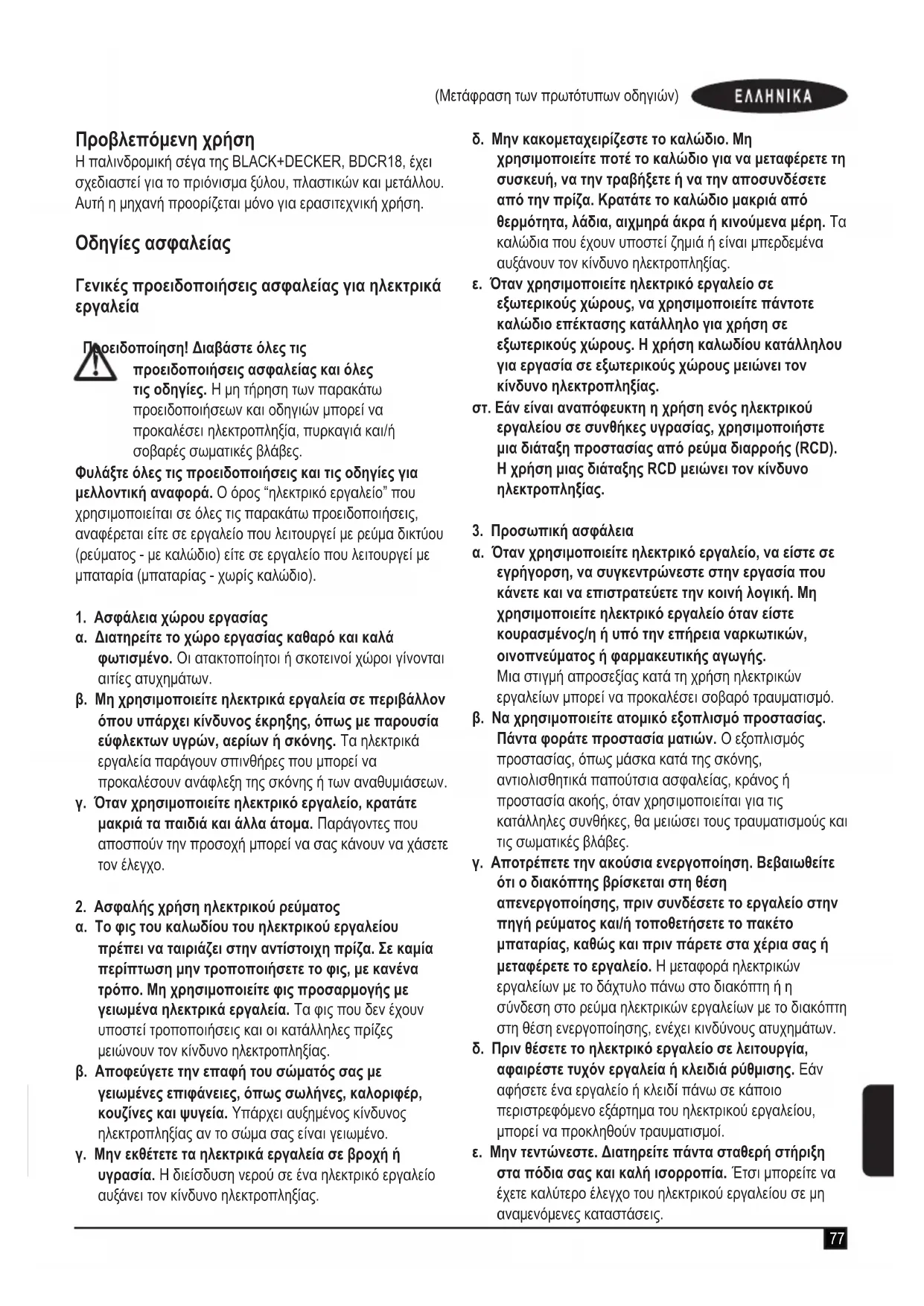 1.5-277 (Μετάφραση των πρωτότυπων οδηγιών) Προβλεπόμενη χρήση Η παλινδρομική σέγα της BLACK+DECKER, BDCR18, έχει σχεδιαστεί για το πριόνισμα ξύλου, πλαστικών και μετάλλου. Αυτή η μηχανή προορίζεται μόνο για ερασιτεχνική χρήση. Οδηγίες ασφαλείας Γενικές προειδοποιήσεις ασφαλείας για ηλεκτρικά