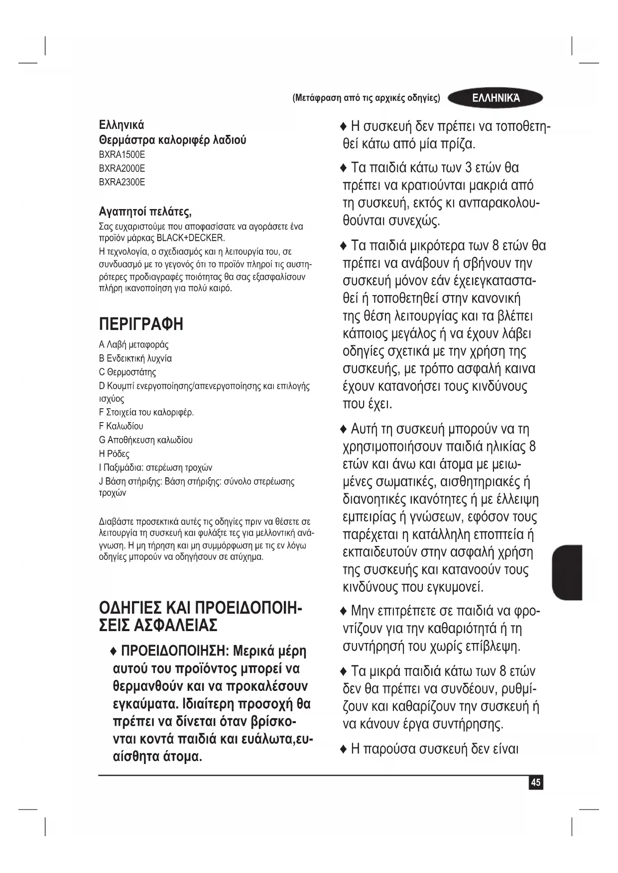 Θερμάστρα καλοριφέρ λαδιού BXRA1500E BXRA2000E BXRA2300E Αγαπητοί πελάτες, Σας ευχαριστούμε που αποφασίσατε να αγοράσετε ένα προϊόν μάρκας BLACK+DECKER. Η τεχνολογία, ο σχεδιασμός και η λειτουργία του, σε συνδυασμό με το γεγονός ότι το προϊόν πληροί τις αυστη- ρότερες προδιαγραφές ποιότητας θα σας εξασφαλίσουν πλήρη ικανοποίηση για πολύ καιρό.