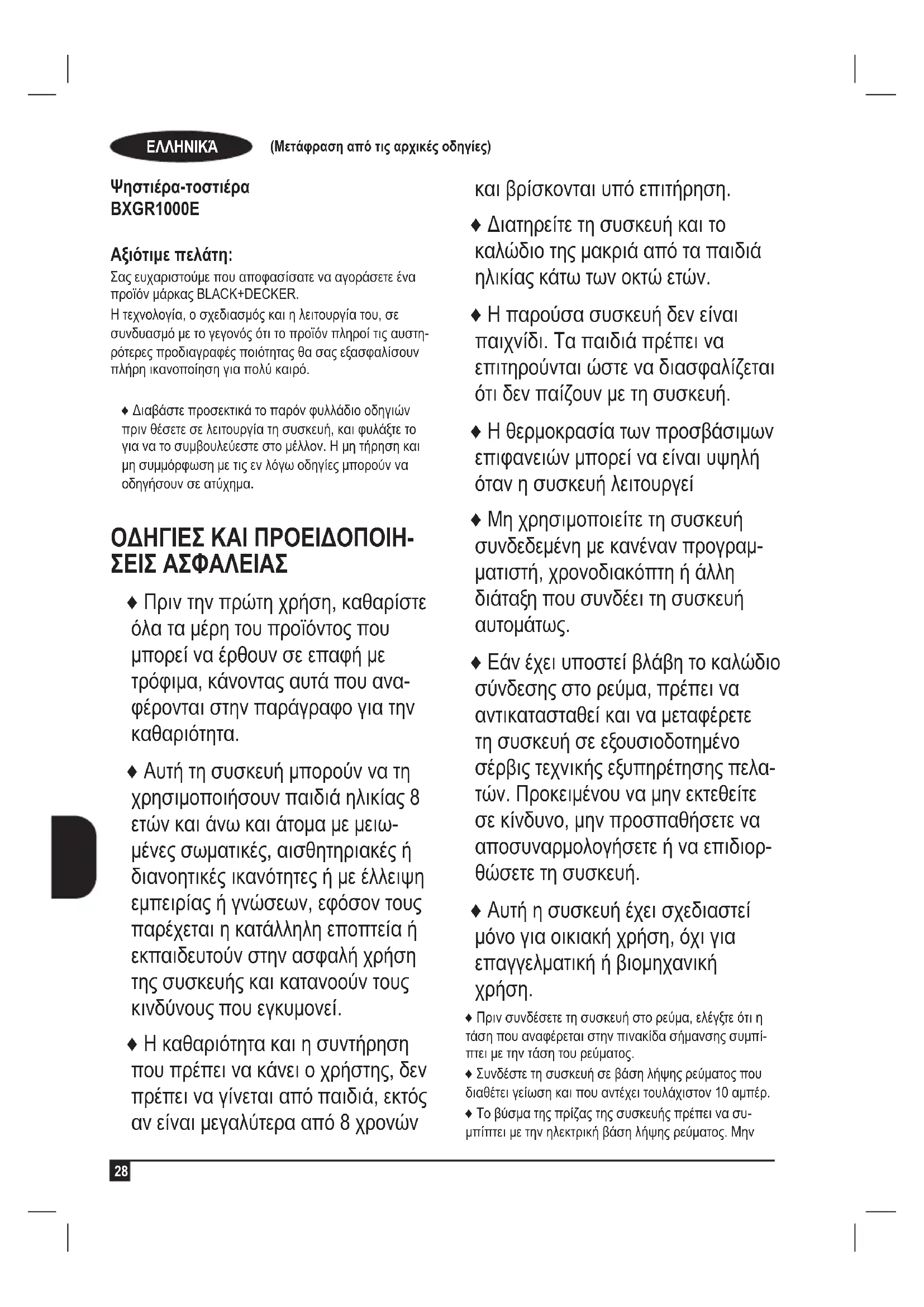 Ψηστιέρα-τοστιέρα BXGR1000E Αξιότιμε πελάτη: Σας ευχαριστούμε που αποφασίσατε να αγοράσετε ένα προϊόν μάρκας BLACK+DECKER. Η τεχνολογία, ο σχεδιασμός και η λειτουργία του, σε συνδυασμό με το γεγονός ότι το προϊόν πληροί τις αυστη- ρότερες προδιαγραφές ποιότητας θα σας εξασφαλίσουν πλήρη ικανοποίηση για πολύ καιρό. ♦ Διαβάστε προσεκτικά το παρόν φυλλάδιο οδηγιών πριν θέσετε σε λειτουργία τη συσκευή, και φυλάξτε το για να το συμβουλεύεστε στο μέλλον. Η μη τήρηση και μη συμμόρφωση με τις εν λόγω οδηγίες μπορούν να οδηγήσουν σε ατύχημα. ΟΔΗΓΊΕΣ ΚΑΊ ΠΡΟΕΊΔΟΠΟΊΗ- ΣΕΊΣ ΑΣΦΑΛΕΊΑΣ ♦ Πριν την πρώτη χρήση, καθαρίστε όλα τα μέρη του προϊόντος που μπορεί να έρθουν σε επαφή με τρόφιμα, κάνοντας αυτά που ανα- φέρονται στην παράγραφο για την καθαριότητα. ♦ Αυτή τη συσκευή μπορούν να τη χρησιμοποιήσουν παιδιά ηλικίας 8 ετών και άνω και άτομα με μειω- μένες σωματικές, αισθητηριακές ή διανοητικές ικανότητες ή με έλλειψη εμπειρίας ή γνώσεων, εφόσον τους παρέχεται η κατάλληλη εποπτεία ή εκπαιδευτούν στην ασφαλή χρήση της συσκευής και κατανοούν τους κινδύνους που εγκυμονεί. ♦ Η καθαριότητα και η συντήρηση που πρέπει να κάνει ο χρήστης, δεν πρέπει να γίνεται από παιδιά, εκτός αν είναι μεγαλύτερα από 8 χρονών και βρίσκονται υπό επιτήρηση. ♦ Διατηρείτε τη συσκευή και το καλώδιο της μακριά από τα παιδιά ηλικίας κάτω των οκτώ ετών. ♦ Η παρούσα συσκευή δεν είναι παιχνίδι. Τα παιδιά πρέπει να επιτηρούνται ώστε να διασφαλίζεται ότι δεν παίζουν με τη συσκευή. ♦ Η θερμοκρασία των προσβάσιμων επιφανειών μπορεί να είναι υψηλή όταν η συσκευή λειτουργεί ♦ Μη χρησιμοποιείτε τη συσκευή συνδεδεμένη με κανέναν προγραμ- ματιστή, χρονοδιακόπτη ή άλλη διάταξη που συνδέει τη συσκευή