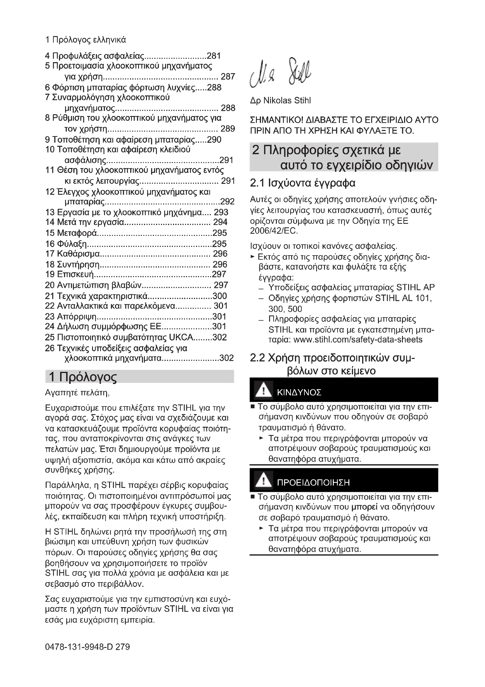 - 26 Τεχνικές υποδείξεις ασφαλείας για χλοοκοπτικά μηχανήματα 1 Πρόλογος Αγαπητέ πελάτη, Ευχαριστούμε που επιλέξατε την STIHL για την αγορά σας. Στόχος μας είναι να σχεδιάζουμε και να κατασκευάζουμε προϊόντα κορυφαίας ποιότη‐ τας, που ανταποκρίνονται στις ανάγκες των πελατών μας. Έτσι δημιουργούμε προϊόντα με υψηλή αξιοπιστία, ακόμα και κάτω από ακραίες συνθήκες χρήσης. Παράλληλα, η STIHL παρέχει σέρβις κορυφαίας ποιότητας. Οι πιστοποιημένοι αντιπρόσωποί μας μπορούν να σας προσφέρουν έγκυρες συμβου‐ λές, εκπαίδευση και πλήρη τεχνική υποστήριξη. Η STIHL δηλώνει ρητά την προσήλωσή της στη βιώσιμη και υπεύθυνη χρήση των φυσικών πόρων. Οι παρούσες οδηγίες χρήσης θα σας βοηθήσουν να χρησιμοποιήσετε το προϊόν STIHL σας για πολλά χρόνια με ασφάλεια και με σεβασμό στο περιβάλλον. Σας ευχαριστούμε για την εμπιστοσύνη και ευχό‐ μαστε η χρήση των προϊόντων STIHL να είναι για εσάς μια ευχάριστη εμπειρία. Δρ Nikolas Stihl ΣΗΜΑΝΤΙΚΟ! ΔΙΑΒΑΣΤΕ ΤΟ ΕΓΧΕΙΡΙΔΙΟ ΑΥΤΟ ΠΡΙΝ ΑΠΟ ΤΗ ΧΡΗΣΗ ΚΑΙ ΦΥΛΑΞΤΕ ΤΟ. 2 Πληροφορίες σχετικά με αυτό το εγχειρίδιο οδηγιών p. 302