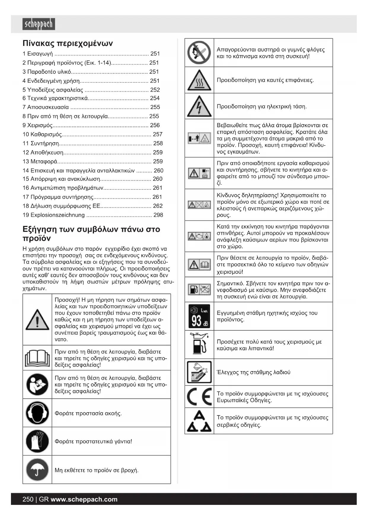 Προσέχετε πολύ κατά τους χειρισμούς με καύσιμα και λιπαντικά! Έλεγχος της στάθμης λαδιού Το προϊόν συμμορφώνεται με τις ισχύουσες Ευρωπαϊκές Οδηγίες. Το προϊόν συμμορφώνεται με τις ισχύουσες σερβικές οδηγίες. 250 | GR www.scheppach.com1 Εισαγωγή Κατασκευαστής: Scheppach GmbH Günzburger Straße 69 D-89335 Ichenhausen Αξιότιμε πελάτη Σας ευχόμαστε να απολαύσετε κατά την εργασία σας το νέο σας προϊόν.
