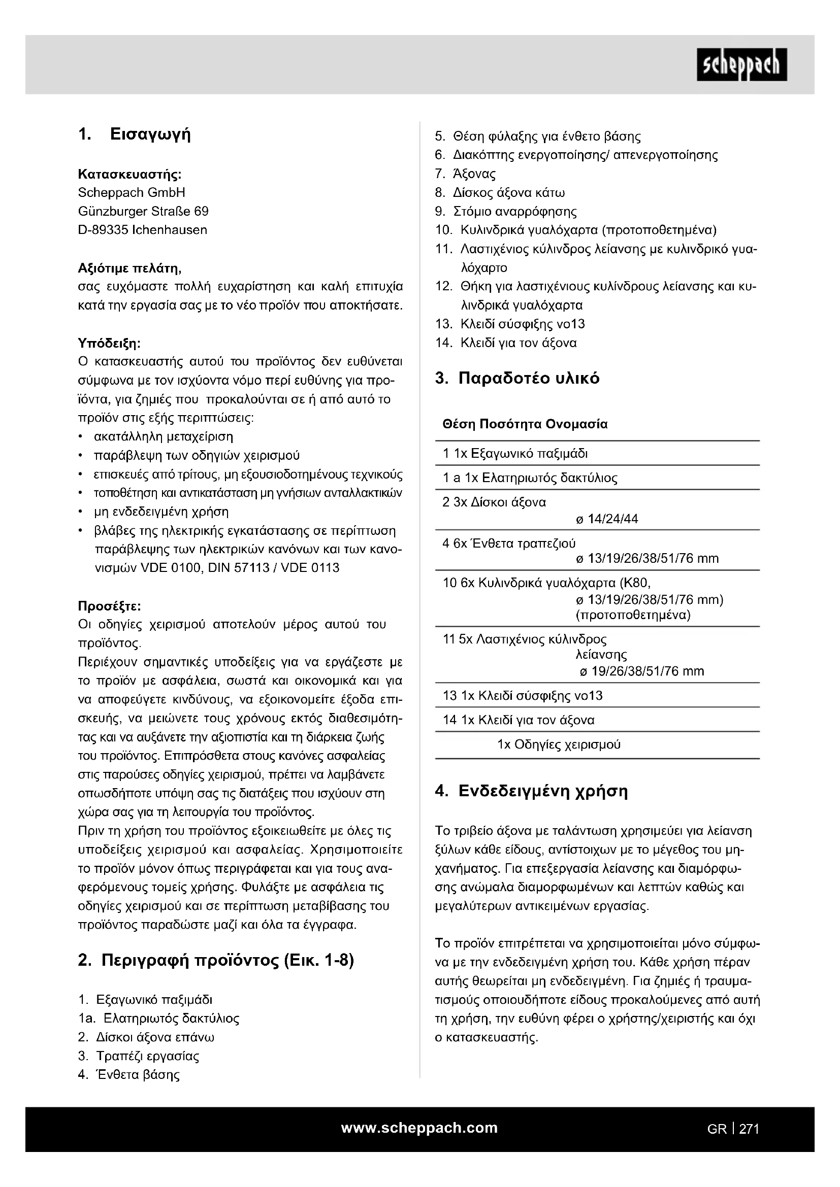 Κατασκευαστής: Scheppach GmbH Günzburger Straße 69 D-89335 Ichenhausen Αξιότιμε πελάτη, σας ευχόμαστε πολλή ευχαρίστηση και καλή επιτυχία κατά την εργασία σας με το νέο προϊόν που αποκτήσατε.