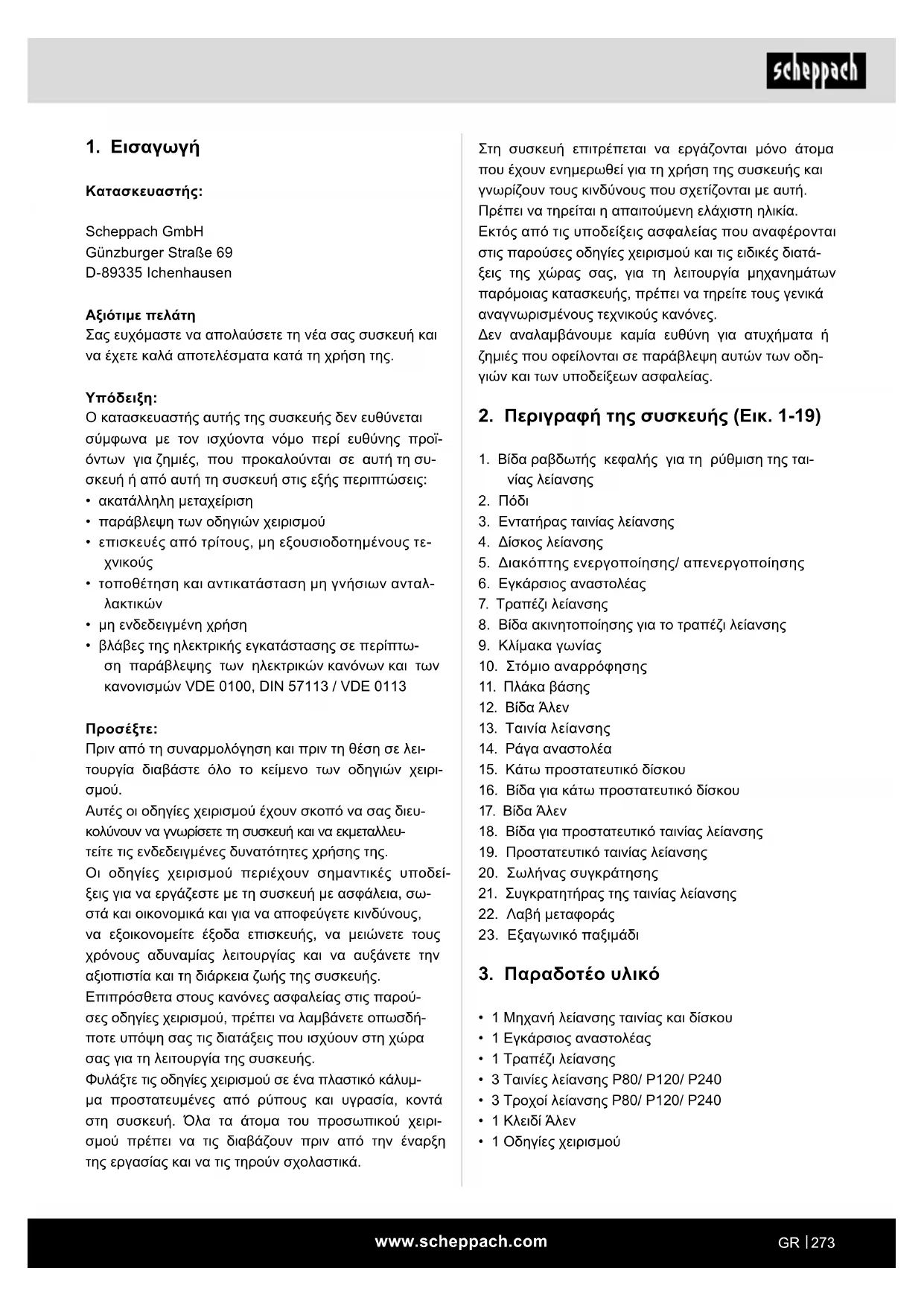 Αυτές οι οδηγίες χειρισμού έχουν σκοπό να σας διευ- κολύνουν να γνωρίσετε τη συσκευή και να εκμεταλλευ- τείτε τις ενδεδειγμένες δυνατότητες χρήσης της. Οι οδηγίες χειρισμού περιέχουν σημαντικές υποδεί- ξεις για να εργάζεστε με τη συσκευή με ασφάλεια, σω- στά και οικονομικά και για να αποφεύγετε κινδύνους, να εξοικονομείτε έξοδα επισκευής, να μειώνετε τους χρόνους αδυναμίας λειτουργίας και να αυξάνετε την αξιοπιστία και τη διάρκεια ζωής της συσκευής. Επιπρόσθετα στους κανόνες ασφαλείας στις παρού- σες οδηγίες χειρισμού, πρέπει να λαμβάνετε οπωσδή- ποτε υπόψη σας τις διατάξεις που ισχύουν στη χώρα σας για τη λειτουργία της συσκευής. Φυλάξτε τις οδηγίες χειρισμού σε ένα πλαστικό κάλυμ- μα προστατευμένες από ρύπους και υγρασία, κοντά στη συσκευή. Όλα τα άτομα του προσωπικού χειρι- σμού πρέπει να τις διαβάζουν πριν από την έναρξη της εργασίας και να τις τηρούν σχολαστικά.www.scheppach.com