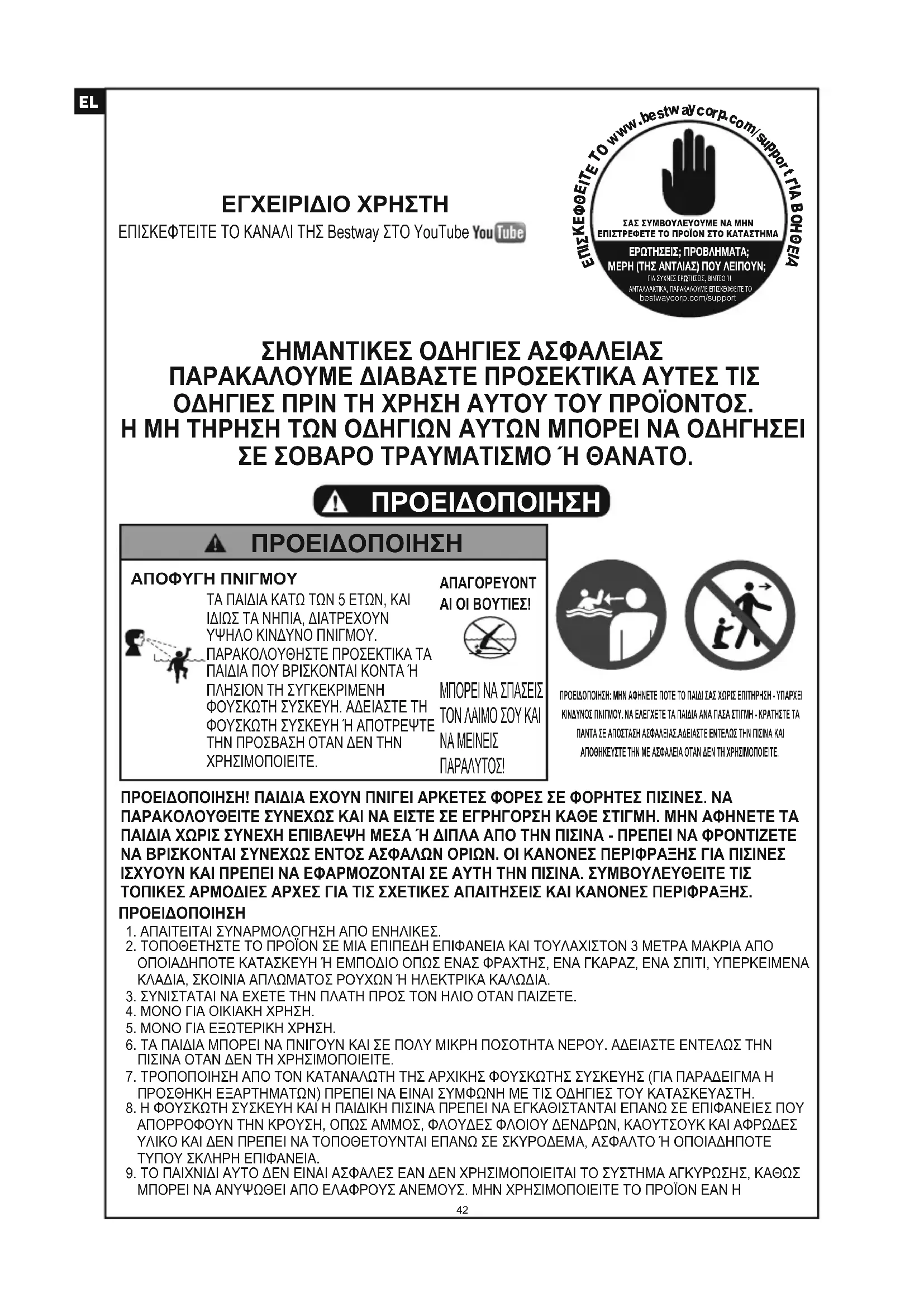 ΣΗΜΑΝΤΙΚΕΣ ΟΔΗΓΙΕΣ ΑΣΦΑΛΕΙΑΣΠΑΡΑΚΑΛΟΥΜΕ ΔΙΑΒΑΣΤΕ ΠΡΟΣΕΚΤΙΚΑ ΑΥΤΕΣ ΤΙΣ ΟΔΗΓΙΕΣ ΠΡΙΝ ΤΗ ΧΡΗΣΗ ΑΥΤΟΥ ΤΟΥ ΠΡΟΪΟΝΤΟΣ.Η ΜΗ ΤΗΡΗΣΗ ΤΩΝ ΟΔΗΓΙΩΝ ΑΥΤΩΝ ΜΠΟΡΕΙ ΝΑ ΟΔΗΓΗΣΕΙΣΕ ΣΟΒΑΡΟ ΤΡΑΥΜΑΤΙΣΜΟ Ή ΘΑΝΑΤΟ.ΠΡΟΕΙΔΟΠΟΙΗΣΗΠΡΟΕΙΔΟΠΟΙΗΣΗ! ΠΑΙΔΙΑ ΕΧΟΥΝ ΠΝΙΓΕΙ ΑΡΚΕΤΕΣ ΦΟΡΕΣ ΣΕ ΦΟΡΗΤΕΣ ΠΙΣΙΝΕΣ. ΝΑ ΠΑΡΑΚΟΛΟΥΘΕΙΤΕ ΣΥΝΕΧΩΣ ΚΑΙ ΝΑ ΕΙΣΤΕ ΣΕ ΕΓΡΗΓΟΡΣΗ ΚΑΘΕ ΣΤΙΓΜΗ. ΜΗΝ ΑΦΗΝΕΤΕ ΤΑ ΠΑΙΔΙΑ ΧΩΡΙΣ ΣΥΝΕΧΗ ΕΠΙΒΛΕΨΗ ΜΕΣΑ Ή ΔΙΠΛΑ ΑΠΟ ΤΗΝ ΠΙΣΙΝΑ - ΠΡΕΠΕΙ ΝΑ ΦΡΟΝΤΙΖΕΤΕ ΝΑ ΒΡΙΣΚΟΝΤΑΙ ΣΥΝΕΧΩΣ ΕΝΤΟΣ ΑΣΦΑΛΩΝ ΟΡΙΩΝ. ΟΙ ΚΑΝΟΝΕΣ ΠΕΡΙΦΡΑΞΗΣ ΓΙΑ ΠΙΣΙΝΕΣ ΙΣΧΥΟΥΝ ΚΑΙ ΠΡΕΠΕΙ ΝΑ ΕΦΑΡΜΟΖΟΝΤΑΙ ΣΕ ΑΥΤΗ ΤΗΝ ΠΙΣΙΝΑ. ΣΥΜΒΟΥΛΕΥΘΕΙΤΕ ΤΙΣ ΤΟΠΙΚΕΣ ΑΡΜΟΔΙΕΣ ΑΡΧΕΣ ΓΙΑ ΤΙΣ ΣΧΕΤΙΚΕΣ ΑΠΑΙΤΗΣΕΙΣ ΚΑΙ ΚΑΝΟΝΕΣ ΠΕΡΙΦΡΑΞΗΣ.ΠΡΟΕΙΔΟΠΟΙΗΣΗ: ΜΗΝ ΑΦΗΝΕΤΕ ΠΟΤΕ ΤΟ ΠΑΙΔΙ ΣΑΣ ΧΩΡΙΣ ΕΠΙΤΗΡΗΣΗ - ΥΠΑΡΧΕΙ ΚΙΝΔΥΝΟΣ ΠΝΙΓΜΟΥ. ΝΑ ΕΛΕΓΧΕΤΕ ΤΑ ΠΑΙΔΙΑ ΑΝΑ ΠΑΣΑ ΣΤΙΓΜΗ - ΚΡΑΤΗΣΤΕ ΤΑ ΠΑΝΤΑ ΣΕ ΑΠΟΣΤΑΣΗ ΑΣΦΑΛΕΙΑΣ.ΑΔΕΙΑΣΤΕ ΕΝΤΕΛΩΣ ΤΗΝ ΠΙΣΙΝΑ ΚΑΙ ΑΠΟΘΗΚΕΥΣΤΕ ΤΗΝ ΜΕ ΑΣΦΑΛΕΙΑ ΟΤΑΝ ΔΕΝ ΤΗ ΧΡΗΣΙΜΟΠΟΙΕΙΤΕ.ΠΡΟΕΙΔΟΠΟΙΗΣΗ 1. ΑΠΑΙΤΕΙΤΑΙ ΣΥΝΑΡΜΟΛΟΓΗΣΗ ΑΠΟ ΕΝΗΛΙΚΕΣ. 2. ΤΟΠΟΘΕΤΗΣΤΕ ΤΟ ΠΡΟΪΟΝ ΣΕ ΜΙΑ ΕΠΙΠΕΔΗ ΕΠΙΦΑΝΕΙΑ ΚΑΙ ΤΟΥΛΑΧΙΣΤΟΝ 3 ΜΕΤΡΑ ΜΑΚΡΙΑ ΑΠΟ ΟΠΟΙΑΔΗΠΟΤΕ ΚΑΤΑΣΚΕΥΗ Ή ΕΜΠΟΔΙΟ ΟΠΩΣ ΕΝΑΣ ΦΡΑΧΤΗΣ, ΕΝΑ ΓΚΑΡΑΖ, ΕΝΑ ΣΠΙΤΙ, ΥΠΕΡΚΕΙΜΕΝΑ ΚΛΑΔΙΑ, ΣΚΟΙΝΙΑ ΑΠΛΩΜΑΤΟΣ ΡΟΥΧΩΝ Ή ΗΛΕΚΤΡΙΚΑ ΚΑΛΩΔΙΑ. 3. ΣΥΝΙΣΤΑΤΑΙ ΝΑ ΕΧΕΤΕ ΤΗΝ ΠΛΑΤΗ ΠΡΟΣ ΤΟΝ ΗΛΙΟ ΟΤΑΝ ΠΑΙΖΕΤΕ. 4. ΜΟΝΟ ΓΙΑ ΟΙΚΙΑΚΗ ΧΡΗΣΗ. 5. ΜΟΝΟ ΓΙΑ ΕΞΩΤΕΡΙΚΗ ΧΡΗΣΗ. 6. ΤΑ ΠΑΙΔΙΑ ΜΠΟΡΕΙ ΝΑ ΠΝΙΓΟΥΝ ΚΑΙ ΣΕ ΠΟΛΥ ΜΙΚΡΗ ΠΟΣΟΤΗΤΑ ΝΕΡΟΥ. ΑΔΕΙΑΣΤΕ ΕΝΤΕΛΩΣ ΤΗΝ ΠΙΣΙΝΑ ΟΤΑΝ ΔΕΝ ΤΗ ΧΡΗΣΙΜΟΠΟΙΕΙΤΕ. 7. ΤΡΟΠΟΠΟΙΗΣΗ ΑΠΟ ΤΟΝ ΚΑΤΑΝΑΛΩΤΗ ΤΗΣ ΑΡΧΙΚΗΣ ΦΟΥΣΚΩΤΗΣ ΣΥΣΚΕΥΗΣ (ΓΙΑ ΠΑΡΑΔΕΙΓΜΑ Η ΠΡΟΣΘΗΚΗ ΕΞΑΡΤΗΜΑΤΩΝ) ΠΡΕΠΕΙ ΝΑ ΕΙΝΑΙ ΣΥΜΦΩΝΗ ΜΕ ΤΙΣ ΟΔΗΓΙΕΣ ΤΟΥ ΚΑΤΑΣΚΕΥΑΣΤΗ. 8. Η ΦΟΥΣΚΩΤΗ ΣΥΣΚΕΥΗ ΚΑΙ Η ΠΑΙΔΙΚΗ ΠΙΣΙΝΑ ΠΡΕΠΕΙ ΝΑ ΕΓΚΑΘΙΣΤΑΝΤΑΙ ΕΠΑΝΩ ΣΕ ΕΠΙΦΑΝΕΙΕΣ ΠΟΥ ΑΠΟΡΡΟΦΟΥΝ ΤΗΝ ΚΡΟΥΣΗ, ΟΠΩΣ ΑΜΜΟΣ, ΦΛΟΥΔΕΣ ΦΛΟΙΟΥ ΔΕΝΔΡΩΝ, ΚΑΟΥΤΣΟΥΚ ΚΑΙ ΑΦΡΩΔΕΣ ΥΛΙΚΟ ΚΑΙ ΔΕΝ ΠΡΕΠΕΙ ΝΑ ΤΟΠΟΘΕΤΟΥΝΤΑΙ ΕΠΑΝΩ ΣΕ ΣΚΥΡΟΔΕΜΑ, ΑΣΦΑΛΤΟ Ή ΟΠΟΙΑΔΗΠΟΤΕ ΤΥΠΟΥ ΣΚΛΗΡΗ ΕΠΙΦΑΝΕΙΑ. 9. ΤΟ ΠΑΙΧΝΙΔΙ ΑΥΤΟ ΔΕΝ ΕΙΝΑΙ ΑΣΦΑΛΕΣ ΕΑΝ ΔΕΝ ΧΡΗΣΙΜΟΠΟΙΕΙΤΑΙ ΤΟ ΣΥΣΤΗΜΑ ΑΓΚΥΡΩΣΗΣ, ΚΑΘΩΣ ΜΠΟΡΕΙ ΝΑ ΑΝΥΨΩΘΕΙ ΑΠΟ ΕΛΑΦΡΟΥΣ ΑΝΕΜΟΥΣ. ΜΗΝ ΧΡΗΣΙΜΟΠΟΙΕΙΤΕ ΤΟ ΠΡΟΪΟΝ ΕΑΝ Η ΤΑΧΥΤΗΤΑ ΤΟΥ ΑΝΕΜΟΥ ΥΠΕΡΒΑΙΝΕΙ ΤΑ 20 ΜΑΩ [ΜΙΛΙΑ ΑΝΑ ΩΡΑ].