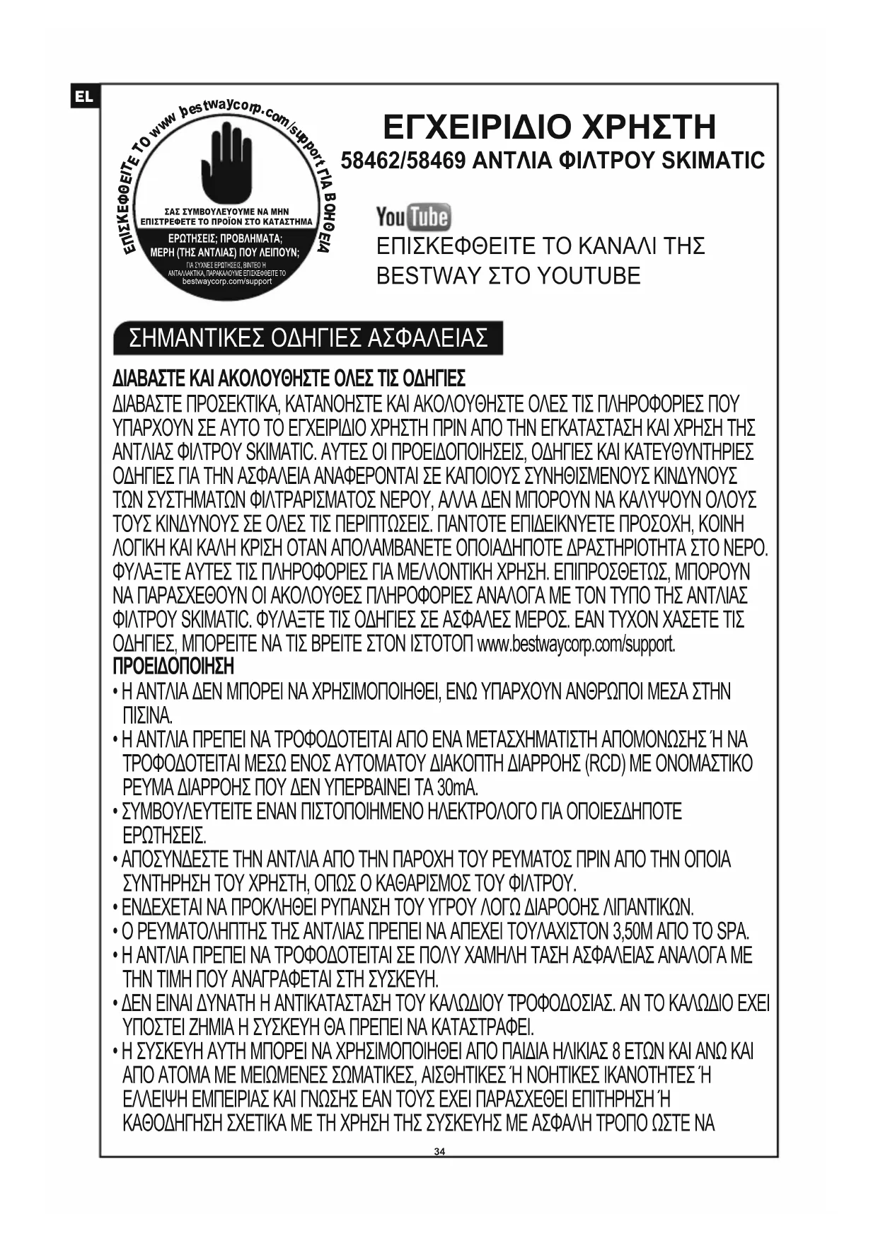 ΕΠΙΣΚΕΦΘΕΙΤΕ ΤΟ ΚΑΝΑΛΙ ΤΗΣ BESTWAY ΣΤΟ YOUTUBE ΕΓΧΕΙΡΙΔΙΟ ΧΡΗΣΤΗ 58462/58469 ΑΝΤΛΙΑ ΦΙΛΤΡΟΥ SKIMATIC ΔΙΑΒΑΣΤΕ ΚΑΙ ΑΚΟΛΟΥΘΗΣΤΕ ΟΛΕΣ ΤΙΣ ΟΔΗΓΙΕΣ ΔΙΑΒΑΣΤΕ ΠΡΟΣΕΚΤΙΚΑ, ΚΑΤΑΝΟΗΣΤΕ ΚΑΙ ΑΚΟΛΟΥΘΗΣΤΕ ΟΛΕΣ ΤΙΣ ΠΛΗΡΟΦΟΡΙΕΣ ΠΟΥ ΥΠΑΡΧΟΥΝ ΣΕ ΑΥΤΟ ΤΟ ΕΓΧΕΙΡΙΔΙΟ ΧΡΗΣΤΗ ΠΡΙΝ ΑΠΟ ΤΗΝ ΕΓΚΑΤΑΣΤΑΣΗ ΚΑΙ ΧΡΗΣΗ ΤΗΣ ΑΝΤΛΙΑΣ ΦΙΛΤΡΟΥ SKIMATIC. ΑΥΤΕΣ ΟΙ ΠΡΟΕΙΔΟΠΟΙΗΣΕΙΣ, ΟΔΗΓΙΕΣ ΚΑΙ ΚΑΤΕΥΘΥΝΤΗΡΙΕΣ ΟΔΗΓΙΕΣ ΓΙΑ ΤΗΝ ΑΣΦΑΛΕΙΑ ΑΝΑΦΕΡΟΝΤΑΙ ΣΕ ΚΑΠΟΙΟΥΣ ΣΥΝΗΘΙΣΜΕΝΟΥΣ ΚΙΝΔΥΝΟΥΣ ΤΩΝ ΣΥΣΤΗΜΑΤΩΝ ΦΙΛΤΡΑΡΙΣΜΑΤΟΣ ΝΕΡΟΥ, ΑΛΛΑ ΔΕΝ ΜΠΟΡΟΥΝ ΝΑ ΚΑΛΥΨΟΥΝ ΟΛΟΥΣ ΤΟΥΣ ΚΙΝΔΥΝΟΥΣ ΣΕ ΟΛΕΣ ΤΙΣ ΠΕΡΙΠΤΩΣΕΙΣ. ΠΑΝΤΟΤΕ ΕΠΙΔΕΙΚΝΥΕΤΕ ΠΡΟΣΟΧΗ, ΚΟΙΝΗ ΛΟΓΙΚΗ ΚΑΙ ΚΑΛΗ ΚΡΙΣΗ ΟΤΑΝ ΑΠΟΛΑΜΒΑΝΕΤΕ ΟΠΟΙΑΔΗΠΟΤΕ ΔΡΑΣΤΗΡΙΟΤΗΤΑ ΣΤΟ ΝΕΡΟ. ΦΥΛΑΞΤΕ ΑΥΤΕΣ ΤΙΣ ΠΛΗΡΟΦΟΡΙΕΣ ΓΙΑ ΜΕΛΛΟΝΤΙΚΗ ΧΡΗΣΗ. ΕΠΙΠΡΟΣΘΕΤΩΣ, ΜΠΟΡΟΥΝ ΝΑ ΠΑΡΑΣΧΕΘΟΥΝ ΟΙ ΑΚΟΛΟΥΘΕΣ ΠΛΗΡΟΦΟΡΙΕΣ ΑΝΑΛΟΓΑ ΜΕ ΤΟΝ ΤΥΠΟ ΤΗΣ ΑΝΤΛΙΑΣ ΦΙΛΤΡΟΥ SKIMATIC. ΦΥΛΑΞΤΕ ΤΙΣ ΟΔΗΓΙΕΣ ΣΕ ΑΣΦΑΛΕΣ ΜΕΡΟΣ. ΕΑΝ ΤΥΧΟΝ ΧΑΣΕΤΕ ΤΙΣ ΟΔΗΓΙΕΣ, ΜΠΟΡΕΙΤΕ ΝΑ ΤΙΣ ΒΡΕΙΤΕ ΣΤΟΝ ΙΣΤΟΤΟΠ www.bestwaycorp.com/support. ΠΡΟΕΙΔΟΠΟΙΗΣΗ
