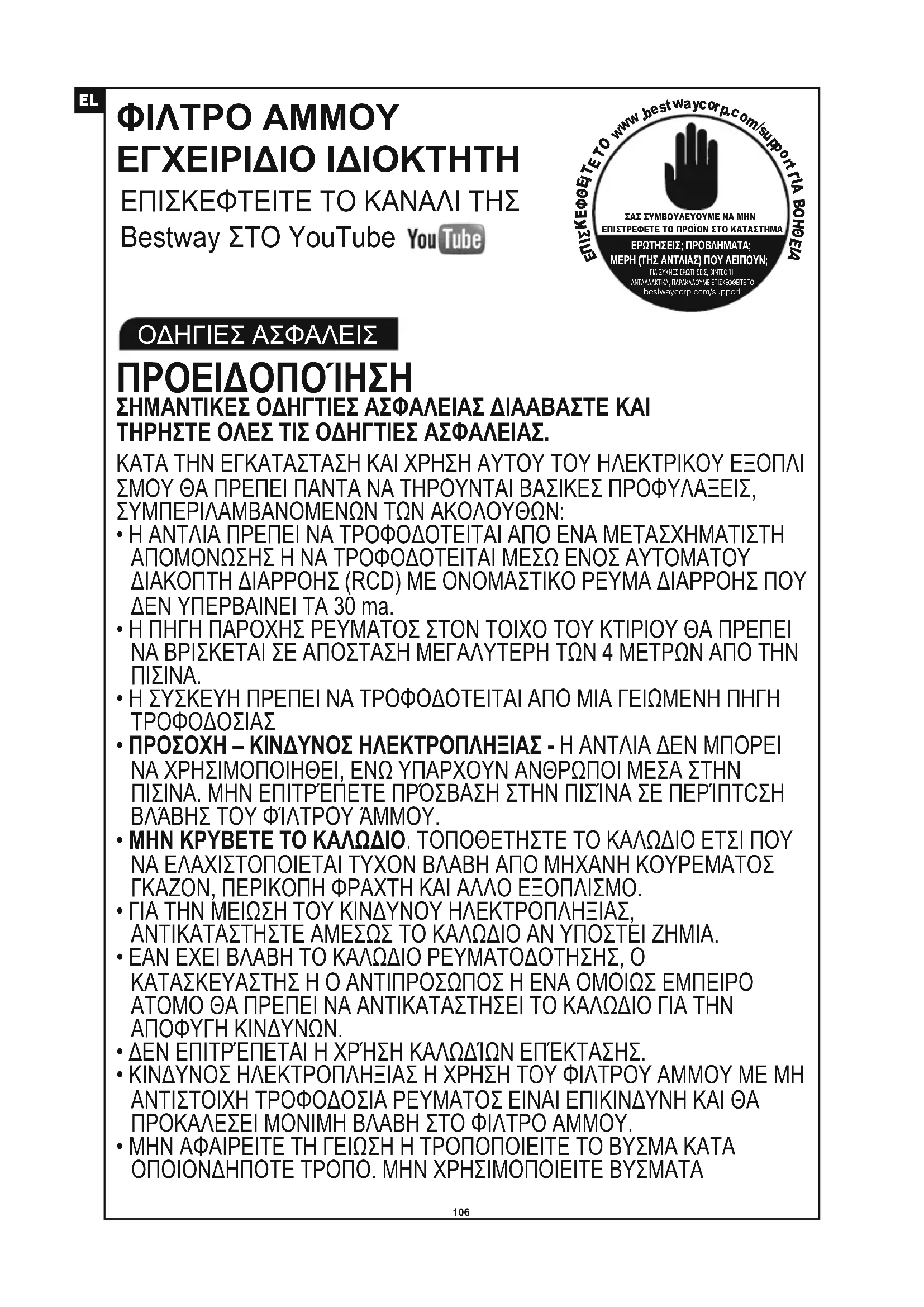 - ΠΡΟΣΟΧΗ – ΚΙΝΔΥΝΟΣ ΗΛΕΚΤΡΟΠΛΗΞΙΑΣ - Η ΑΝΤΛΙΑ ΔΕΝ ΜΠΟΡΕΙ ΝΑ ΧΡΗΣΙΜΟΠΟΙΗΘΕΙ, ΕΝΩ ΥΠΑΡΧΟΥΝ ΑΝΘΡΩΠΟΙ ΜΕΣΑ ΣΤΗΝ ΠΙΣΙΝΑ. ΜΗΝ ΕΠΙΤΡΈΠΕΤΕ ΠΡΌΣΒΑΣΗ ΣΤΗΝ ΠΙΣΊΝΑ ΣΕ ΠΕΡΊΠΤCΣΗ ΒΛΆΒΗΣ ΤΟΥ ΦΊΛΤΡΟΥ ΆΜΜΟΥ.• ΜΗΝ ΚΡΥΒΕΤΕ ΤΟ ΚΑΛΩΔΙΟ. ΤΟΠΟΘΕΤΗΣΤΕ ΤΟ ΚΑΛΩΔΙΟ ΕΤΣΙ ΠΟΥ ΝΑ ΕΛΑΧΙΣΤΟΠΟΙΕΤΑΙ ΤΥΧΟΝ ΒΛΑΒΗ ΑΠΟ ΜΗΧΑΝΗ ΚΟΥΡΕΜΑΤΟΣ ΓΚΑΖΟΝ, ΠΕΡΙΚΟΠΗ ΦΡΑΧΤΗ ΚΑΙ ΑΛΛΟ ΕΞΟΠΛΙΣΜΟ.• ΓΙΑ ΤΗΝ ΜΕΙΩΣΗ ΤΟΥ ΚΙΝΔΥΝΟΥ ΗΛΕΚΤΡΟΠΛΗΞΙΑΣ, ΑΝΤΙΚΑΤΑΣΤΗΣΤΕ ΑΜΕΣΩΣ ΤΟ ΚΑΛΩΔΙΟ ΑΝ ΥΠΟΣΤΕΙ ΖΗΜΙΑ.• ΕΑΝ ΕΧΕΙ ΒΛΑΒΗ ΤΟ ΚΑΛΩΔΙΟ ΡΕΥΜΑΤΟΔΟΤΗΣΗΣ, Ο ΚΑΤΑΣΚΕΥΑΣΤΗΣ Η Ο ΑΝΤΙΠΡΟΣΩΠΟΣ Η ΕΝΑ ΟΜΟΙΩΣ ΕΜΠΕΙΡΟ ΑΤΟΜΟ ΘΑ ΠΡΕΠΕΙ ΝΑ ΑΝΤΙΚΑΤΑΣΤΗΣΕΙ ΤΟ ΚΑΛΩΔΙΟ ΓΙΑ ΤΗΝ ΑΠΟΦΥΓΗ ΚΙΝΔΥΝΩΝ.• ΔΕΝ ΕΠΙΤΡΈΠΕΤΑΙ Η ΧΡΉΣΗ ΚΑΛΩΔΊΩΝ ΕΠΈΚΤΑΣΗΣ.• ΚΙΝΔΥΝΟΣ ΗΛΕΚΤΡΟΠΛΗΞΙΑΣ Η ΧΡΗΣΗ ΤΟΥ ΦΙΛΤΡΟΥ ΑΜΜΟΥ ΜΕ ΜΗ ΑΝΤΙΣΤΟΙΧΗ ΤΡΟΦΟΔΟΣΙΑ ΡΕΥΜΑΤΟΣ ΕΙΝΑΙ ΕΠΙΚΙΝΔΥΝΗ ΚΑΙ ΘΑ ΠΡΟΚΑΛΕΣΕΙ ΜΟΝΙΜΗ ΒΛΑΒΗ ΣΤΟ ΦΙΛΤΡΟ ΑΜΜΟΥ.• ΜΗΝ ΑΦΑΙΡΕΙΤΕ ΤΗ ΓΕΙΩΣΗ Η ΤΡΟΠΟΠΟΙΕΙΤΕ ΤΟ ΒΥΣΜΑ ΚΑΤΑ ΟΠΟΙΟΝΔΗΠΟΤΕ ΤΡΟΠΟ. ΜΗΝ ΧΡΗΣΙΜΟΠΟΙΕΙΤΕ ΒΥΣΜΑΤΑ ΠΡΟΣΑΡΜΟΓΕΑ. ΣΥΜΒΟΥΛΕΥΤΕΙΤΕ ΕΝΑΝ ΕΜΠΕΙΡΟ ΗΛΕΚΤΡΟΛΟΓΟ ΓΙΑ ΟΠΟΙΑΔΗΠΟΤΕ ΕΡΩΤΗΣΗ ΣΧΕΤΙΚΑ ΜΕ ΤΗΝ ΕΓΚΥΡΟΤΗΤΑ ΤΩΝ ΒΥΣΜΑΤΩΝ Ω ΤΗΣ ΓΕΙΩΣΗΣ ΣΑΣ.