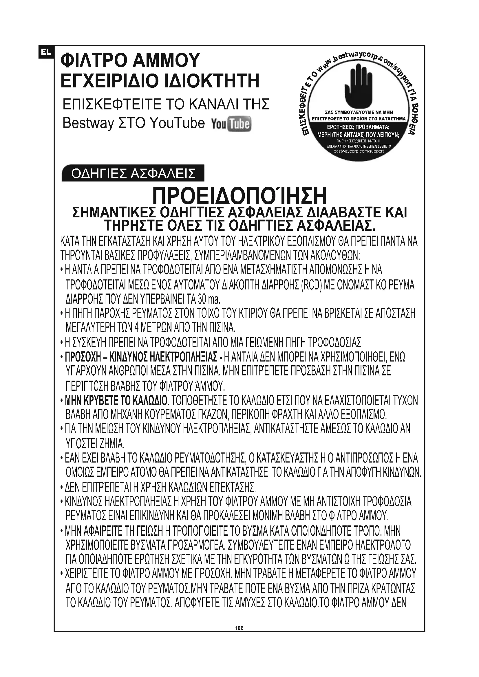 - ΕΆΝ ΧΆΣΕΤΕ ΤΙΣ ΟΔΗΓΊΕΣ, ΠΑΡΑΚΑΛΟΎΜΕ ΕΠΙΚΟΙΝΩΝΉΣΤΕ ΜΕ ΤΗΝ BESTWAY Ή ΑΝΑΖΗΤΉΣΤΕ
