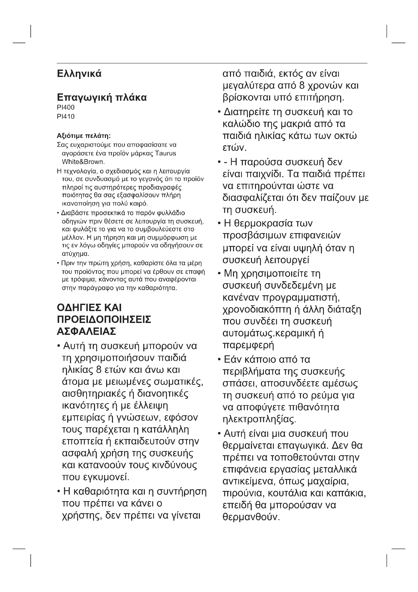 Το παρόν προϊόν συμμορφώνεται με την οδηγία 2014/35/ΕΚ χαμηλής τάσης, με την οδηγία 2014/30/ΕΚ για την ηλεκτρομαγνητική συμβατότητα, με την οδηγία 2011/65/ΕΕ για τον περιορισμό της χρήσης ορισμένων επικίνδυνων ουσιών σε ηλεκτρικό και ηλεκτρονικό εξοπλισμό και με την οδηγία 2009/125/ΕΚ για τις απαιτήσεις οικολογικού σχεδιασμού όσον αφορά τα συνδεόμενα με την ενέργεια προϊόντα.Русский Индукционная плита PI400 PI410 Уважаемый клиент! Благодарим за выбор аппарата торговой марки Taurus White&Brown Он выполнен по современной технологии, имеет удачную конструкцию и превышает наиболее требовательные стандарты качества, что обеспечит полное соответствие вашим требованиям и продолжительный срок