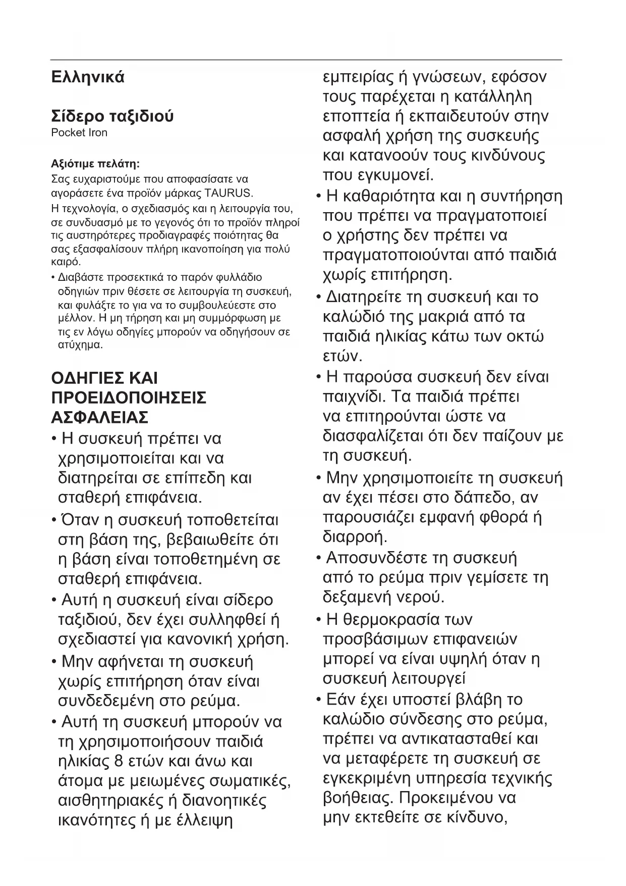 Pocket Iron - σιδερώστρα TAURUS - Δωρεάν εγχειρίδιο χρήσης