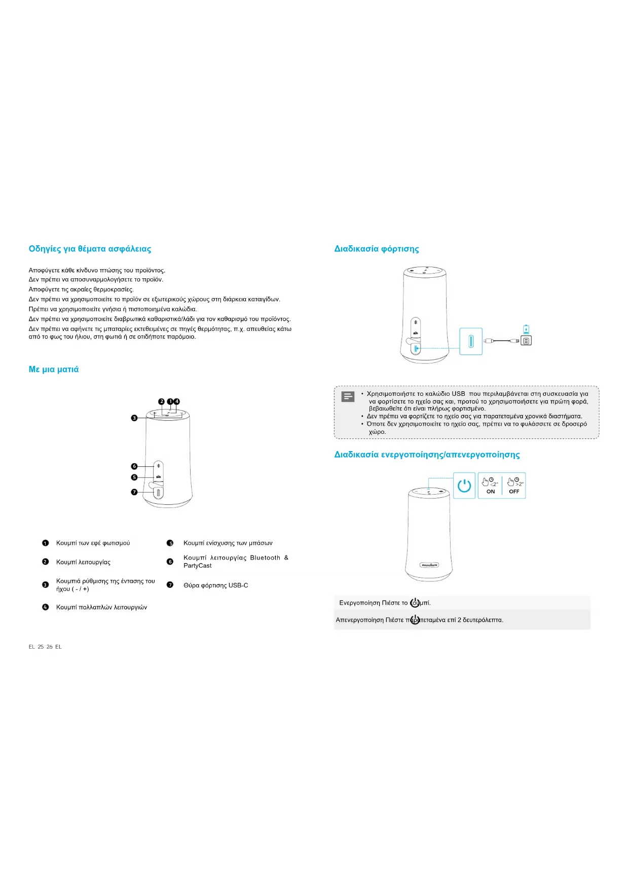 Drücken Ausschalten >2” 2 Sekunden lang gedrückt halten Soundcore App Laden Sie die Soundcore App herunter, um Lichteffekte, EQ-Einstellungen, Firmware-Updates usw. zu erhalten. Soundcore Apple and the Apple logo are trademarksof Apple Inc.Google Play and the Google Play logo are trademarks of Google Inc. Technische Daten Änderungen der technischen Daten sind ohne Vorankündigung vorbehalten. Eingang 5 V 2 A Nennausgangsleistung 2 x 10 W Akkukapazität 2600 mAh, 7,4 V Ladedauer 3,5 Stunden Wiedergabedauer (je nach Lautstärke und Inhalt) 12 Stunden Frequenzgang 50 Hz - 20 kHz Bluetooth-Version V 5.0 Bluetooth-Reichweite 20 mEL 25 26 EL Οδηγίες για θέματα ασφάλειας Αποφύγετε κάθε κίνδυνο πτώσης του προϊόντος. Δεν πρέπει να αποσυναρμολογήσετε το προϊόν. Αποφύγετε τις ακραίες θερμοκρασίες. Δεν πρέπει να χρησιμοποιείτε το προϊόν σε εξωτερικούς χώρους στη διάρκεια καταιγίδων. Πρέπει να χρησιμοποιείτε γνήσια ή πιστοποιημένα καλώδια. Δεν πρέπει να χρησιμοποιείτε διαβρωτικά καθαριστικά/λάδι για τον καθαρισμό του προϊόντος. Δεν πρέπει να αφήνετε τις μπαταρίες εκτεθειμένες σε πηγές θερμότητας, π.χ. απευθείας κάτω από το φως του ήλιου, στη φωτιά ή σε οτιδήποτε παρόμοιο. Με μια ματιά