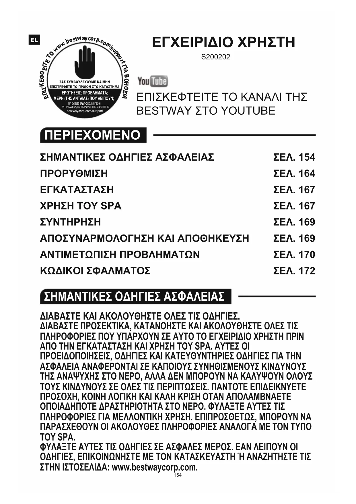 - ΠΟΤΕ ΜΗ ΦΟΡΑΤΕ ΤΟΥΣ ΦΑΚΟΥΣ ΕΠΑΦΗΣ ΟΤΑΝ ΒΡΙΣΚΕΣΤΕ ΜΕΣΑ ΣΤΟ SPA. ΚΙΝΔΥΝΟΣ - ΚΙΝΔΥΝΟΣ ΤΡΑΥΜΑΤΙΣΜΟΥ. ΤΑ ΕΞΑΡΤΗΜΑΤΑ ΑΝΑΡΡΟΦΗΣΗΣ ΣΕ ΑΥΤΟ ΤΟ SPA ΕΧΟΥΝ ΜΕΓΕΘΟΣ ΩΣΤΕ ΝΑ ΤΑΙΡΙΑΖΟΥΝ ΜΕ ΤΗ ΣΥΓΚΕΚΡΙΜΕΝΗ ΡΟΗ ΝΕΡΟΥ ΠΟΥ ΔΗΜΙΟΥΡΓΕΙΤΑΙ ΑΠΟ ΤΗΝ ΑΝΤΛΙΑ. ΕΑΝ ΠΡΟΚΥΨΕΙ ΑΝΑΓΚΗ ΑΝΤΙΚΑΤΑΣΤΑΣΗΣ ΤΩΝ ΕΞΑΡΤΗΜΑΤΩΝ ΑΝΑΡΡΟΦΗΣΗΣ Ή ΤΗΣ ΑΝΤΛΙΑΣ, ΒΕΒΑΙΩΘΕΙΤΕ ΟΤΙ ΟΙ ΡΥΘΜΟΙ ΡΟΗΣ ΕΙΝΑΙ ΣΥΜΒΑΤΟΙ. ΠΟΤΕ ΜΗ ΧΡΗΣΙΜΟΠΟΙΕΙΤΕ ΤΟ SPA, ΕΑΝ ΤΑ ΕΞΑΡΤΗΜΑΤΑ ΑΝΑΡΡΟΦΗΣΗΣ ΕΙΝΑΙ ΣΠΑΣΜΕΝΑ Ή ΛΕΙΠΟΥΝ. ΠΟΤΕ ΜΗΝ ΑΝΤΙΚΑΘΙΣΤΑΤΕ ΕΝΑ ΕΞΑΡΤΗΜΑ ΑΝΑΡΡΟΦΗΣΗΣ ΜΕ ΕΝΑ ΜΕ ΜΙΚΡΟΤΕΡΟ ΡΥΘΜΟ ΑΠΟ ΤΟΝ ΡΥΘΜΟ ΡΟΗΣ ΠΟΥ ΑΝΑΓΡΑΦΕΤΑΙ ΣΤΟ ΑΡΧΙΚΟ ΕΞΑΡΤΗΜΑ ΑΝΑΡΡΟΦΗΣΗΣ. ΠΡΟΣΟΧΗ: ΜΕΤΑ ΤΗ ΧΡΗΣΗ ΤΟΥ SPA ΓΙΑ 3-5 ΧΡΟΝΙΑ, ΓΙΑ ΝΑ ΔΙΑΣΦΑΛΙΣΕΤΕ ΤΗΝ ΑΣΦΑΛΕΙΑ ΚΑΙ ΤΗΝ ΑΠΟΔΟΣΗ ΤΟΥ SPA, ΤΑ ΚΥΡΙΑ ΕΞΑΡΤΗΜΑΤΑ, ΟΠΩΣ ΤΟ ΘΕΡΜΑΝΤΙΚΟ ΣΤΟΙΧΕΙΟ, ΤΟ ΜΟΤΕΡ ΦΥΣΗΤΗΡΑ ΑΕΡΟΣ ΚΑΙ ΟΙ ΒΑΛΒΙΔΕΣ ΑΝΤΕΠΙΣΤΡΟΦΗΣ ΠΡΕΠΕΙ ΝΑ ΕΛΕΓΧΘΟΥΝ ΑΠΟ ΕΠΑΓΓΕΛΜΑΤΙΑ ΗΛΕΚΤΡΟΛΟΓΟ. ΕΑΝ Ο ΗΛΕΚΤΡΟΛΟΓΟΣ ΕΝΤΟΠΙΣΕΙ ΠΡΟΒΛΗΜΑΤΑ ΚΑΤΑ ΤΟΝ ΕΛΕΓΧΟ, ΕΠΙΣΚΕΦΘΕΙΤΕ ΤΗΝ ΙΣΤΟΣΕΛΙΔΑ ΜΑΣ www.bestwaycorp.com ΓΙΑ ΝΑ ΛΑΒΕΤΕ ΤΙΣ ΑΠΑΡΑΙΤΗΤΕΣ ΠΛΗΡΟΦΟΡΙΕΣ. ΠΡΟΕΙΔΟΠΟΙΗΣΕΙΣ – ΑΣΦΑΛΕΙΑ ΜΗ ΚΟΛΥΜΒΗΤΩΝ