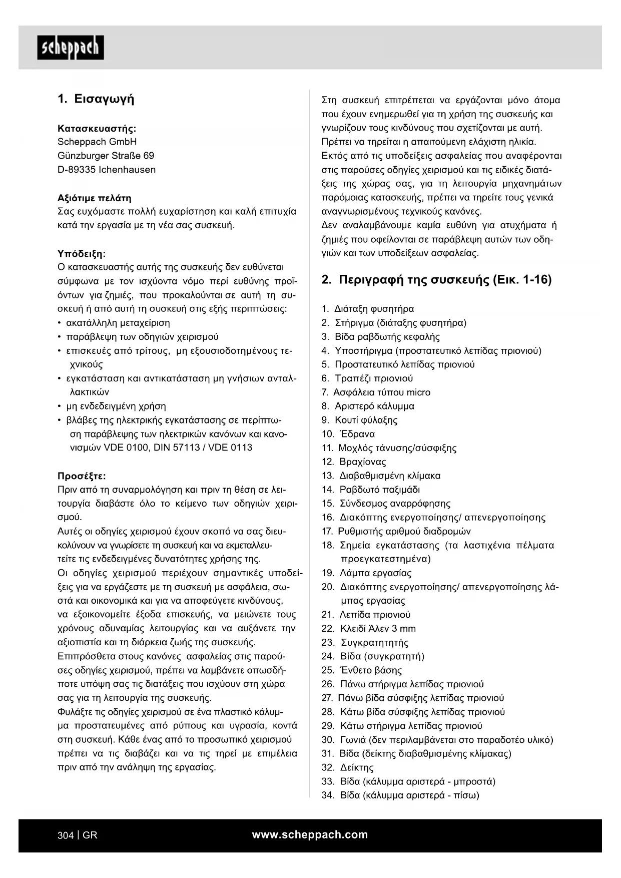 Κατασκευαστής: Scheppach GmbH Günzburger Straße 69 D-89335 Ichenhausen Αξιότιμε πελάτη Σας ευχόμαστε πολλή ευχαρίστηση και καλή επιτυχία κατά την εργασία με τη νέα σας συσκευή.